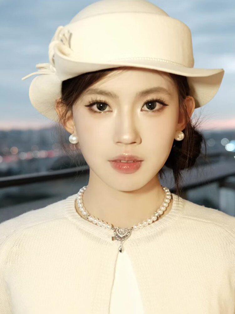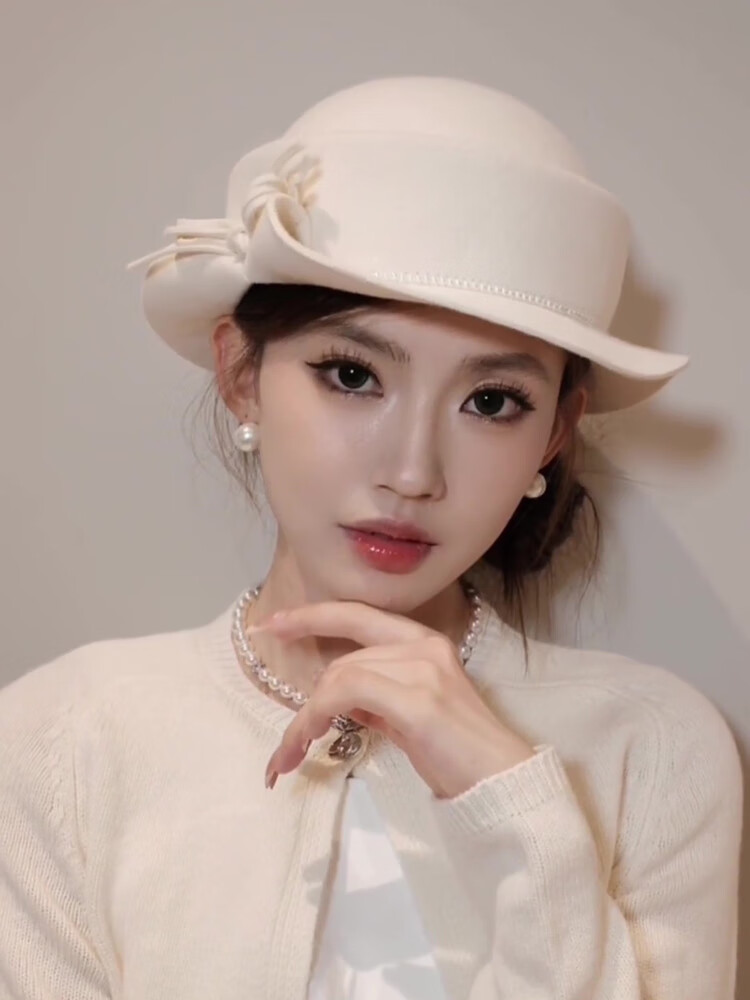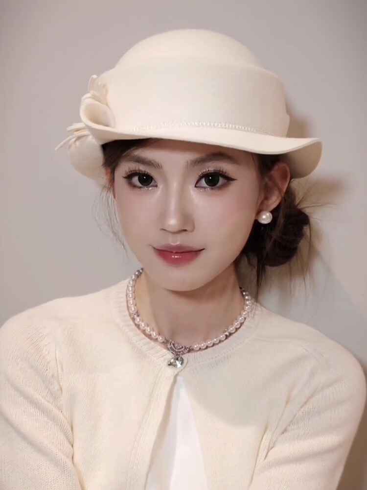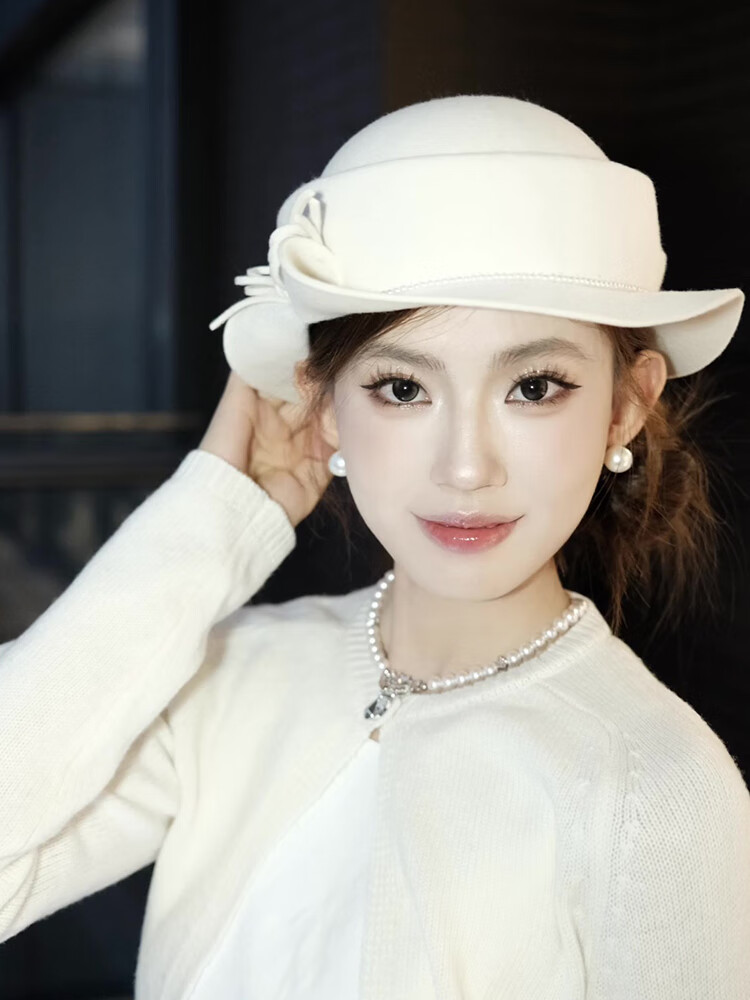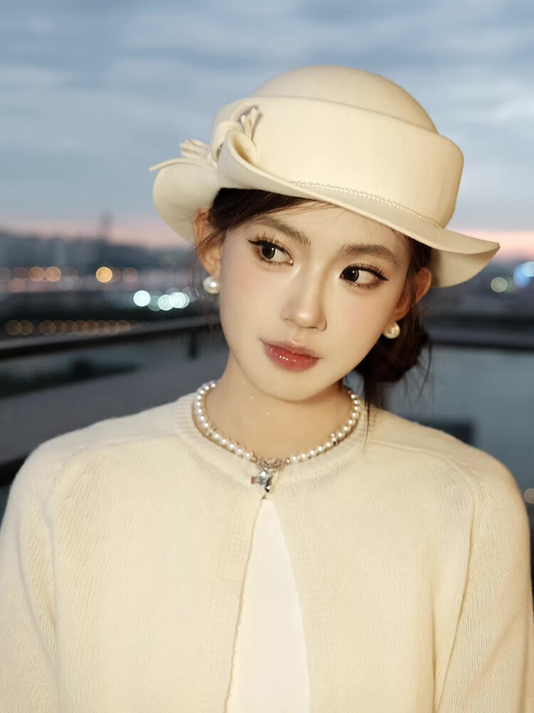 Poetry style bow curly edge top hat for women with autumn and winter style, slimming fisherman hat with round face, ivory white, pearl style M (56-58cm)
