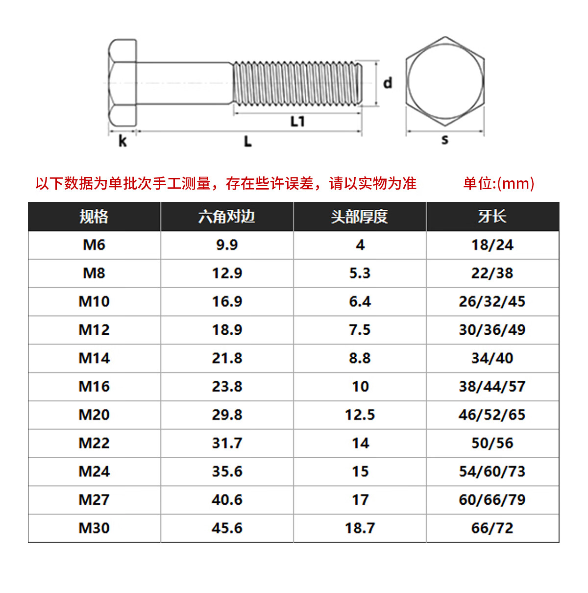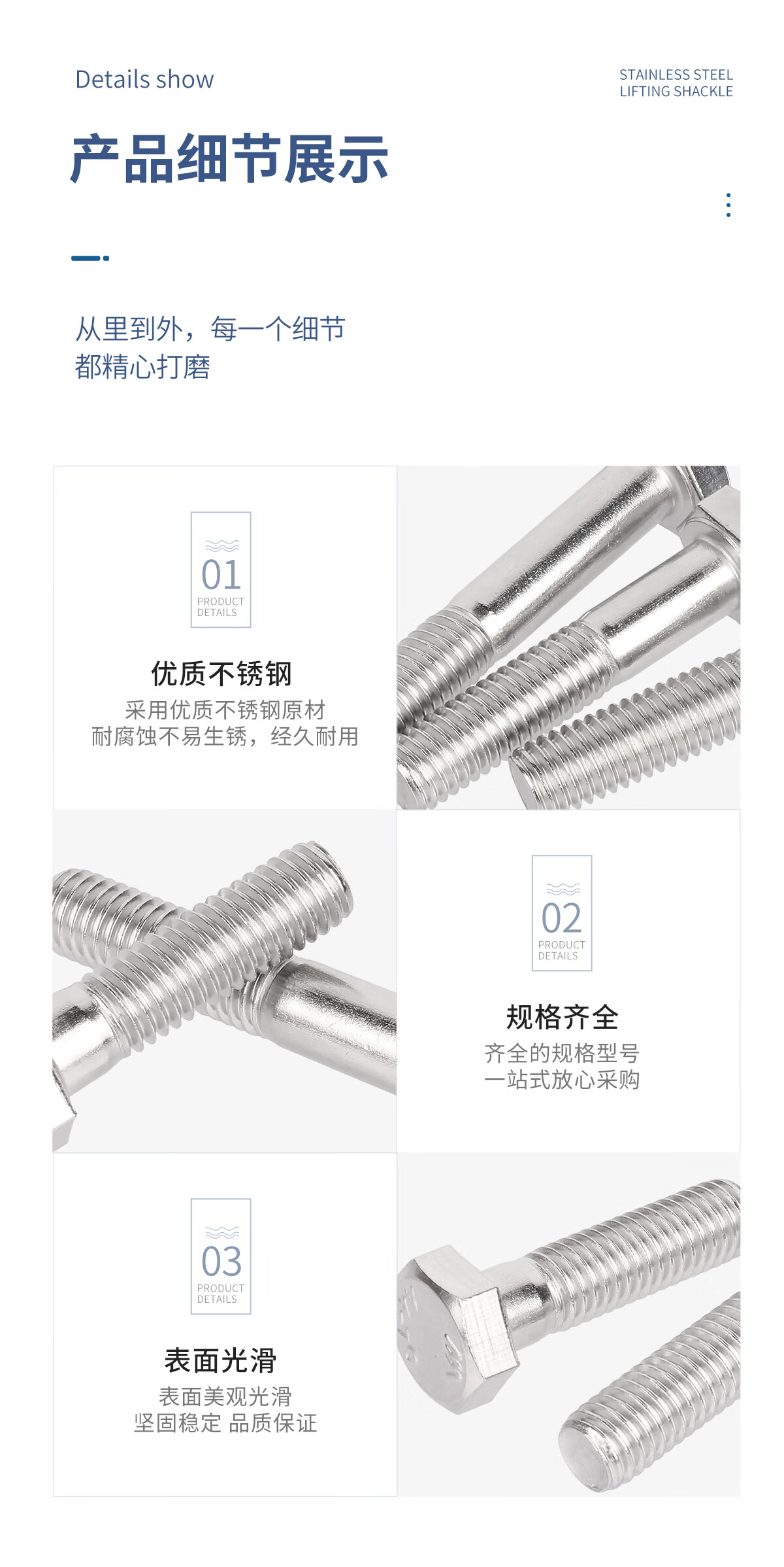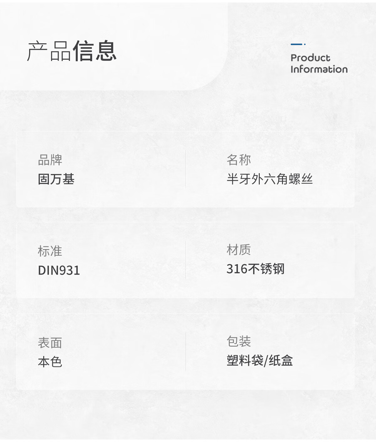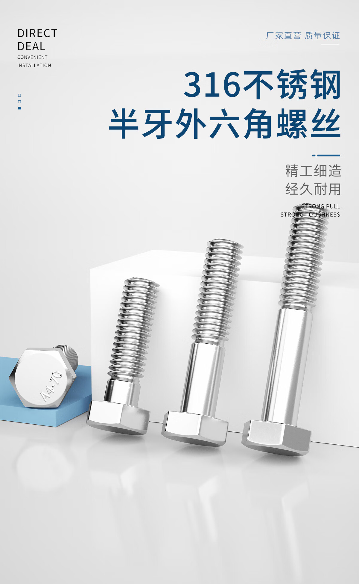 Guwanji 316 stainless steel half-thread external hexagon head bolt DIN931 screw extension screw M6M8M10M12-M30 M6x60 (10 pieces)