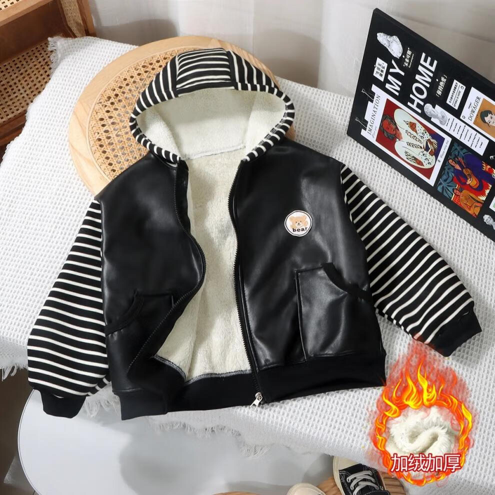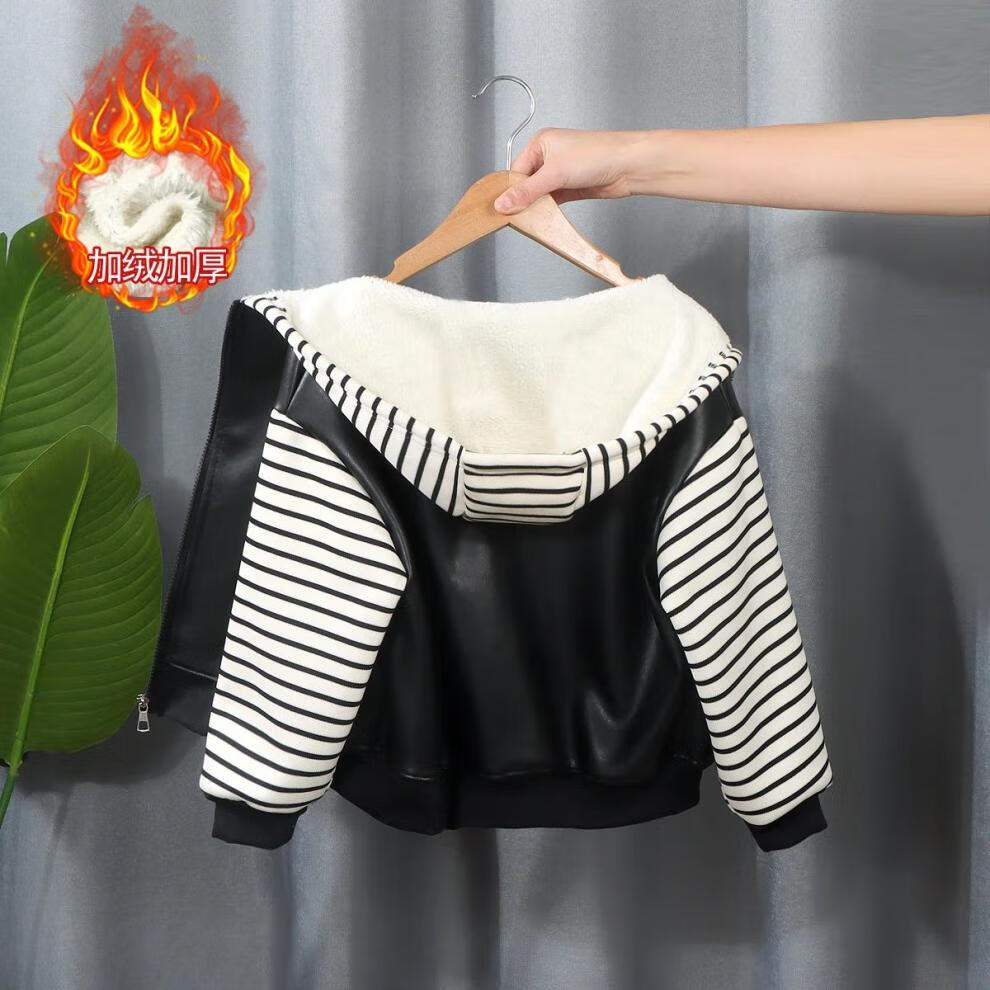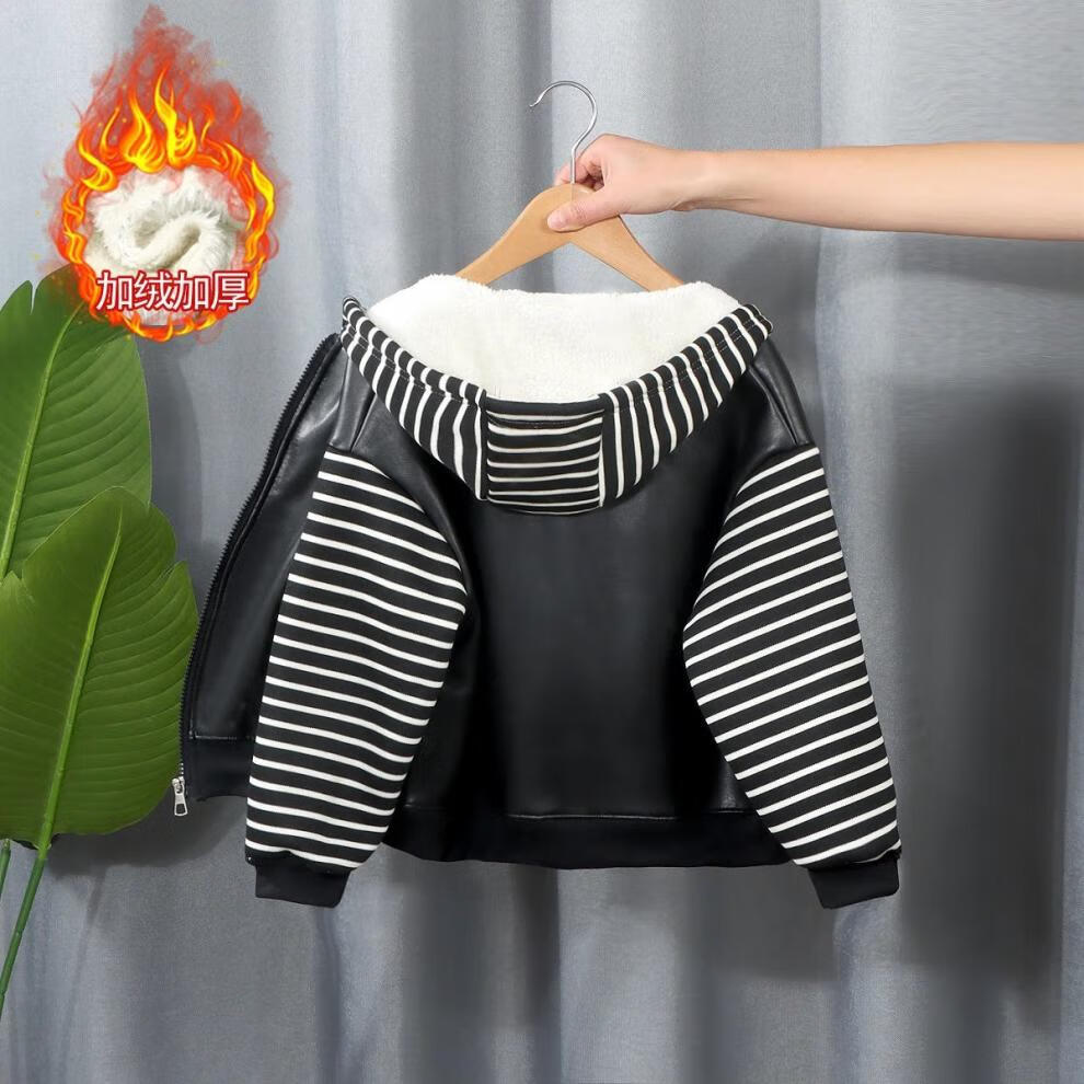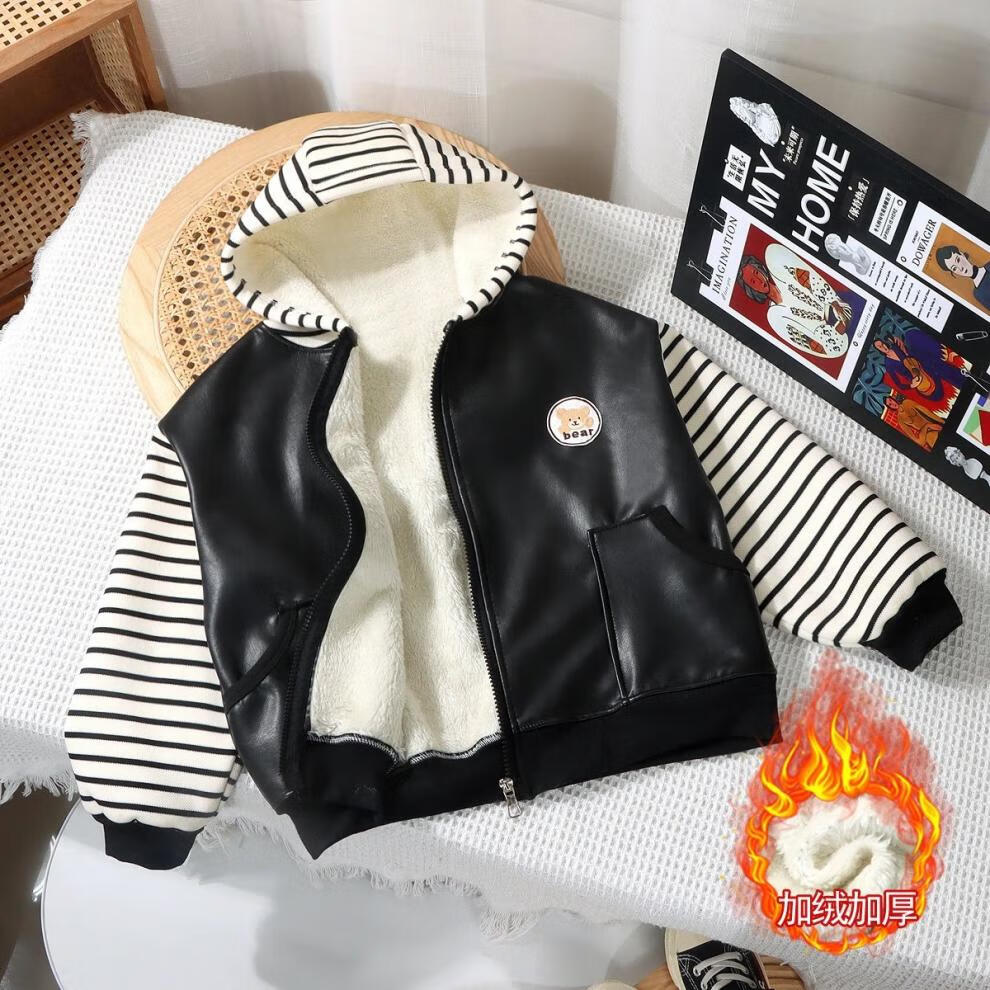 Disney (Disney) children's leather jacket and velvet jacket, boys' handsome jacket, baby's autumn and winter new Korean style top leather jacket, velvet leather jacket - white stripes 130 cm
