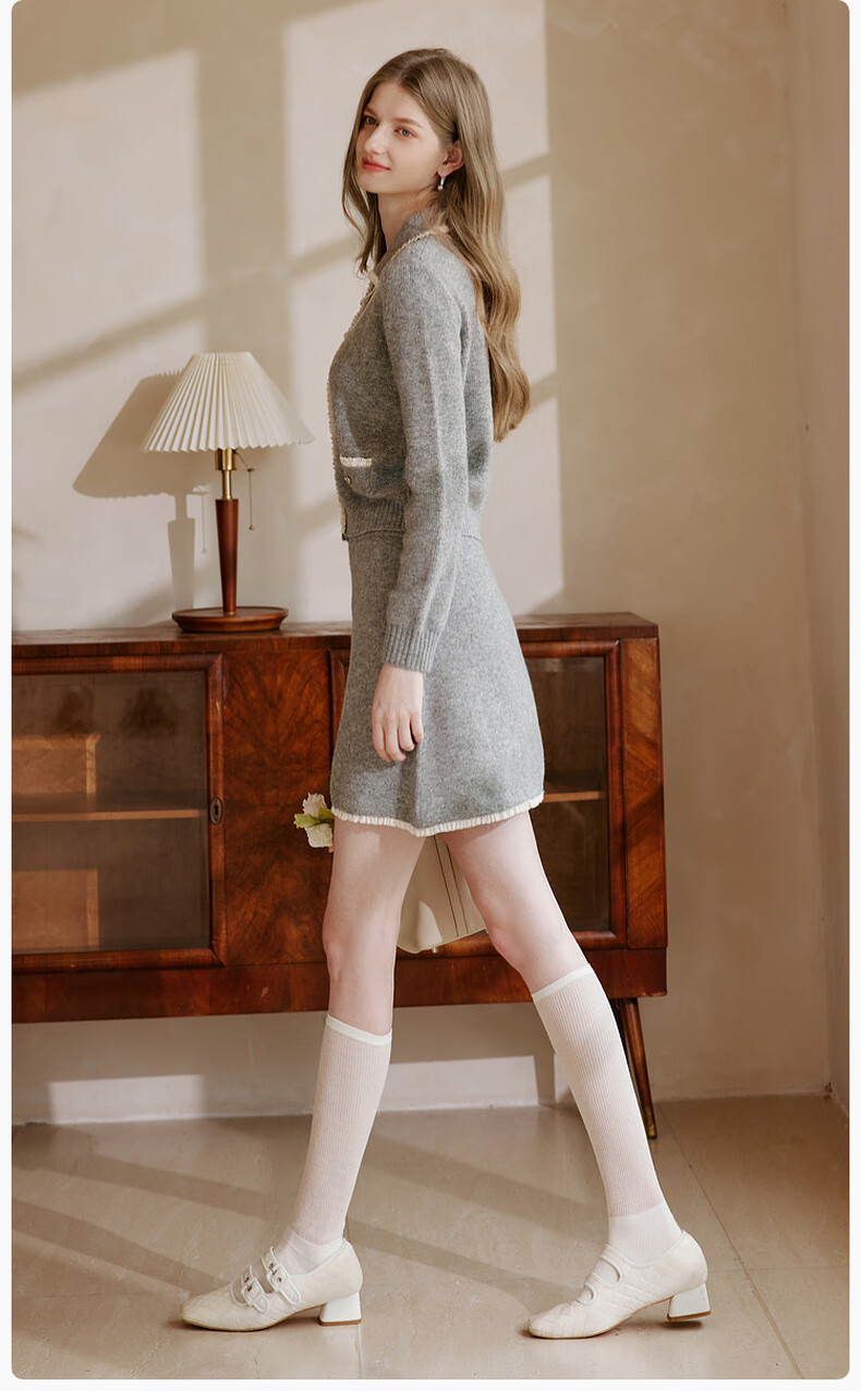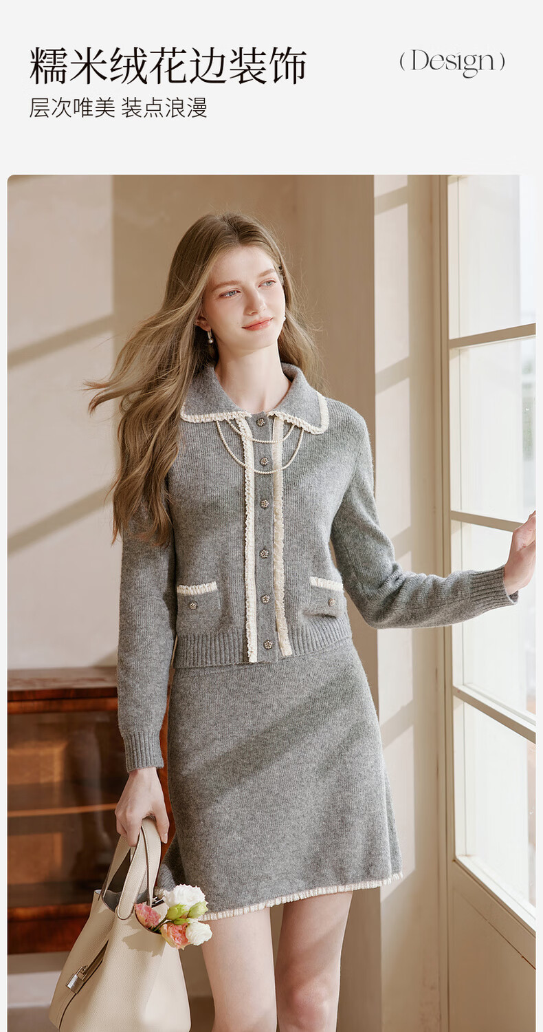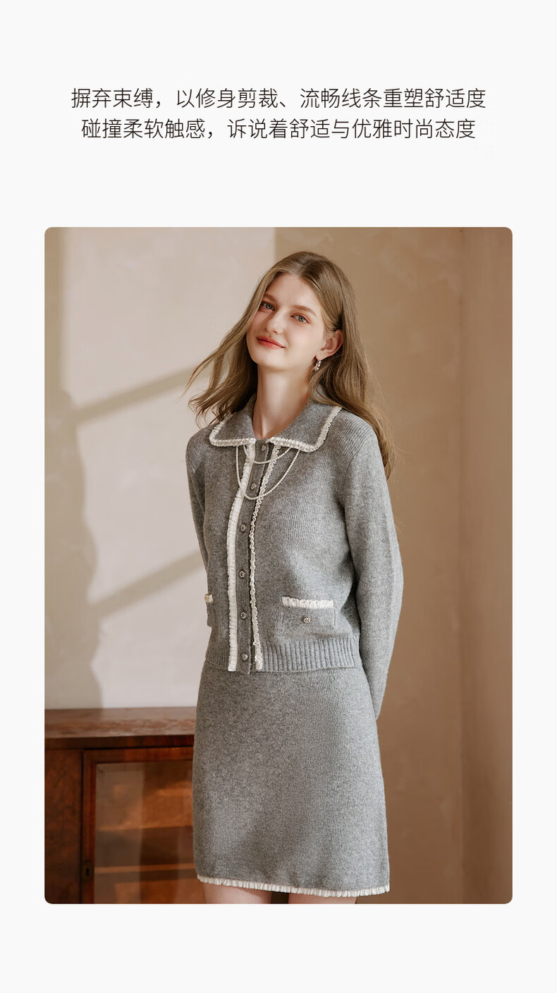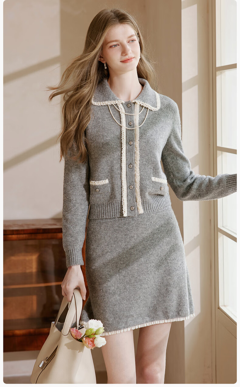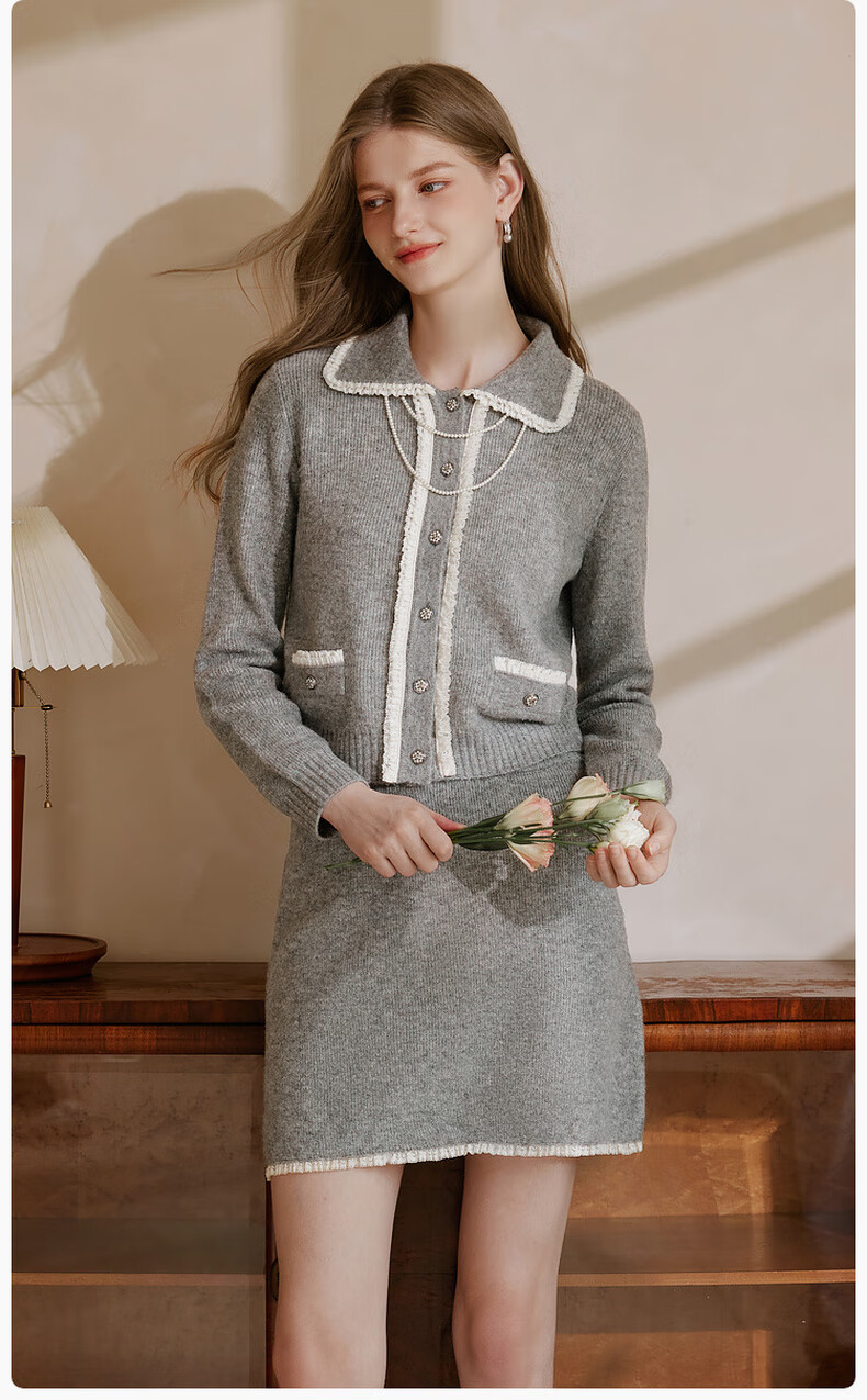 Xiangying Xiaoxiangfeng gray knitted suit skirt for women 2025 winter new style including wool cardigan miu series two-piece set light gray L