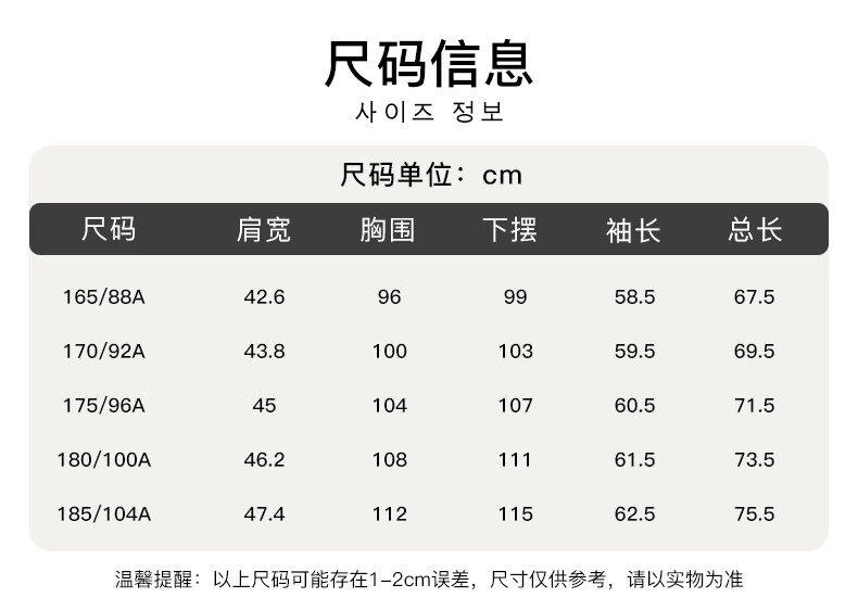 China (cm) 165 / 88-90 170 / 96-98 175 / 108-110 180 / 118-122 185 / 126-130
