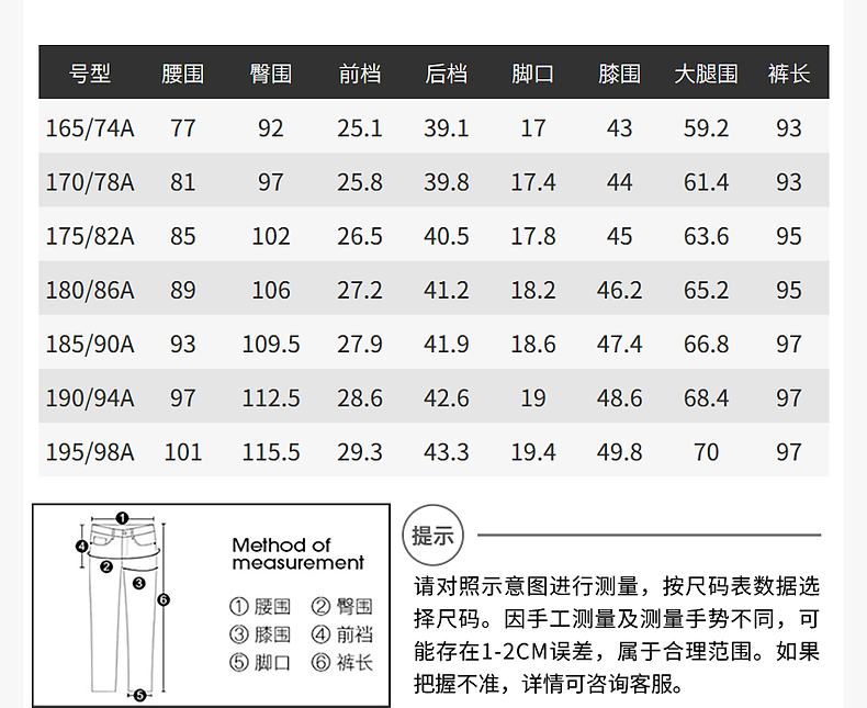 Outseam (cm) 99 cm 101.5 cm 104 cm 106.5 cm 109 cm