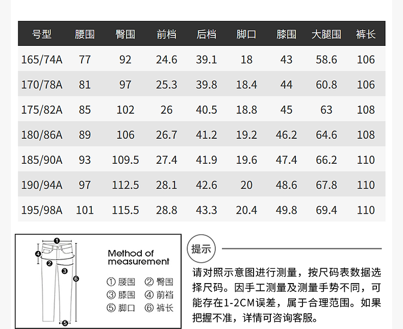 Outseam (cm) 99 cm 101.5 cm 104 cm 106.5 cm 109 cm