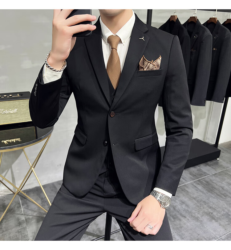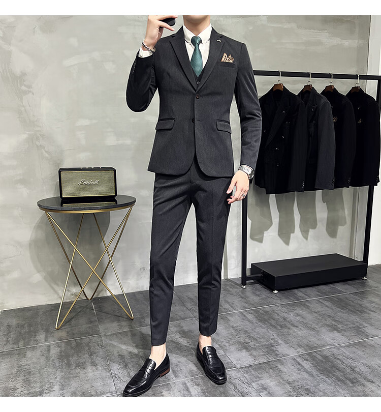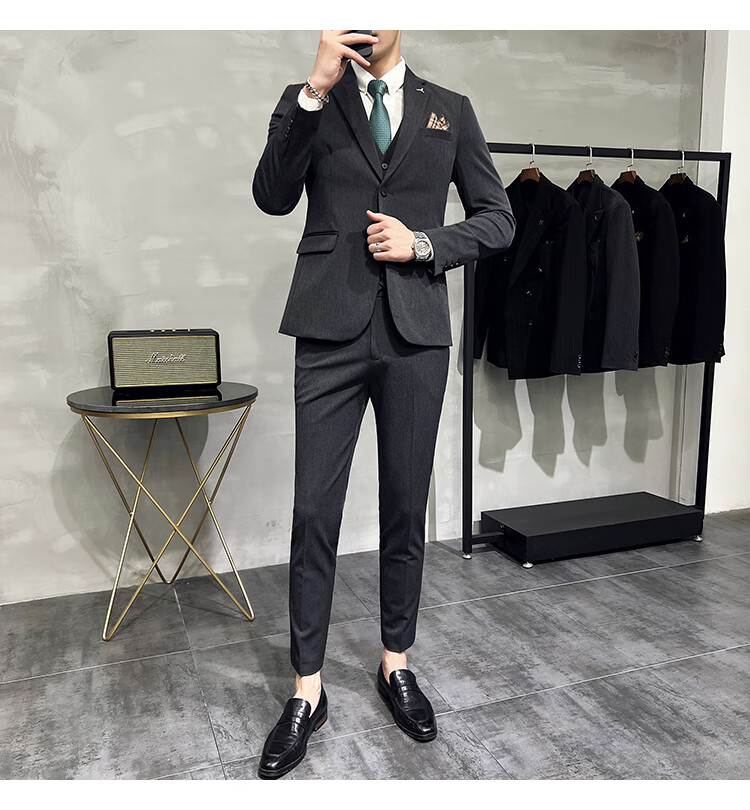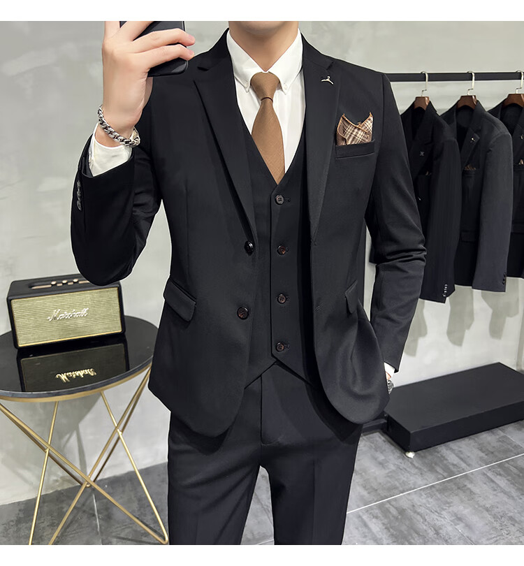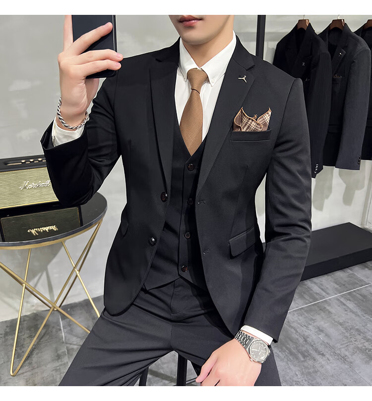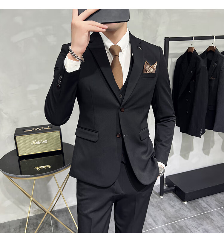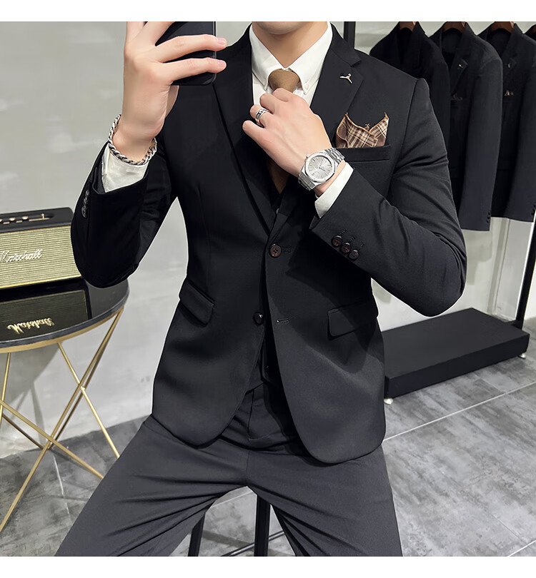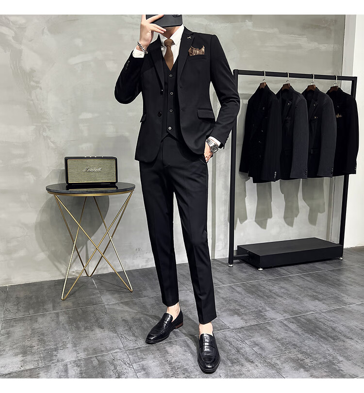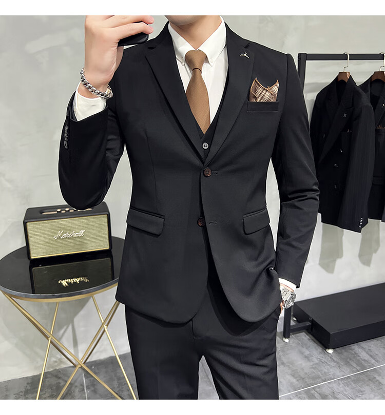 Pierre Cardin business casual single-breasted suit suit groom Korean style men's slim double slit small suit lapel collar formal suit black suit + trousers + vest free black tie XL