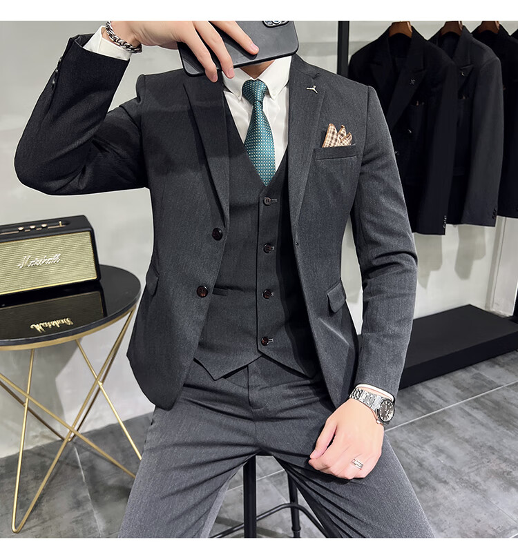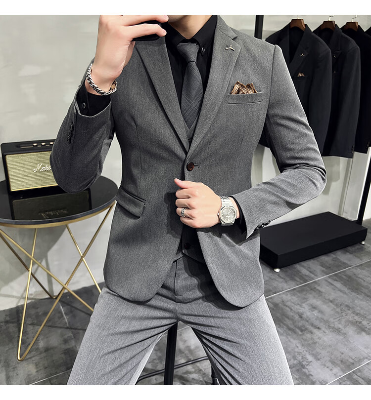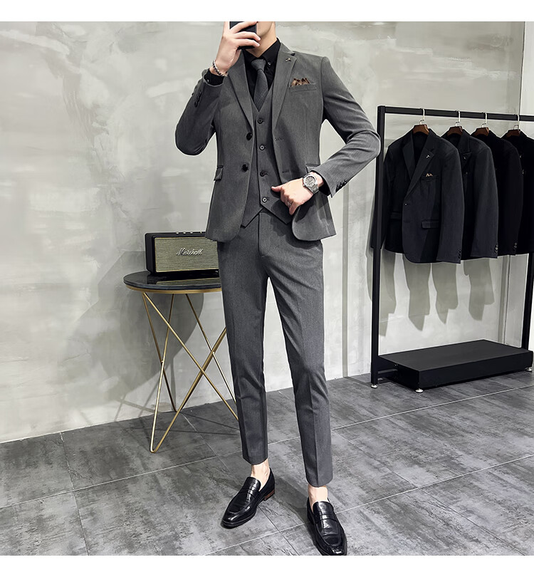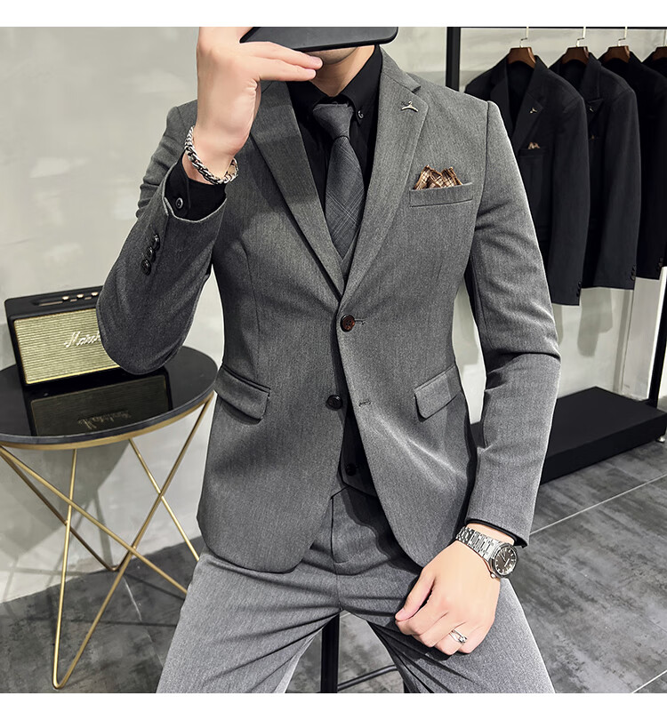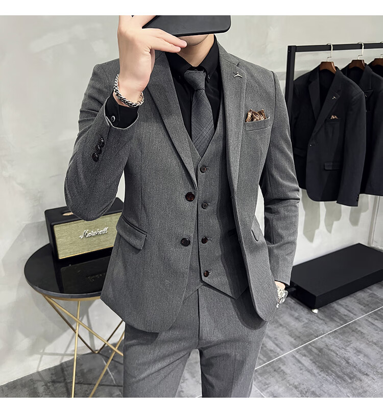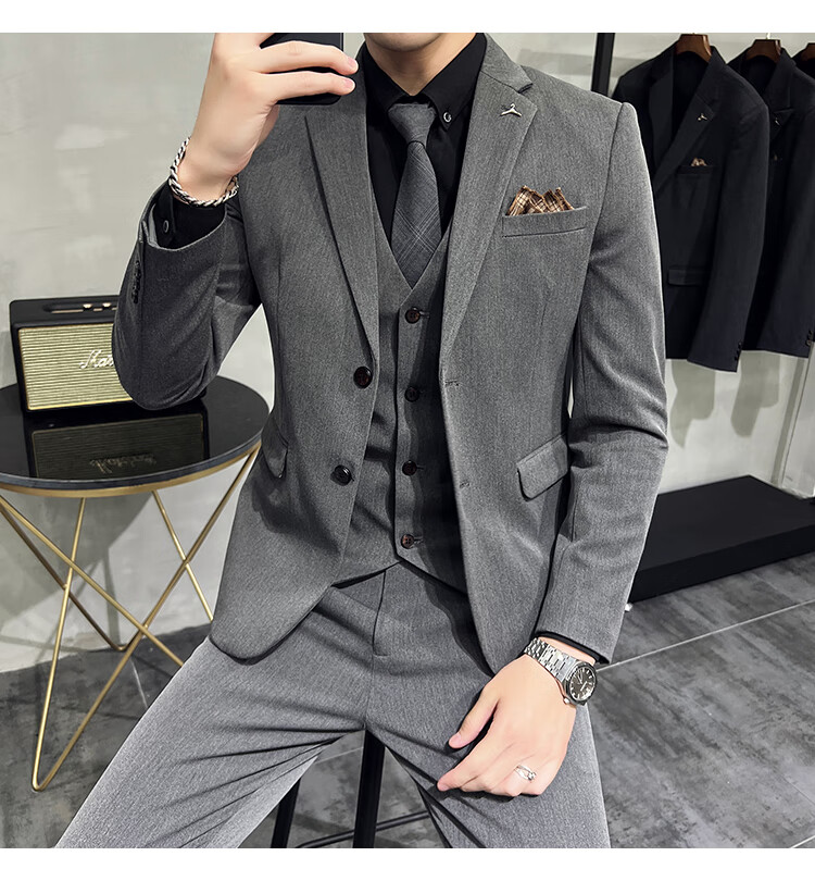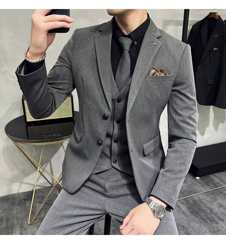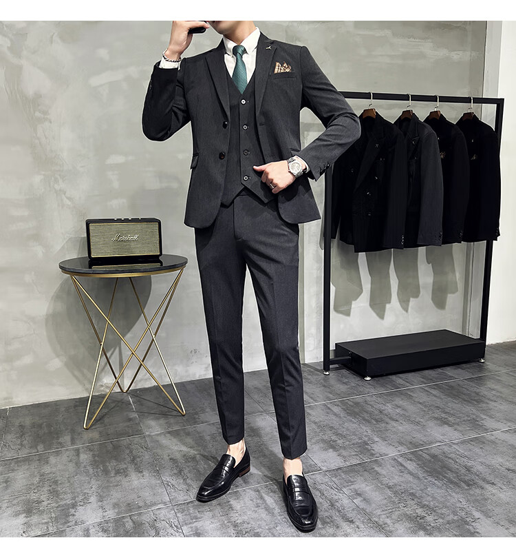 Pierre Cardin business casual single-breasted suit suit groom Korean style men's slim double slit small suit lapel collar formal suit black suit + trousers + vest free black tie XL