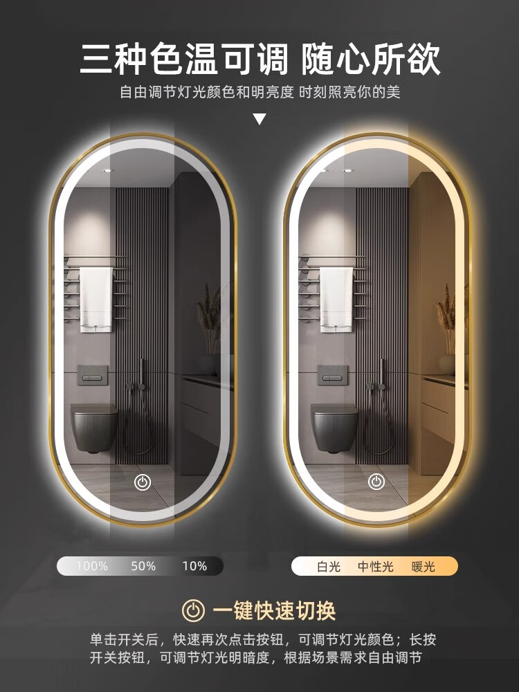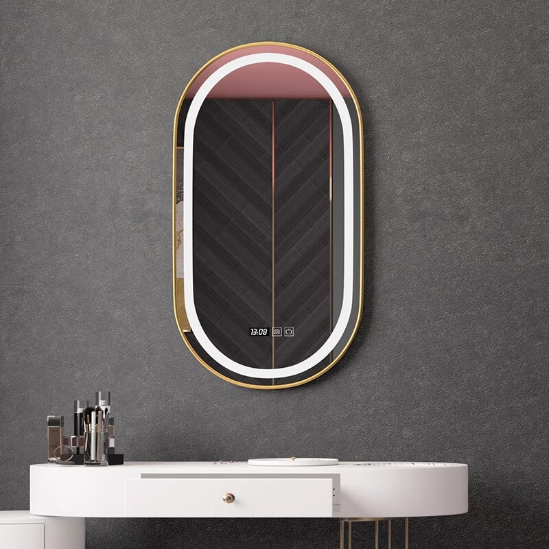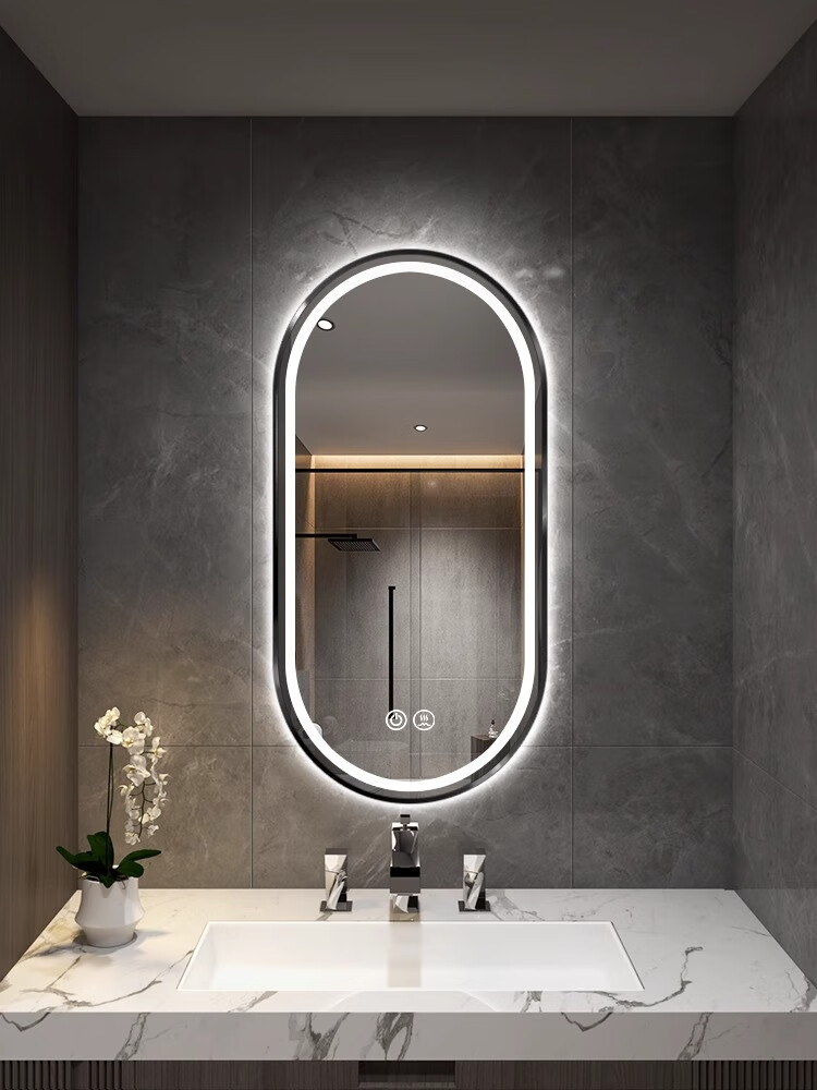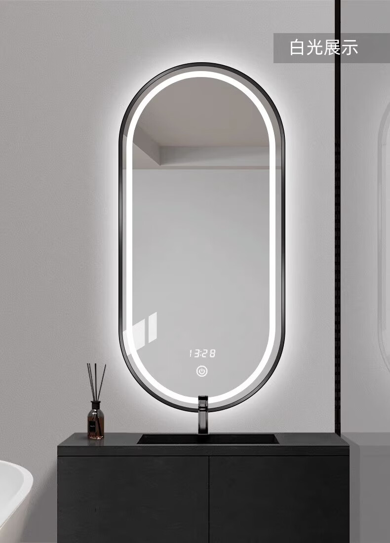 Aluminum alloy frame long round runway smart mirror hotel bathroom wall-mounted touch screen LED light illuminated cosmetic mirror elegant black + white light + defog + time temperature 50x100 cm