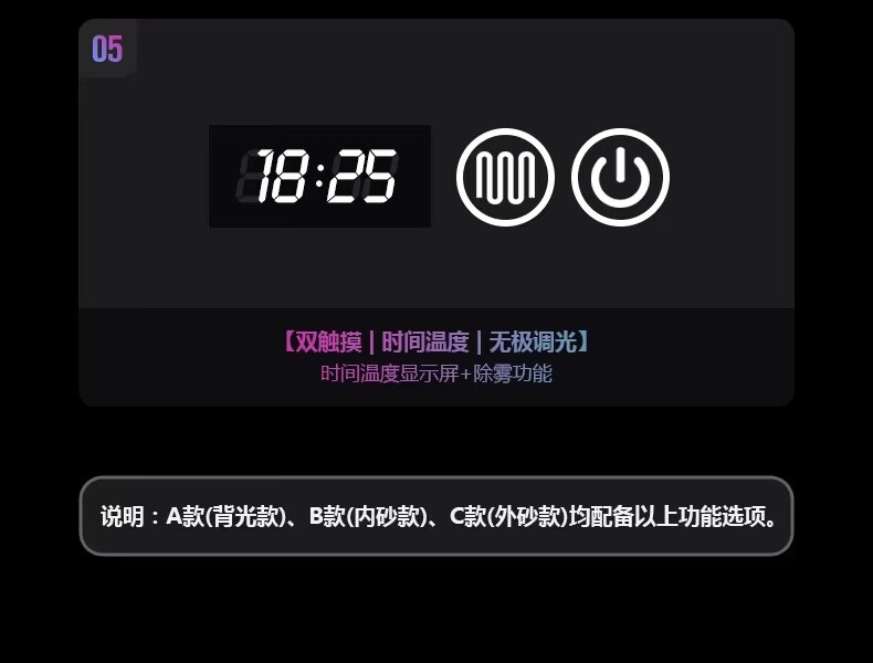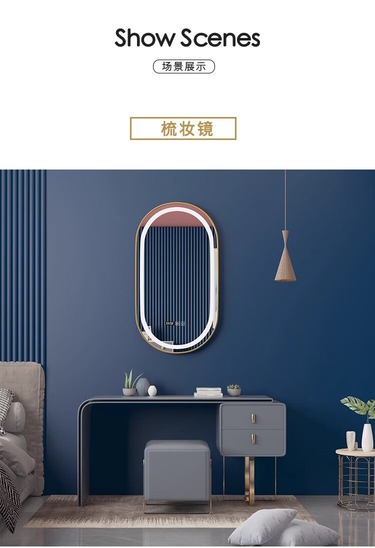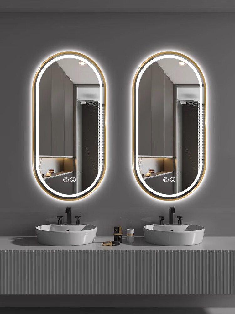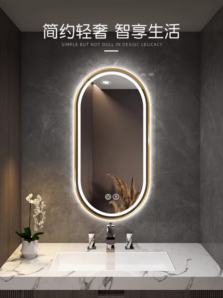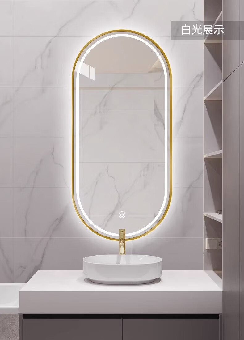 Aluminum alloy frame long round runway smart mirror hotel bathroom wall-mounted touch screen LED light illuminated cosmetic mirror elegant black + white light + defog + time temperature 50x100 cm