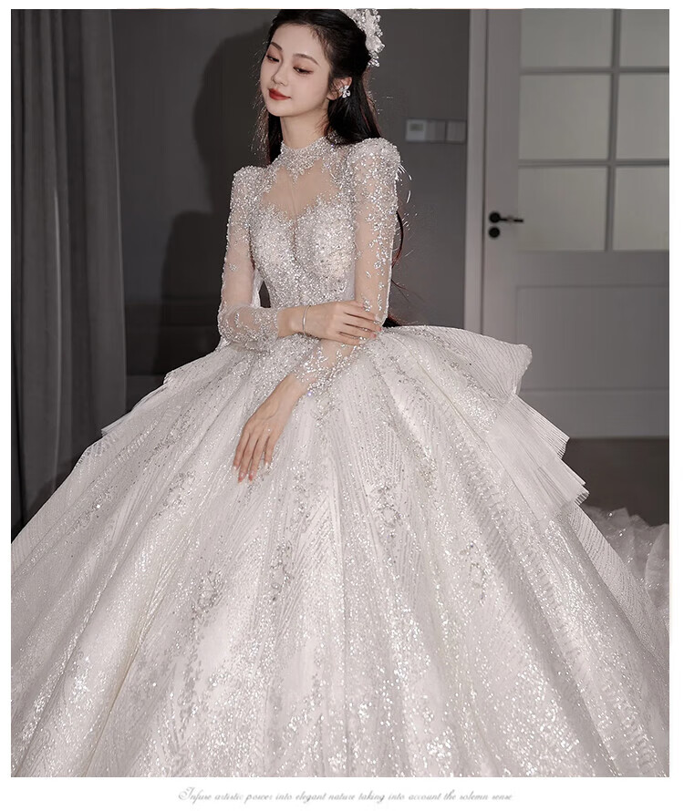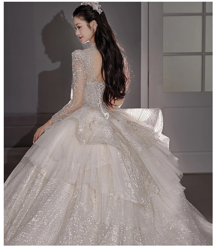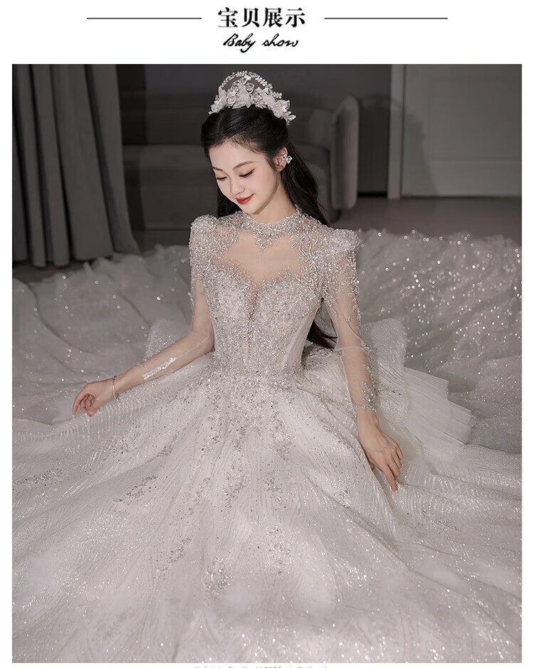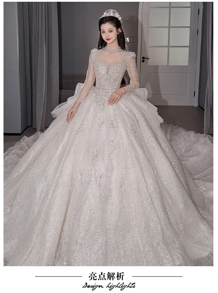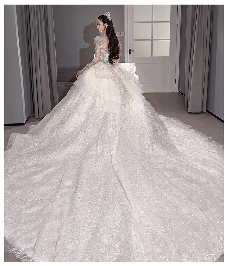 Flashing Girl (SHANDONGSHAONV) wedding dress bridal main yarn heavy industry high-definition tail new heavy industry French style going out main yarn texture large tail White floor-length style + random small M Weight 100Jin Jin is equal to about 0.5 kg