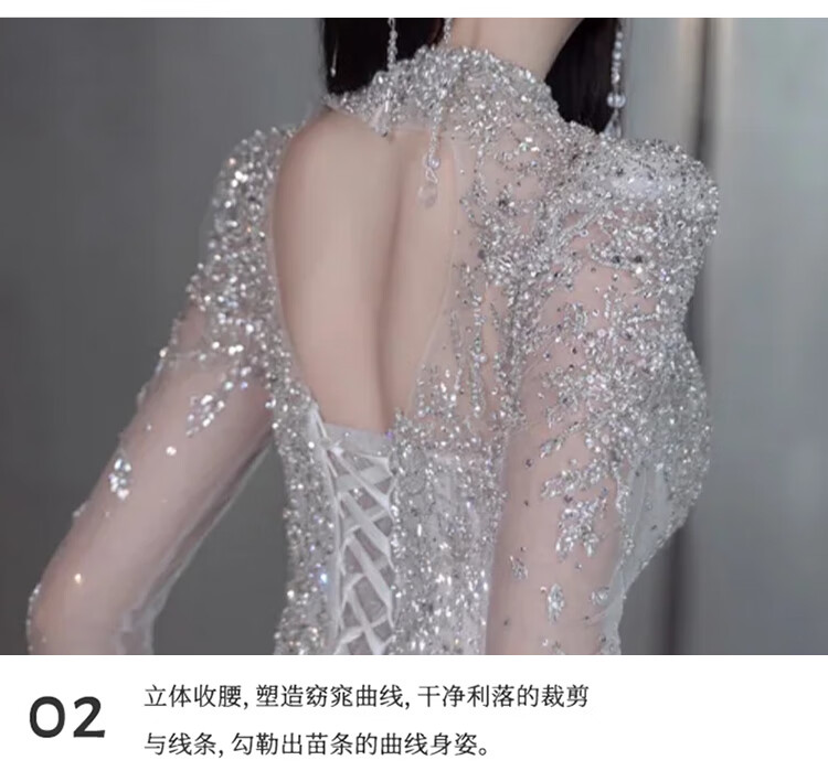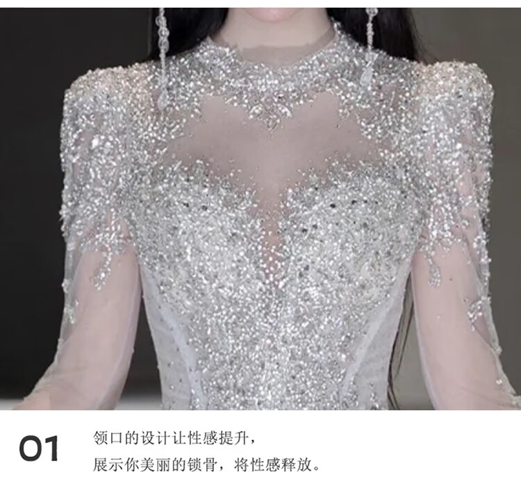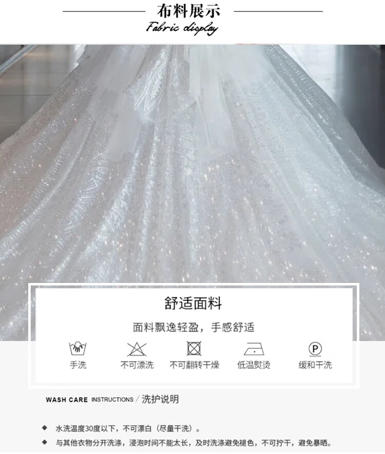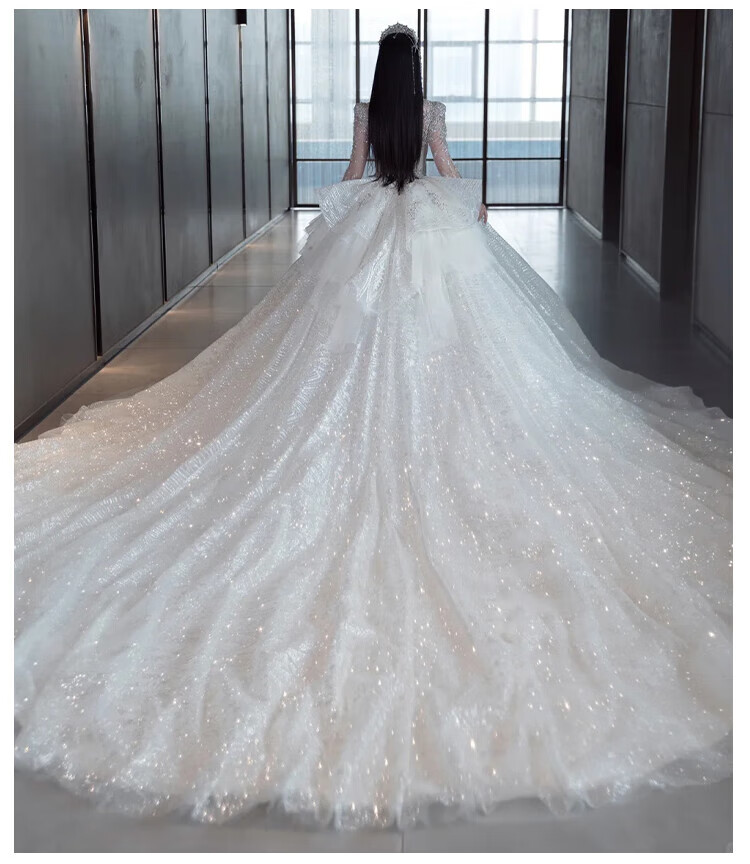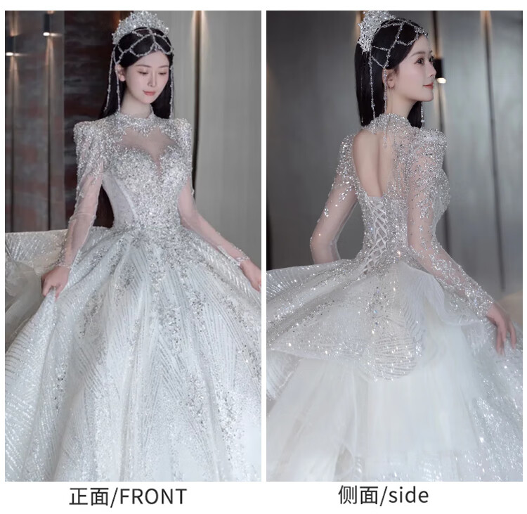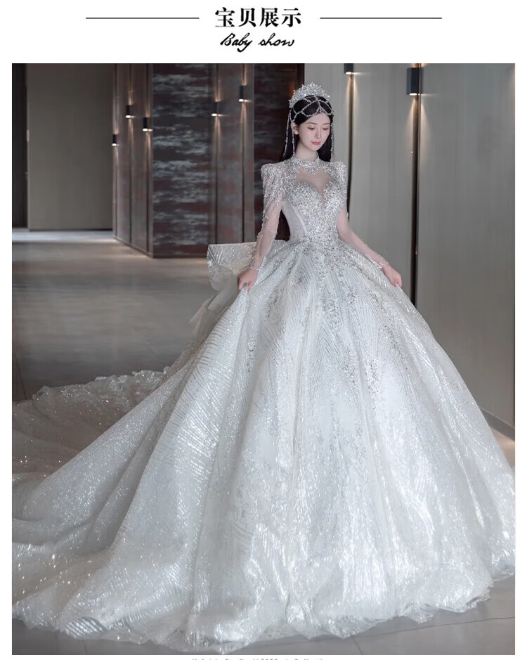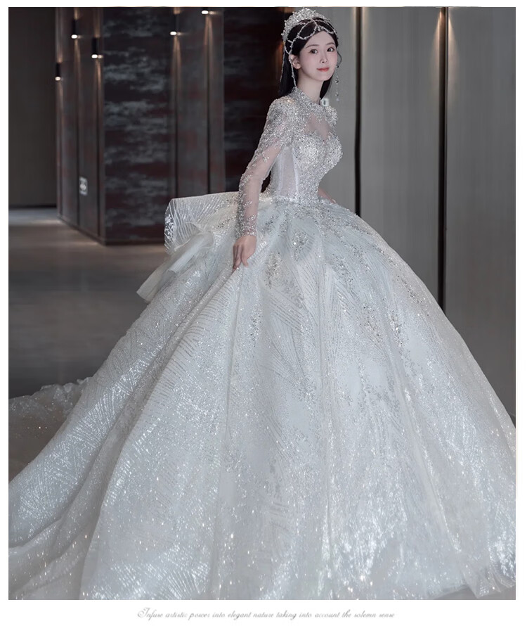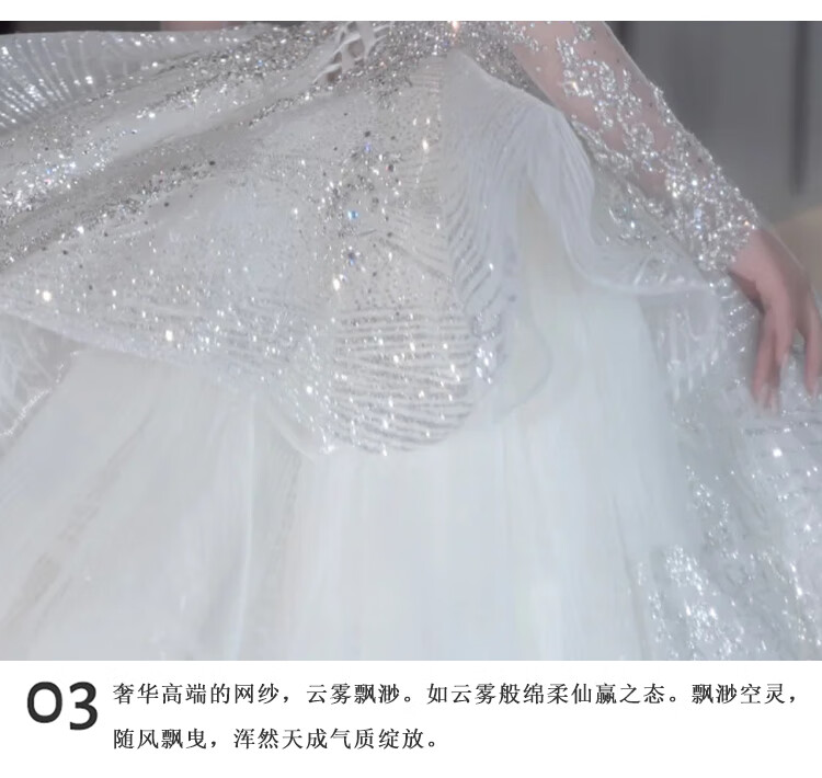Wei Lian Menglan's main wedding dress bride 2025 new long-sleeved French heavy-textured pregnant women's light large tail wedding dress white floor-length wedding dress plus eight-piece set S Weight 90Jin Jin is equal to about 0.5 kg
