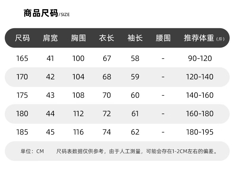 China (cm) 165 / 88-90 170 / 96-98 175 / 108-110 180 / 118-122 185 / 126-130