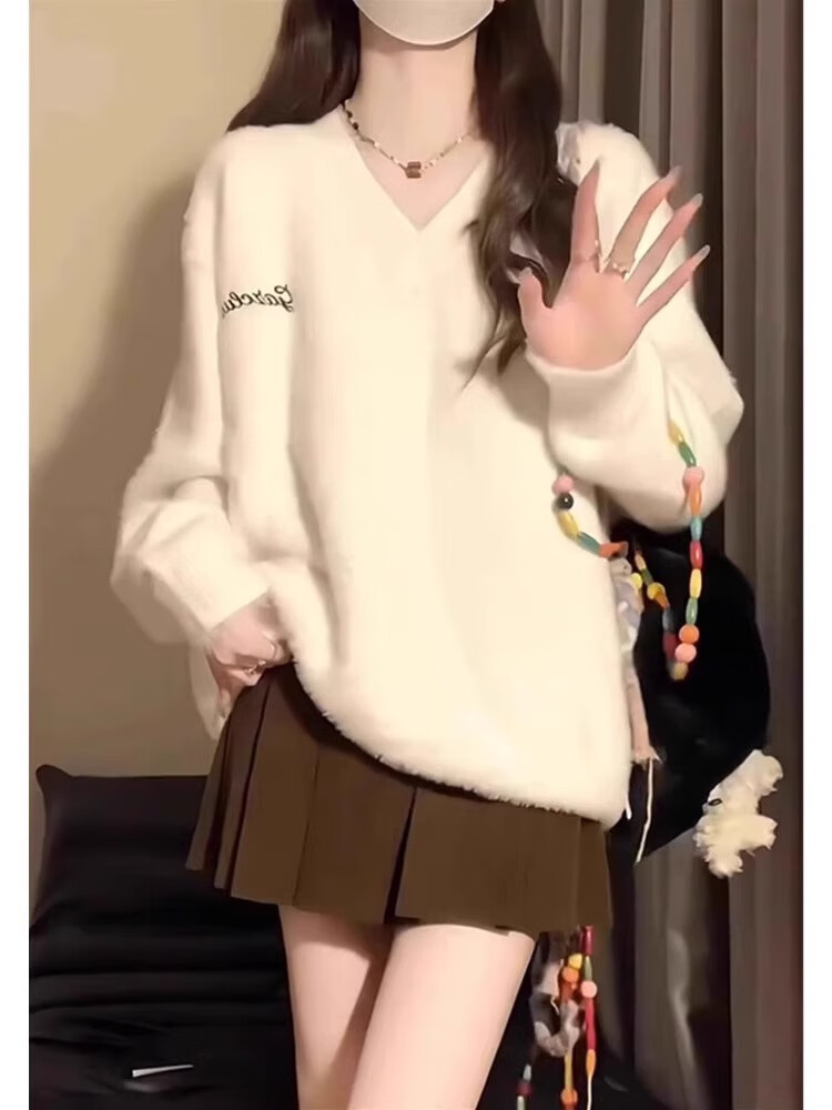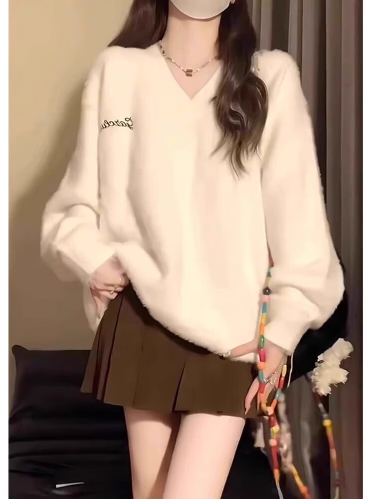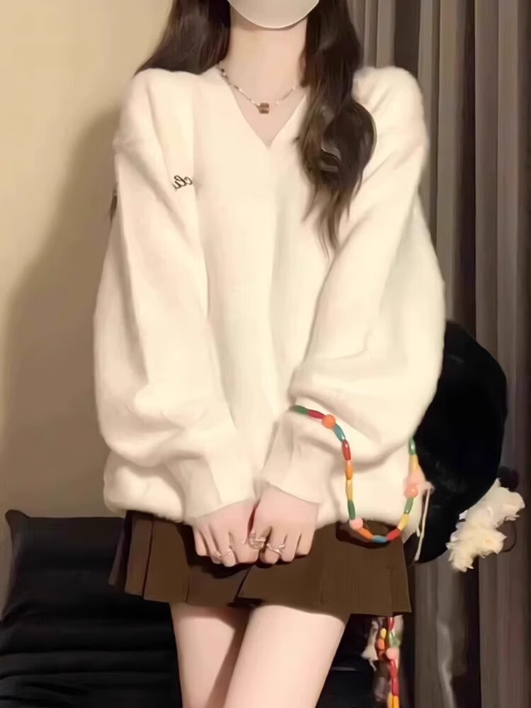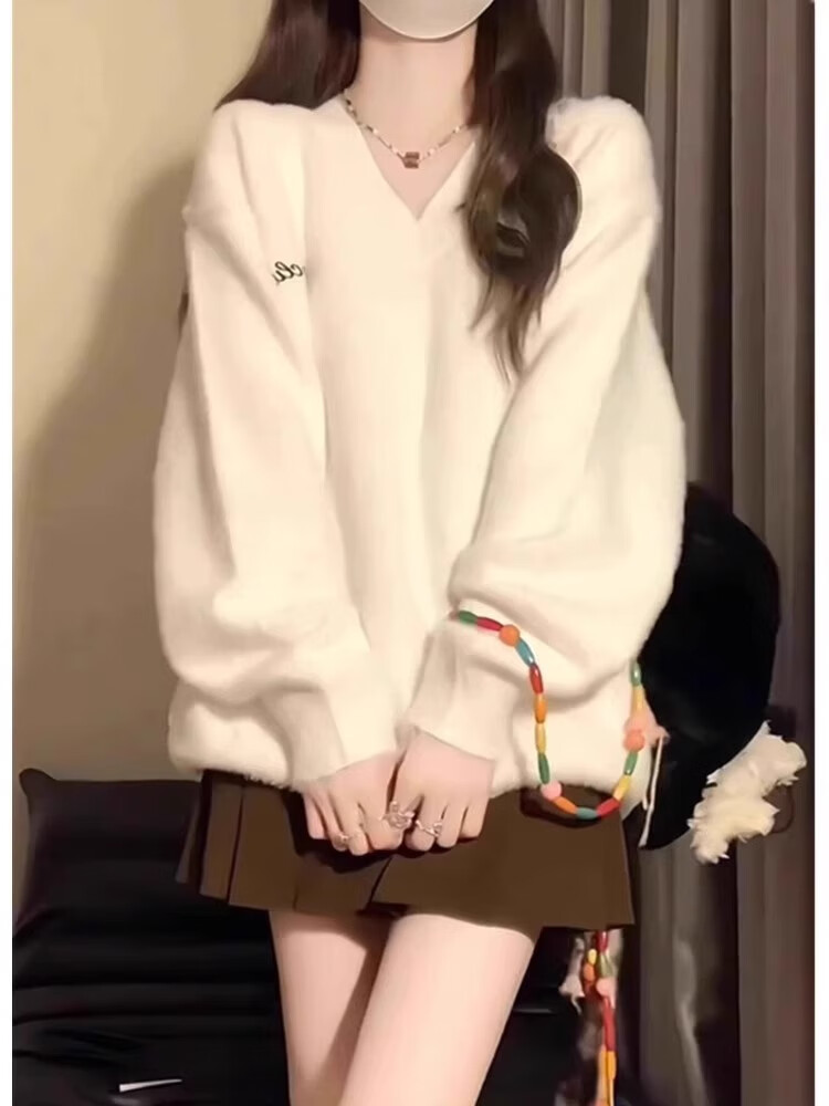 Oubaixi sweater for women in autumn and winter plus velvet v-neck mid-length white soft waxy loose bottoming shirt lazy style sweater top trendy off-white one size fits all recommended 80-120 Jin Jin equals 0.5 kg