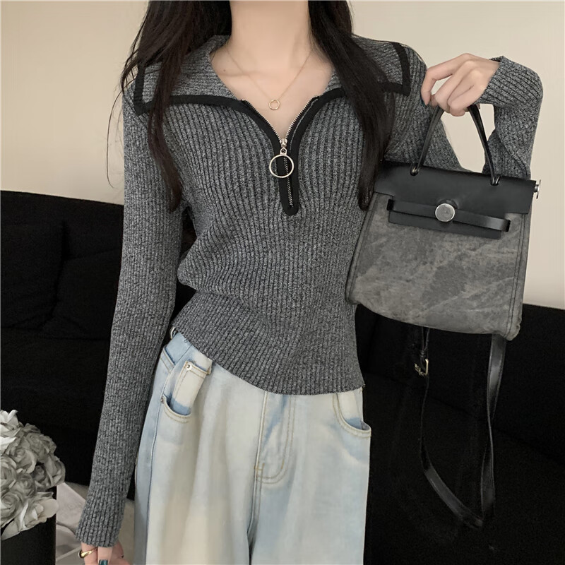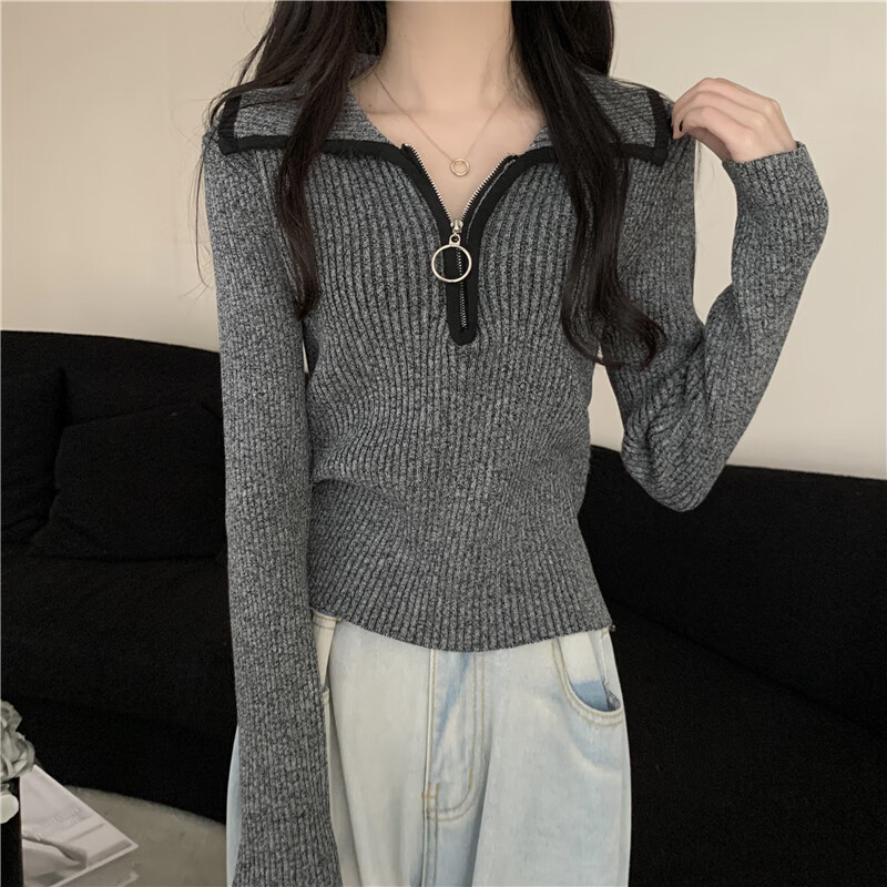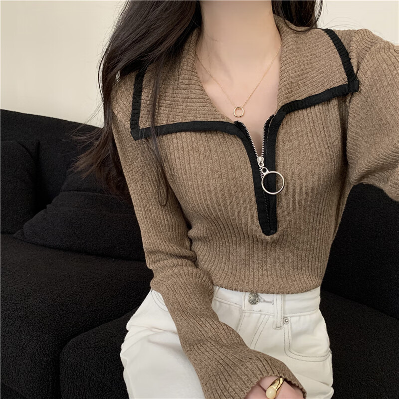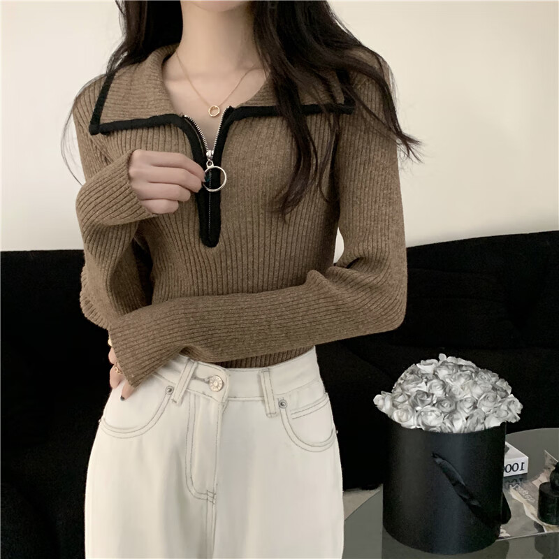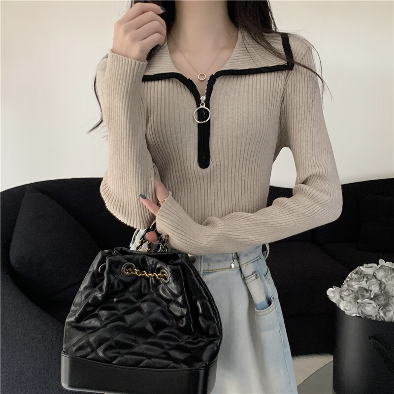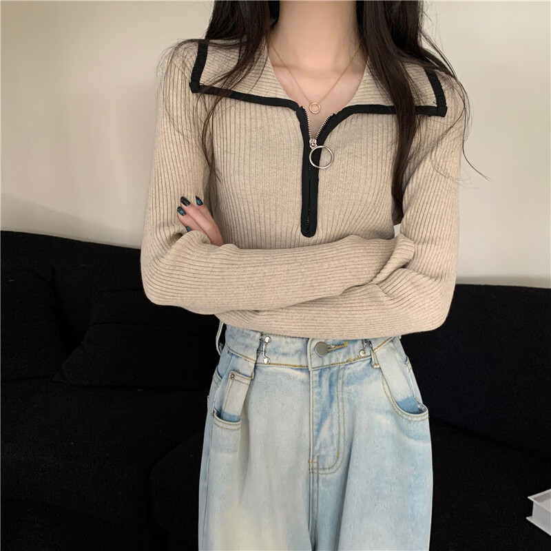 Oubaixi sweater for women spring and autumn long-sleeved right shoulder polo collar 2025 sweater with temperament and light top, apricot color, one size fits all, recommended 80-120 Jin Jin equals 0.5 kg