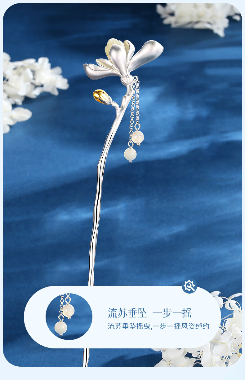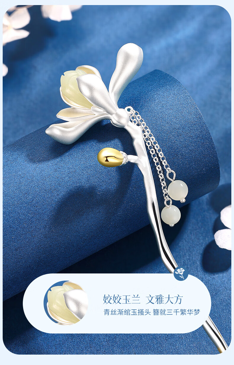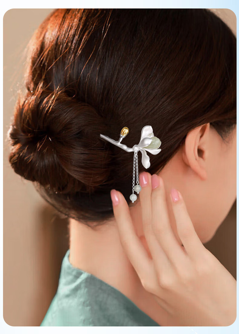 Chinese gold magnolia and Hetian jade tassel silver hairpin for women in ancient style Hanfu headwear silver hairpin birthday gift for girlfriend and wife Magnolia and field jade tassel hairpin
