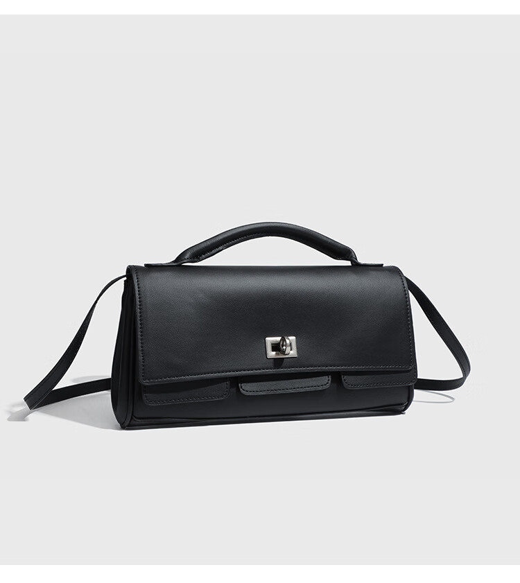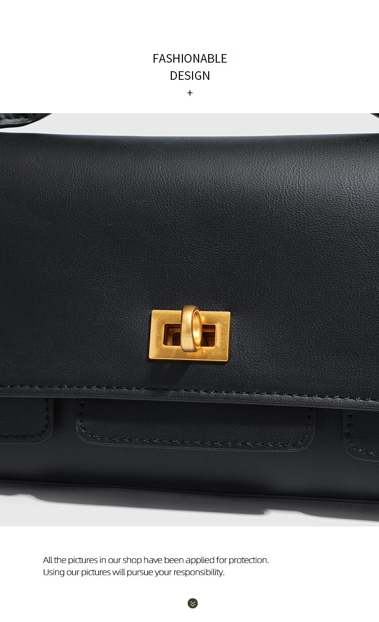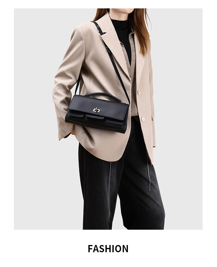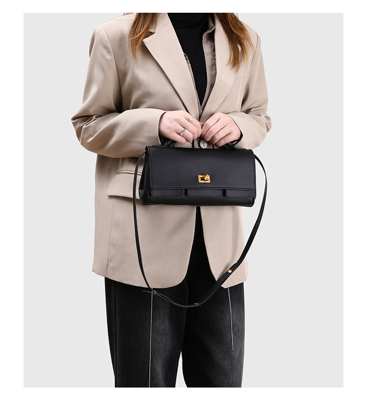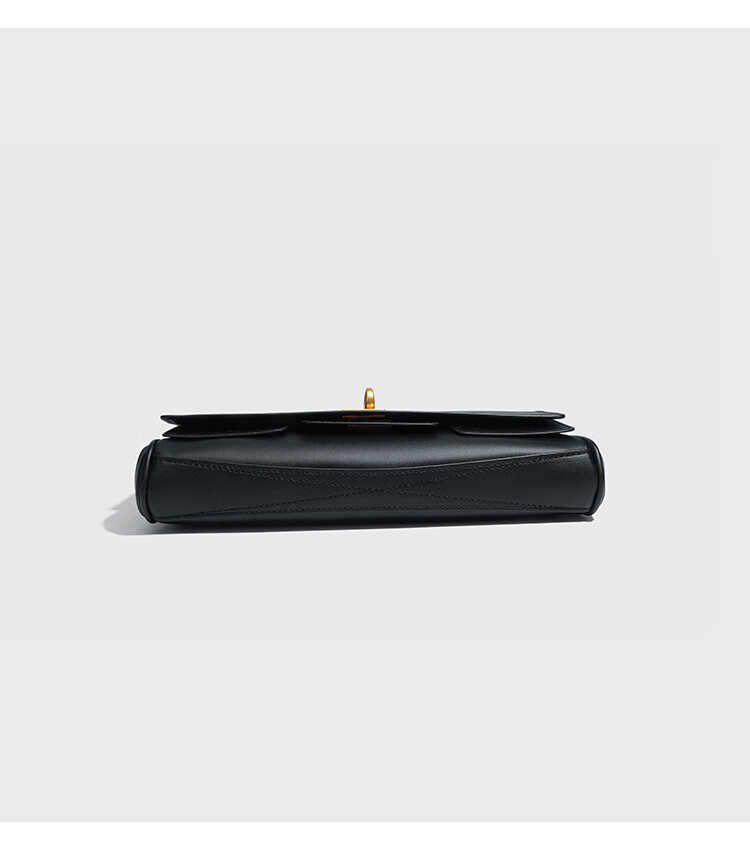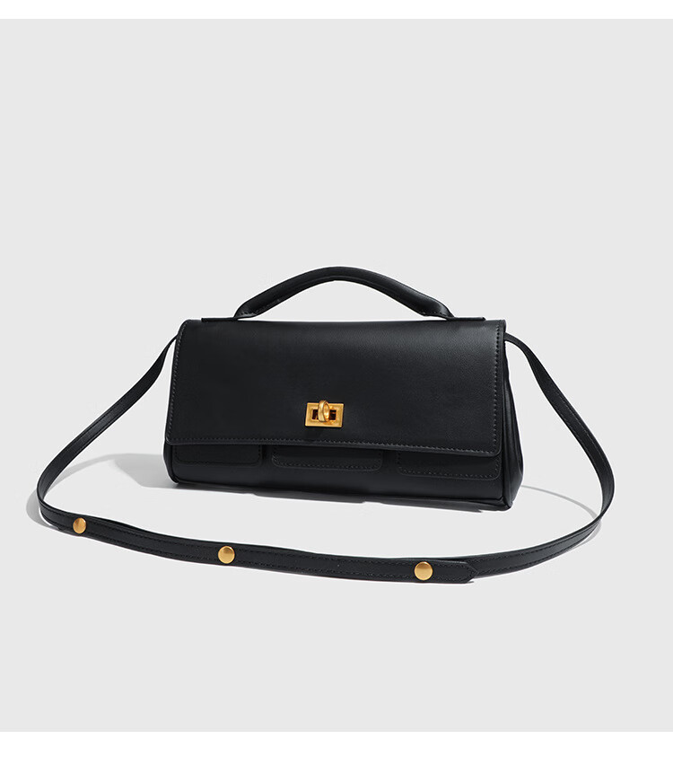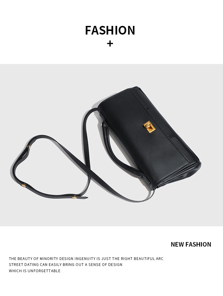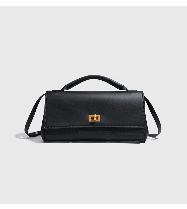 MOSPOKE light luxury brand genuine leather bag women's bag handbag horizontal small square bag lock bag baguette handbag shoulder bag oblique black gold buckle