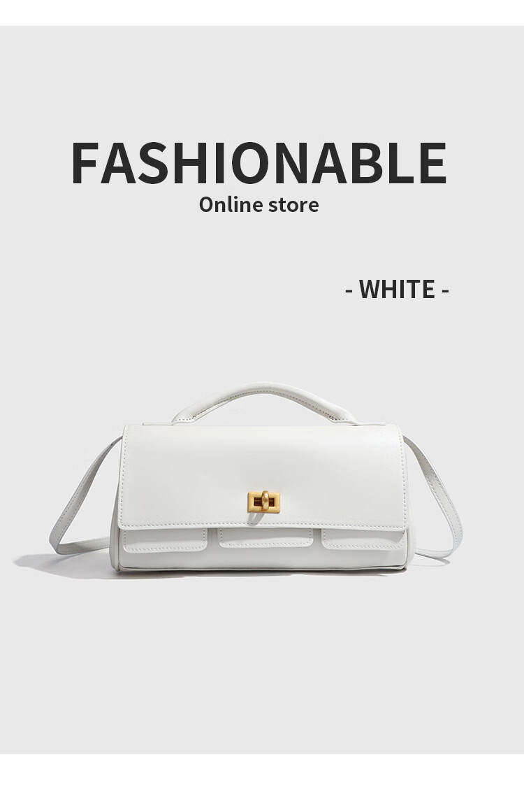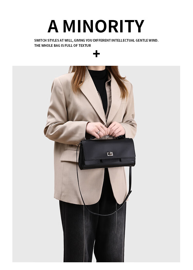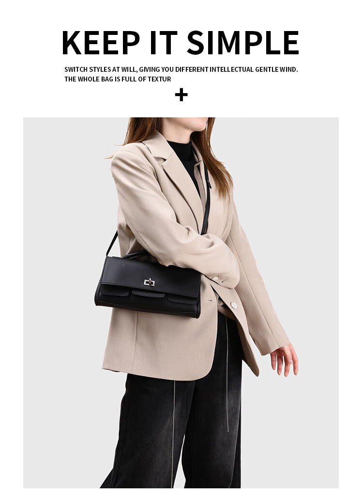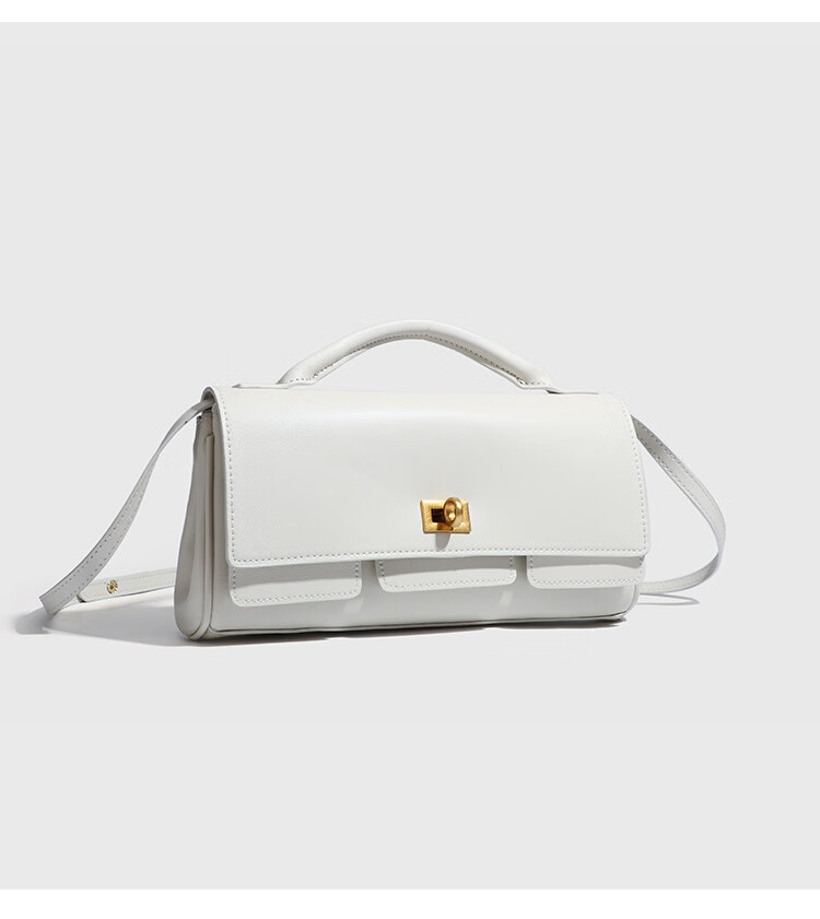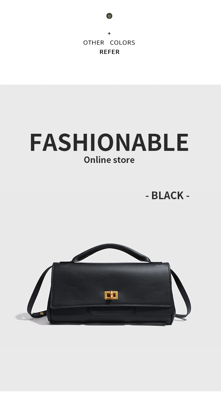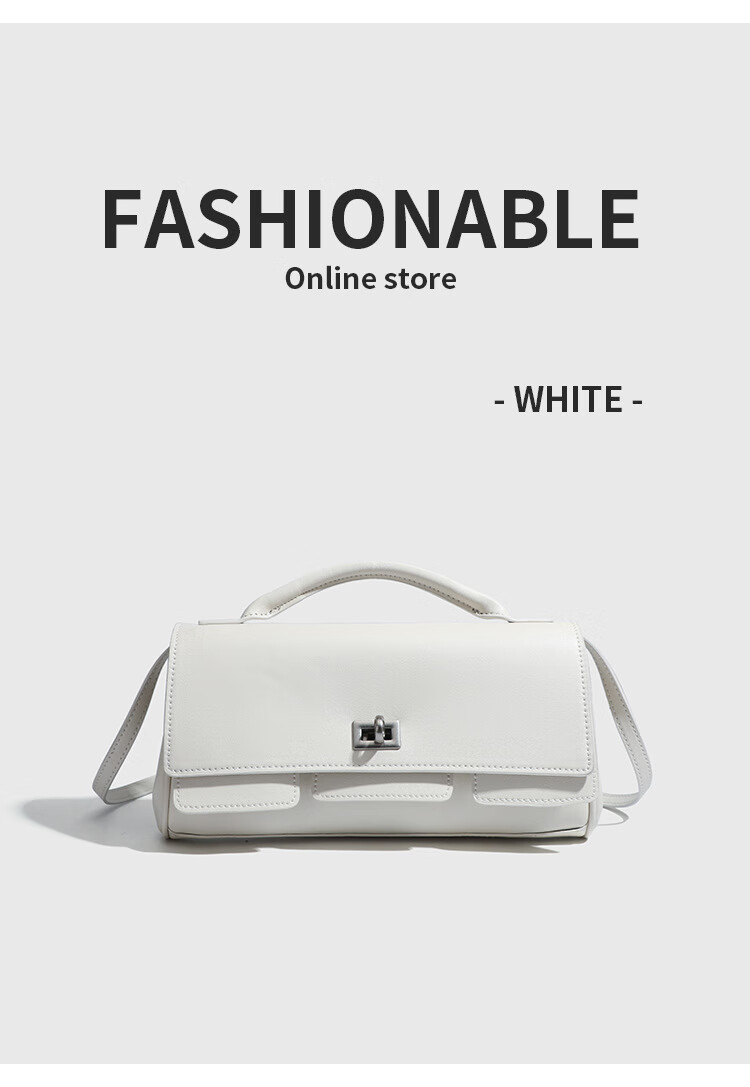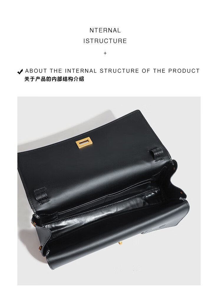 MOSPOKE light luxury brand genuine leather bag women's bag handbag horizontal small square bag lock bag baguette handbag shoulder bag oblique black gold buckle
