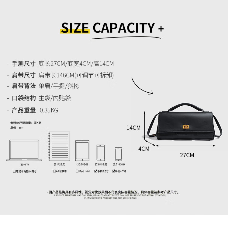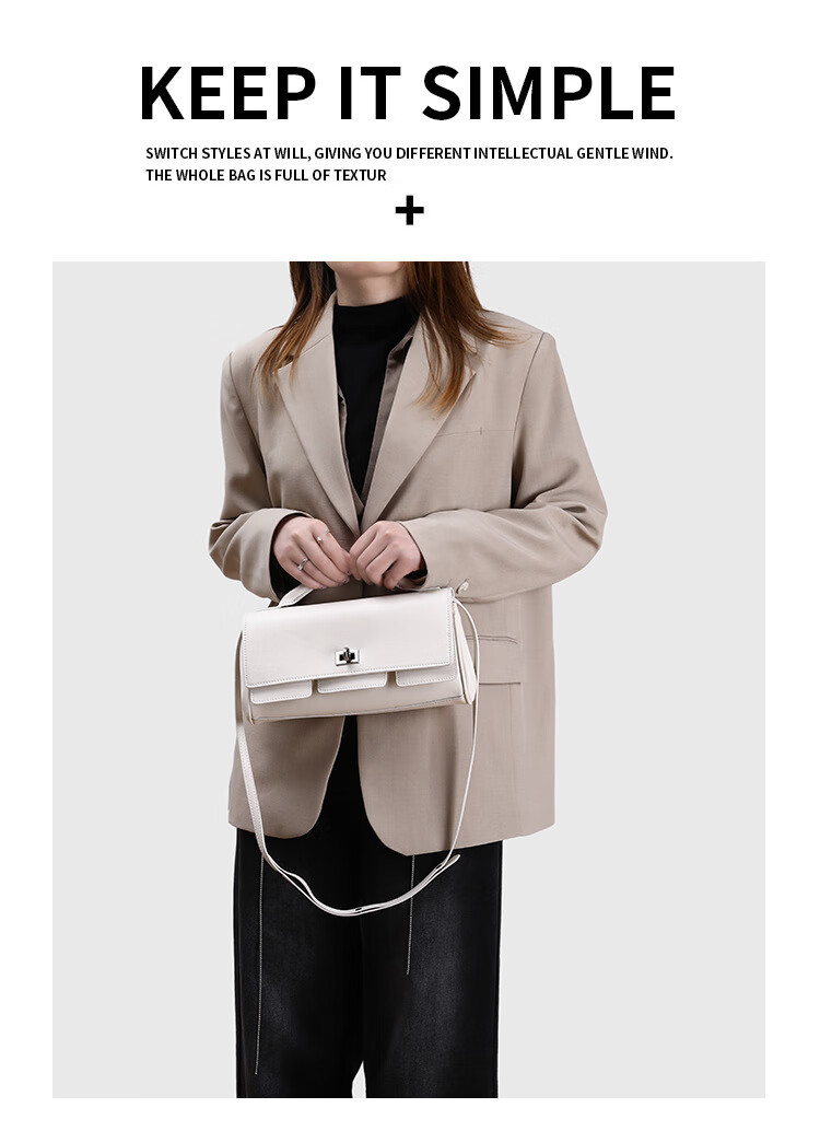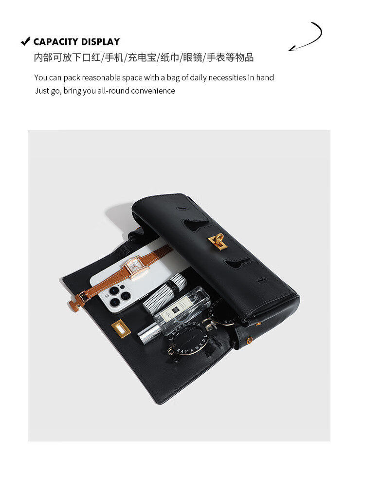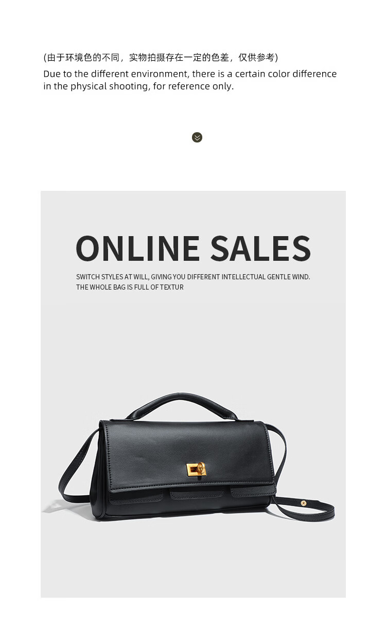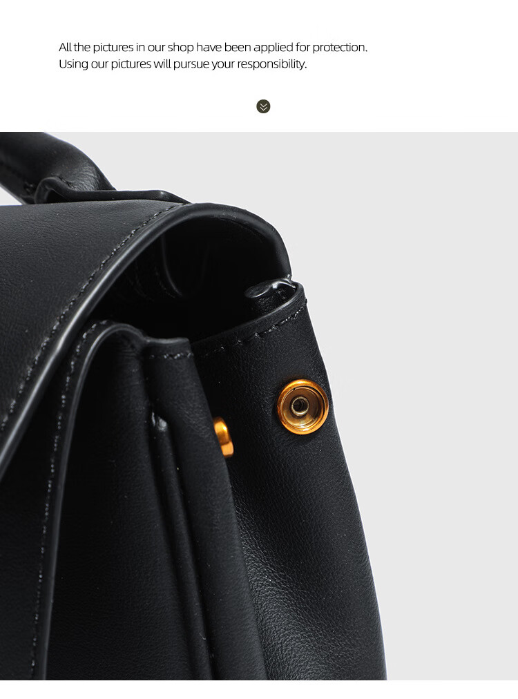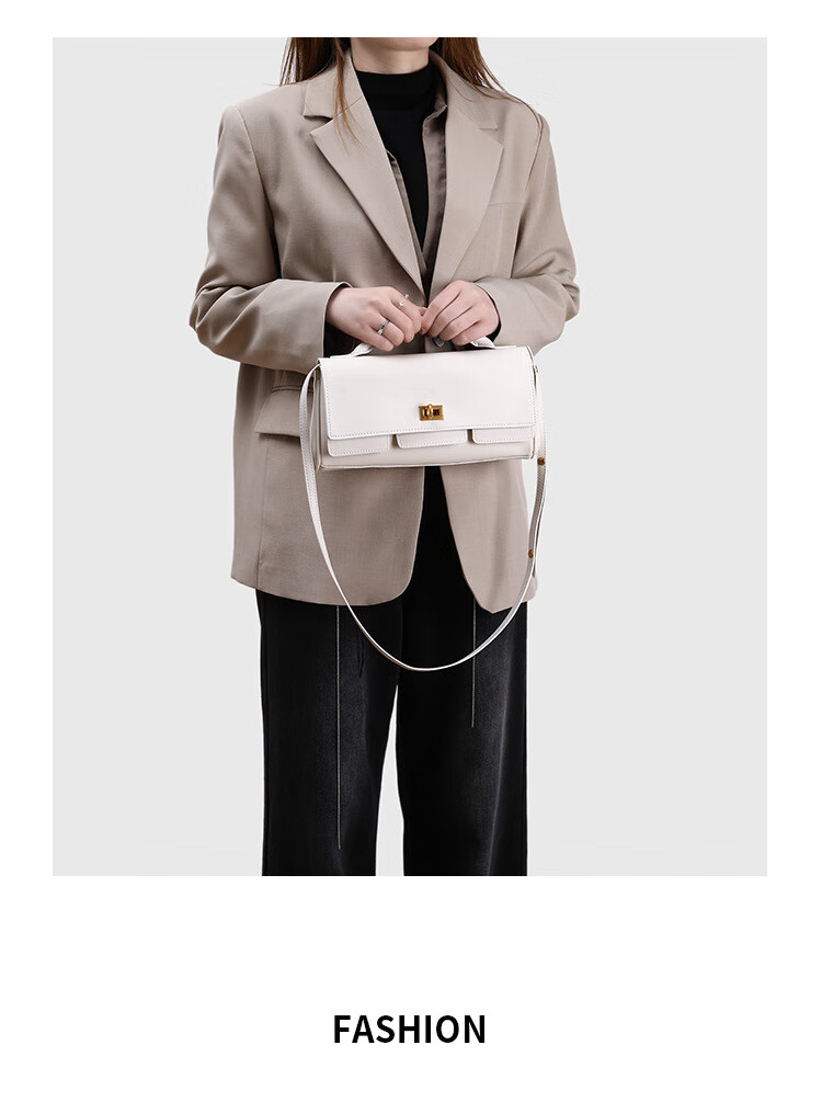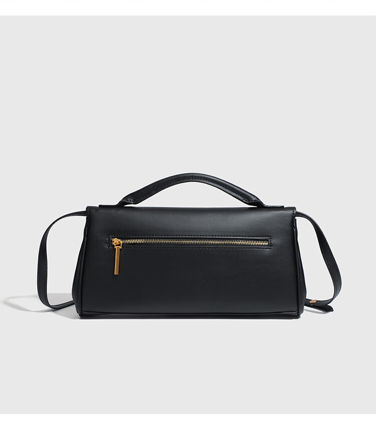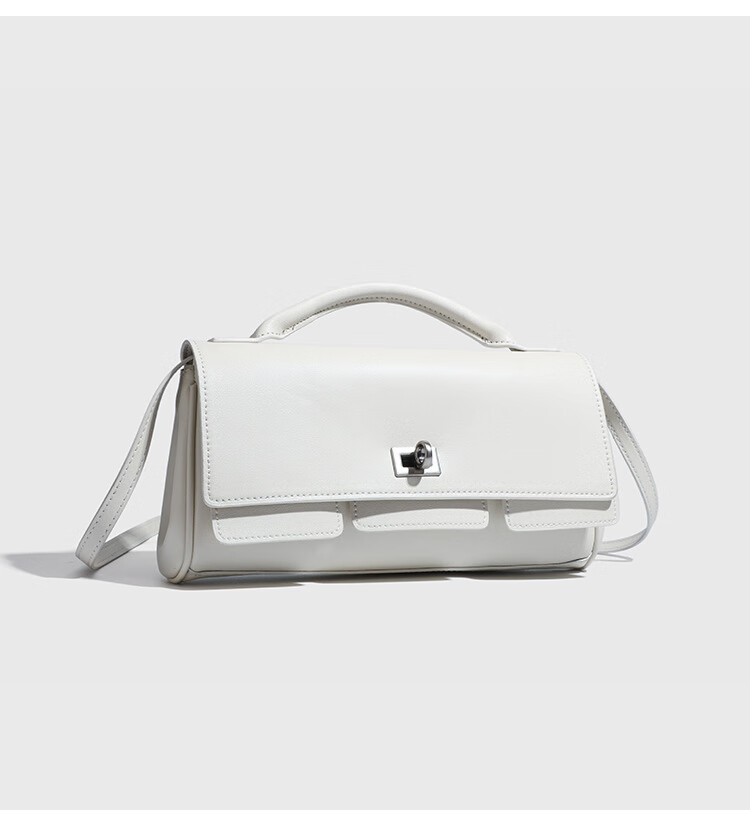 MOSPOKE light luxury brand genuine leather bag women's bag handbag horizontal small square bag lock bag baguette handbag shoulder bag oblique black gold buckle