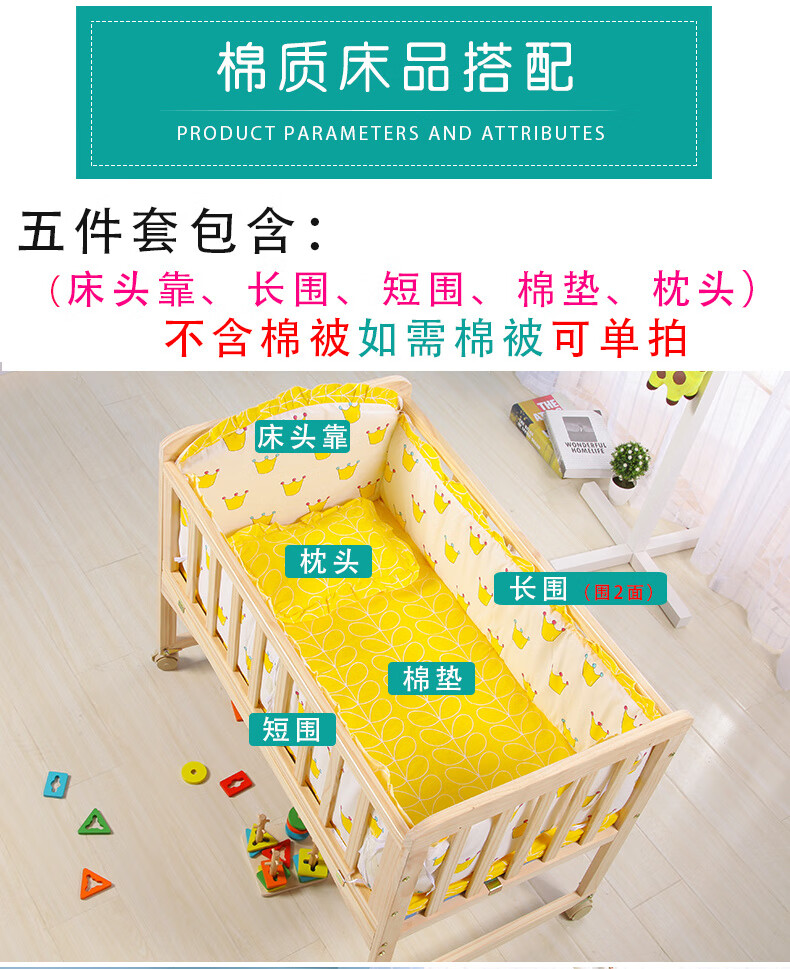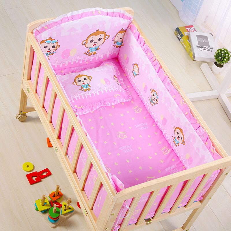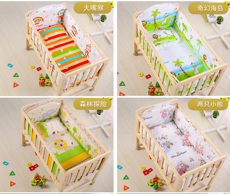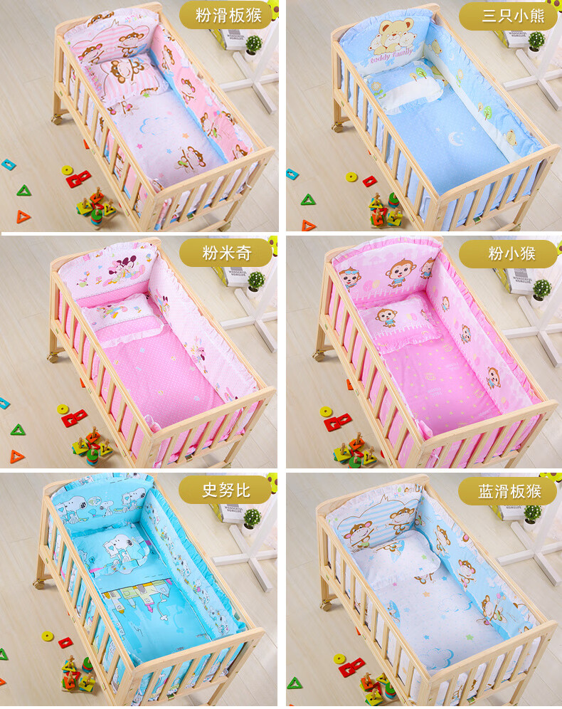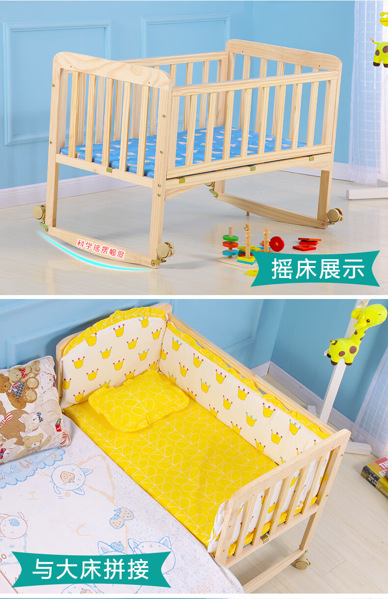 Tongjian crib solid wood paint-free environmentally friendly baby bed crib rocker baby cradle bed bed + mosquito net + three bears five-piece set single-layer large bed 102x60 0-3 years old