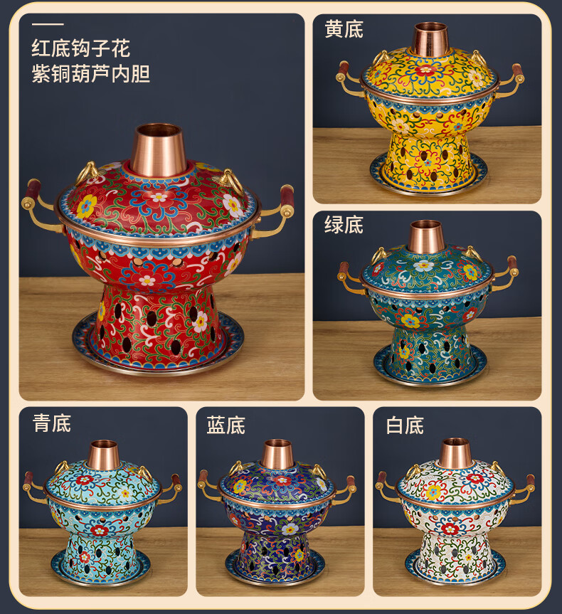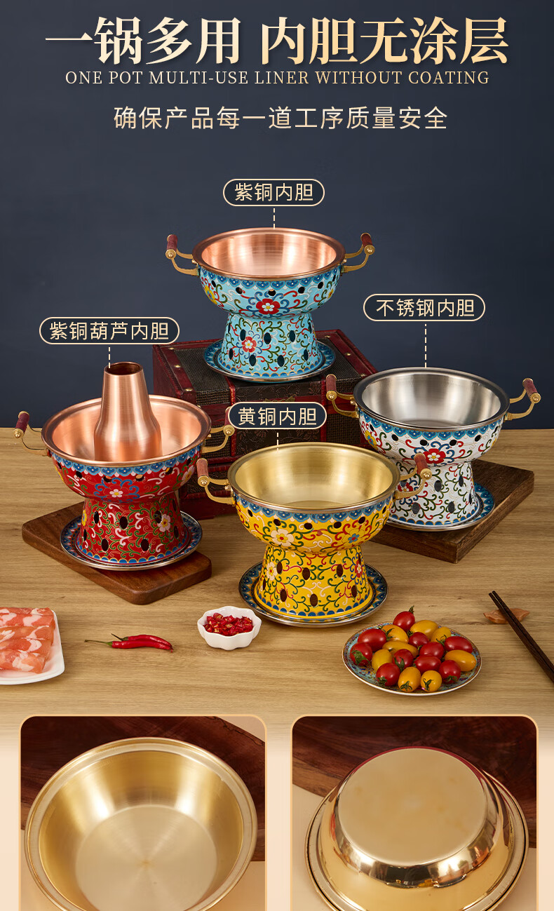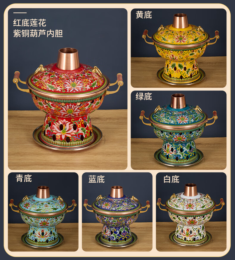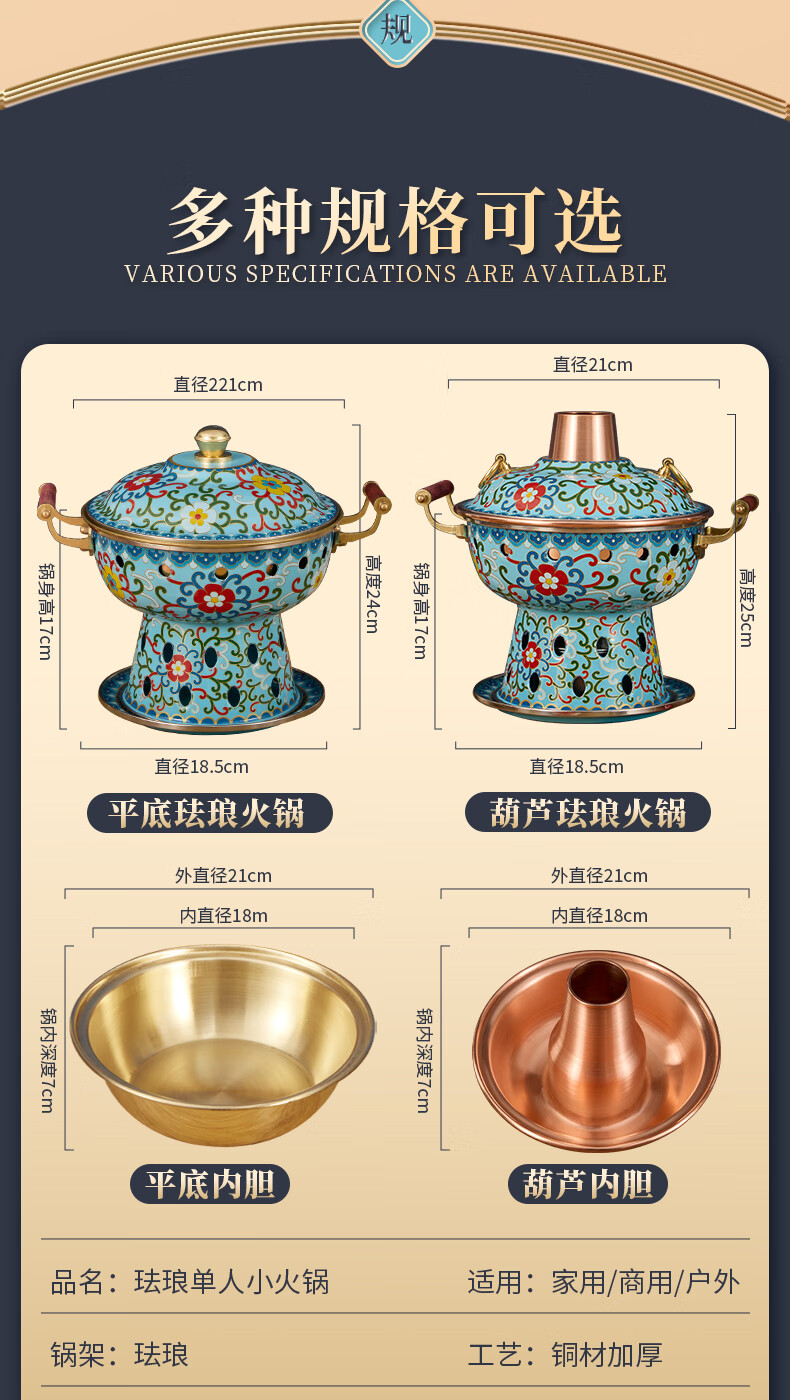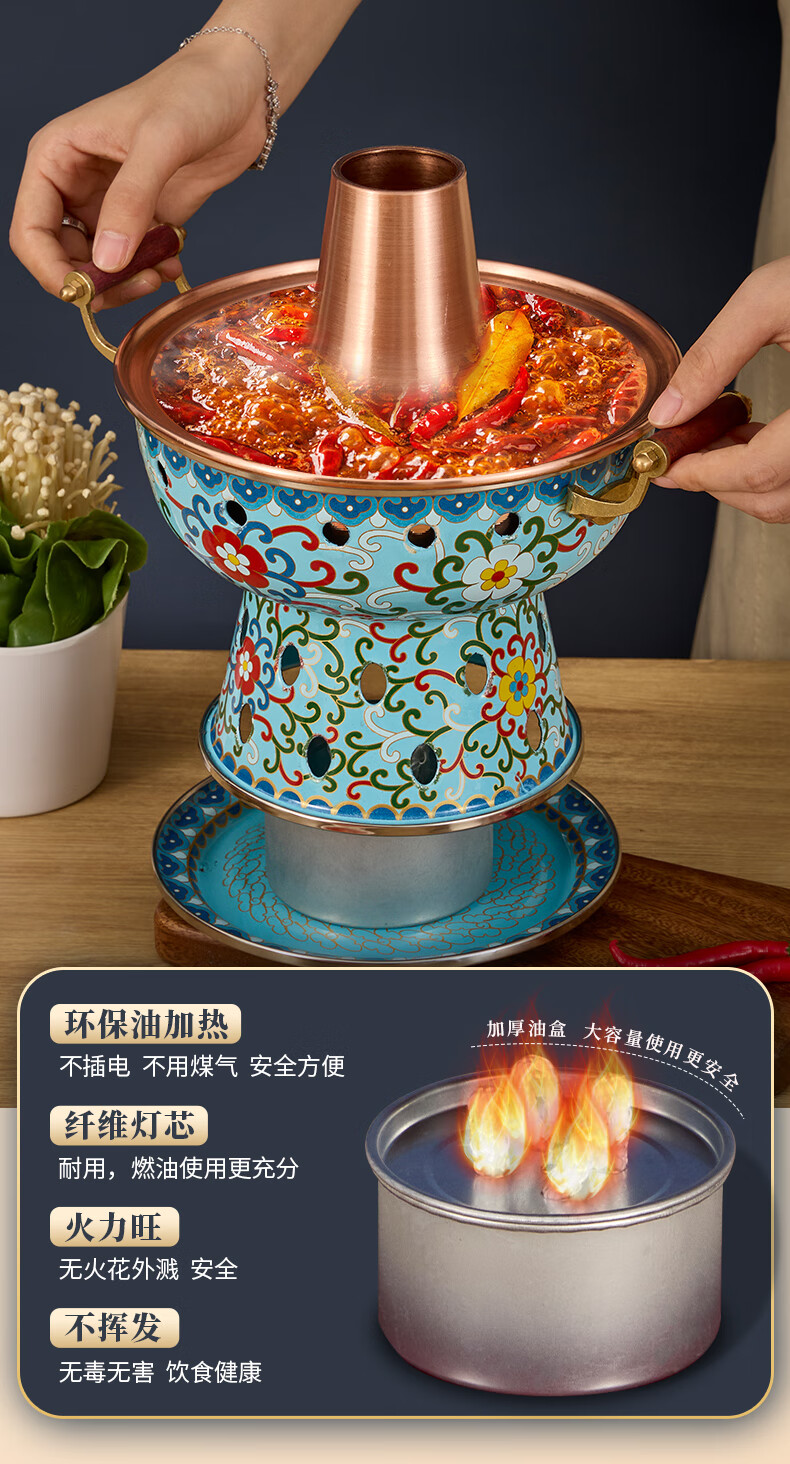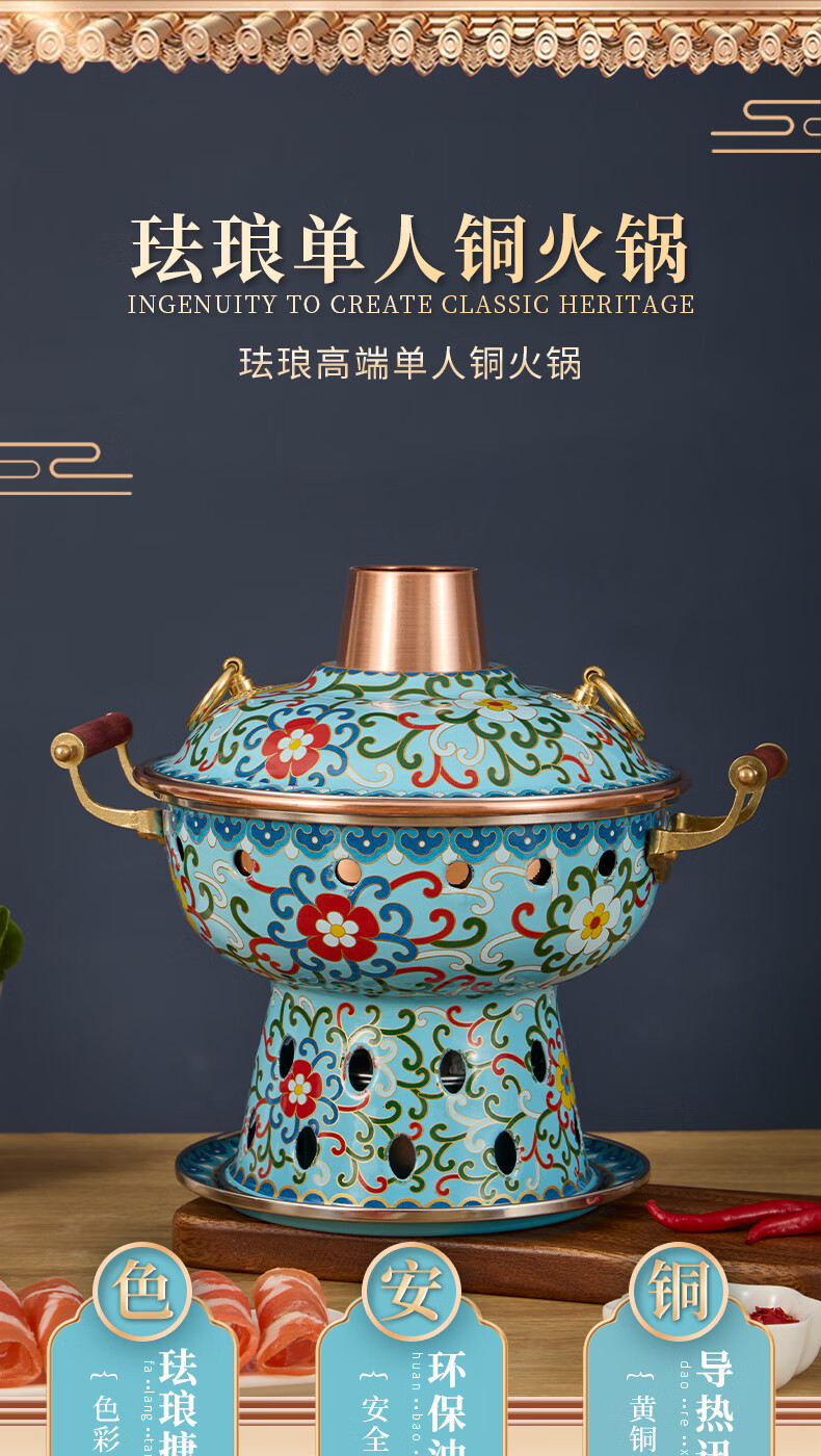Chui Laoye cloisonné single copper hot pot enamel alcohol small hot pot one person one pot thickened environmentally friendly oil copper pot club cyan lotus copper gourd inner pot 20cm