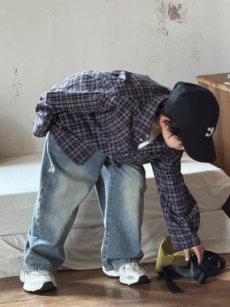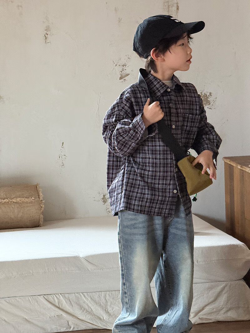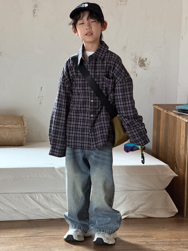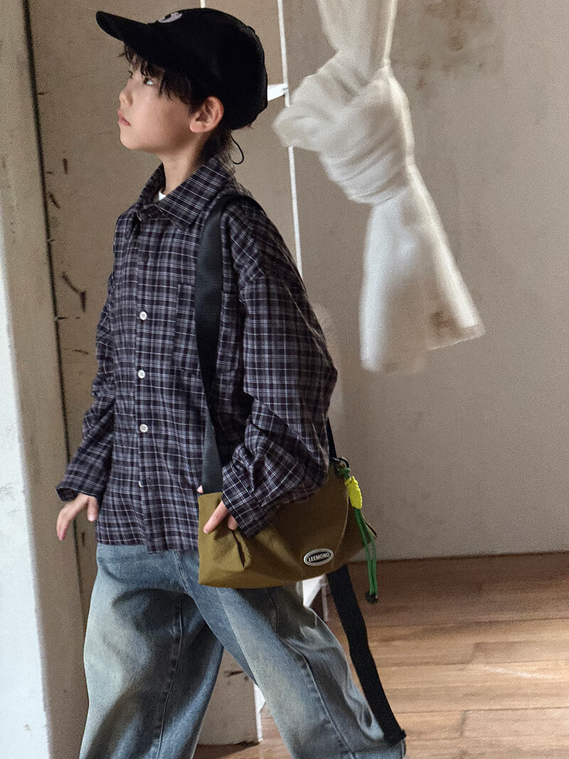 Children's plaid long-sleeved shirt boys' casual shirt lazy style draped spring and autumn Korean style girls' tops and jackets black and white plaid 140