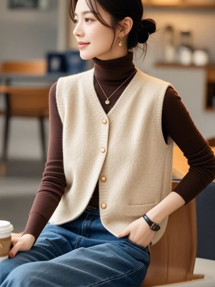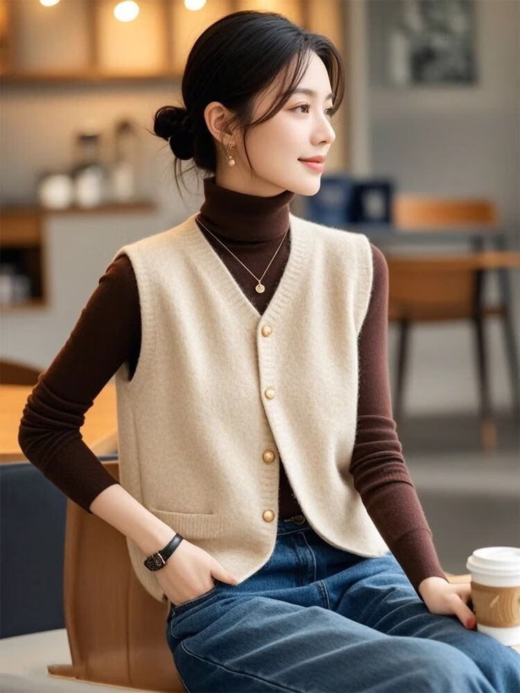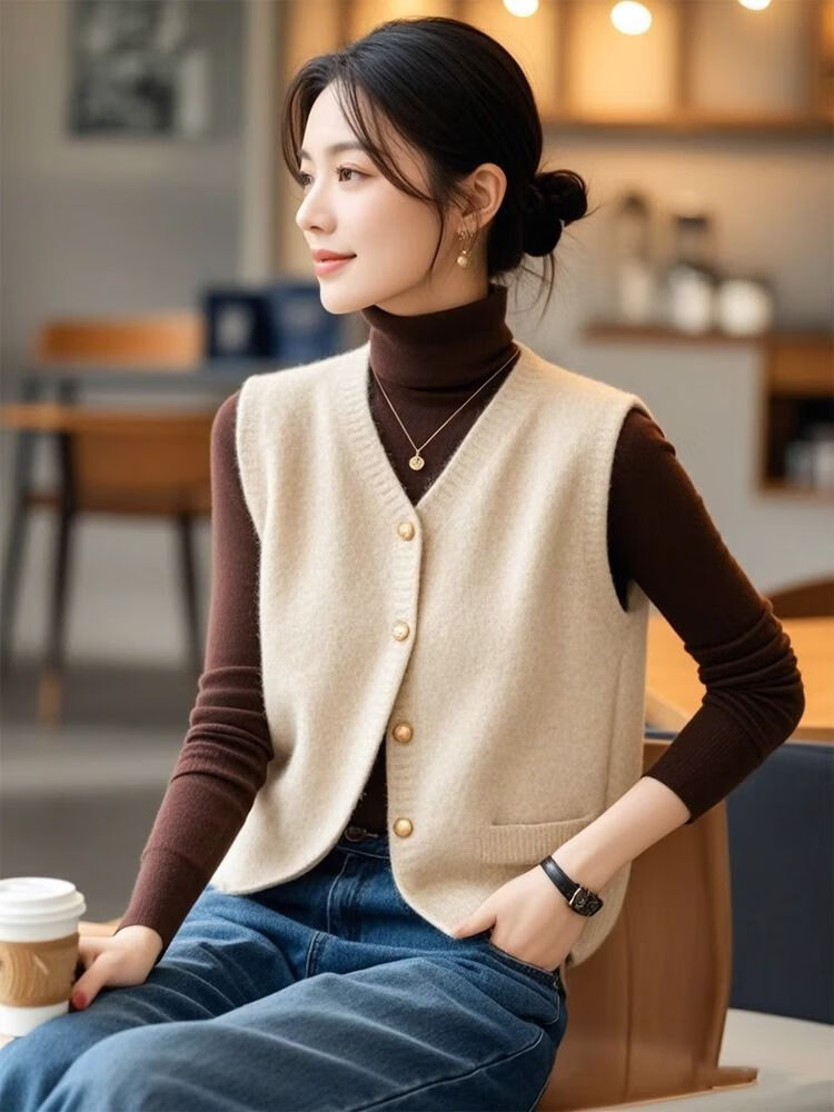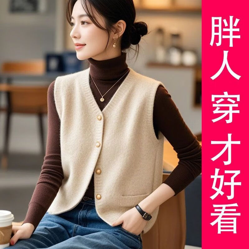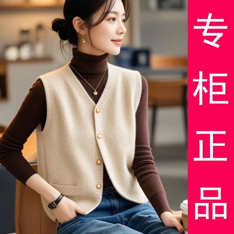 Hengyuanxiang fashion age-reducing wool knitted vest for women spring and autumn new temperament single-breasted cardigan sleeveless top vest khaki 2XL recommended 120-130