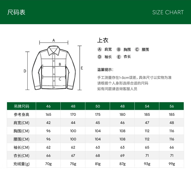 China (cm) 165 / 88-90 170 / 96-98 175 / 108-110 180 / 118-122 185 / 126-130