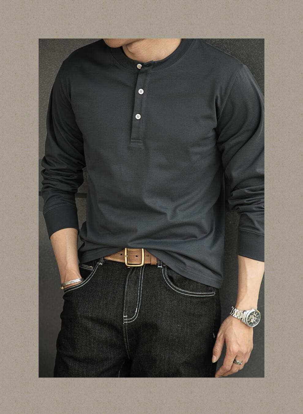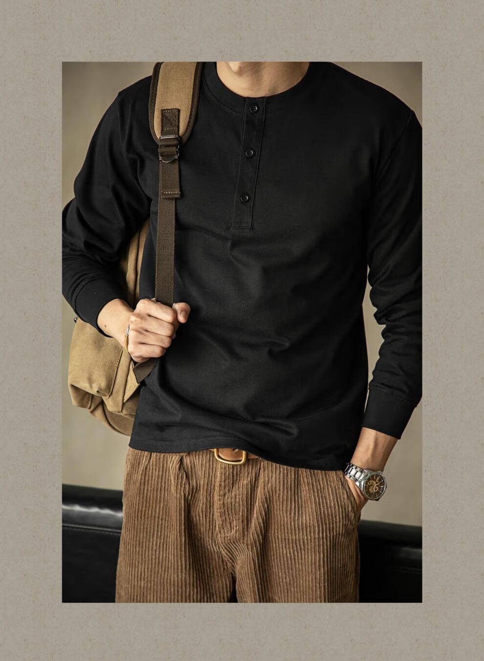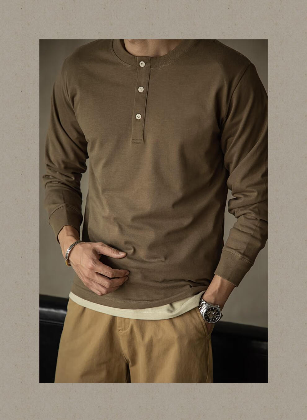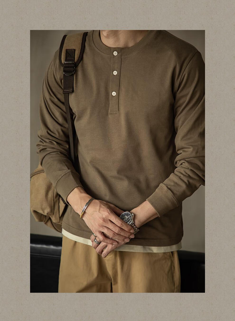 ROMON high-end workwear American retro tough guy style heavy henley T-shirt long-sleeved pure cotton inner layering shirt for men autumn and winter brown L