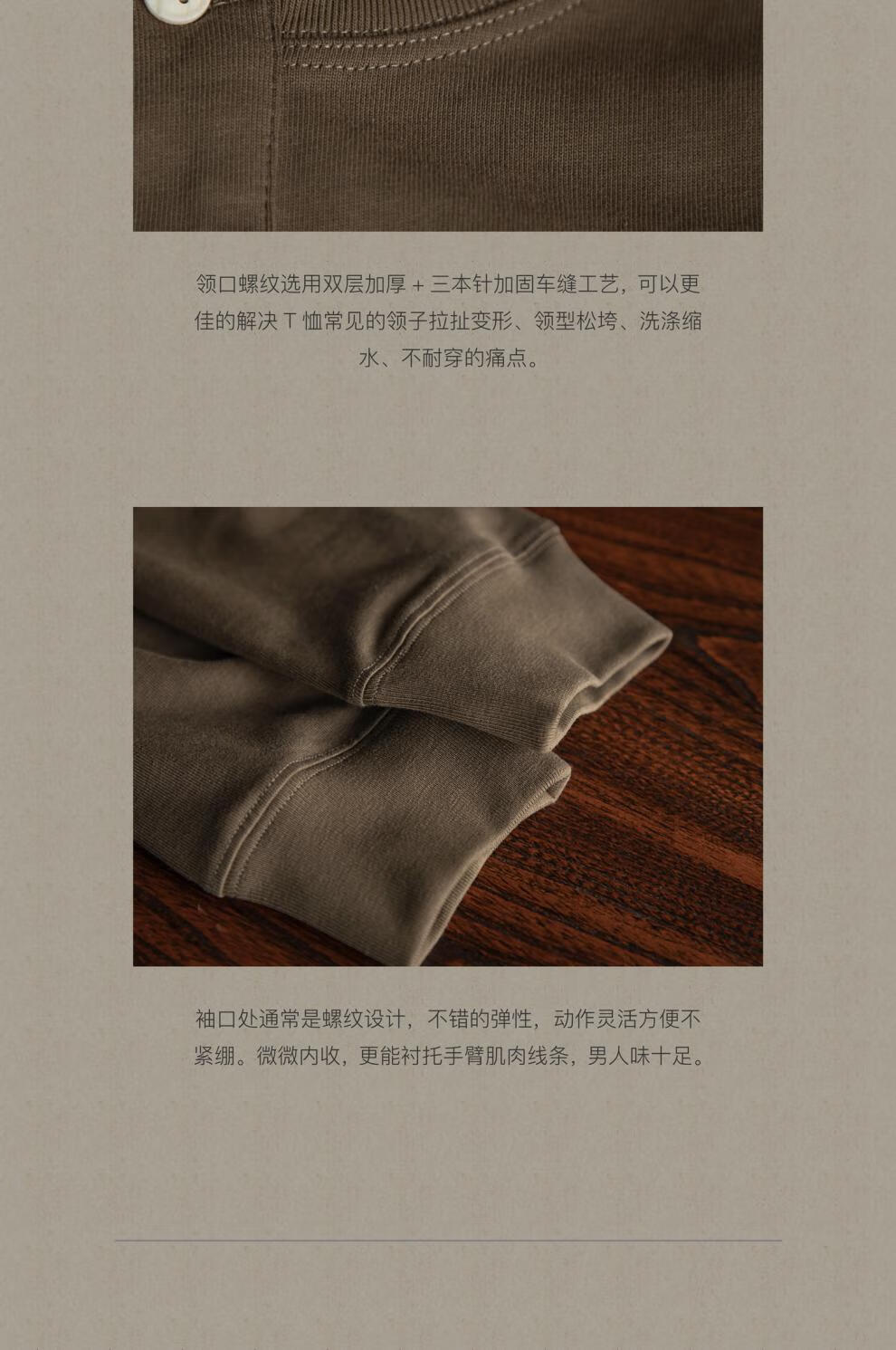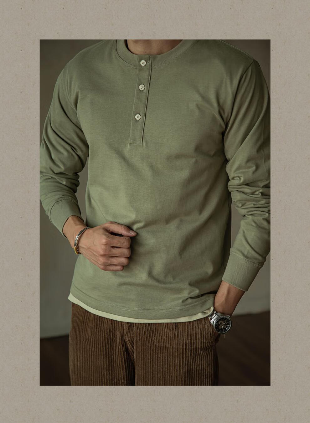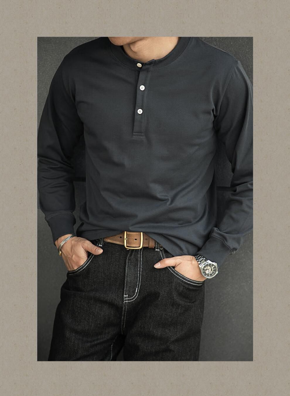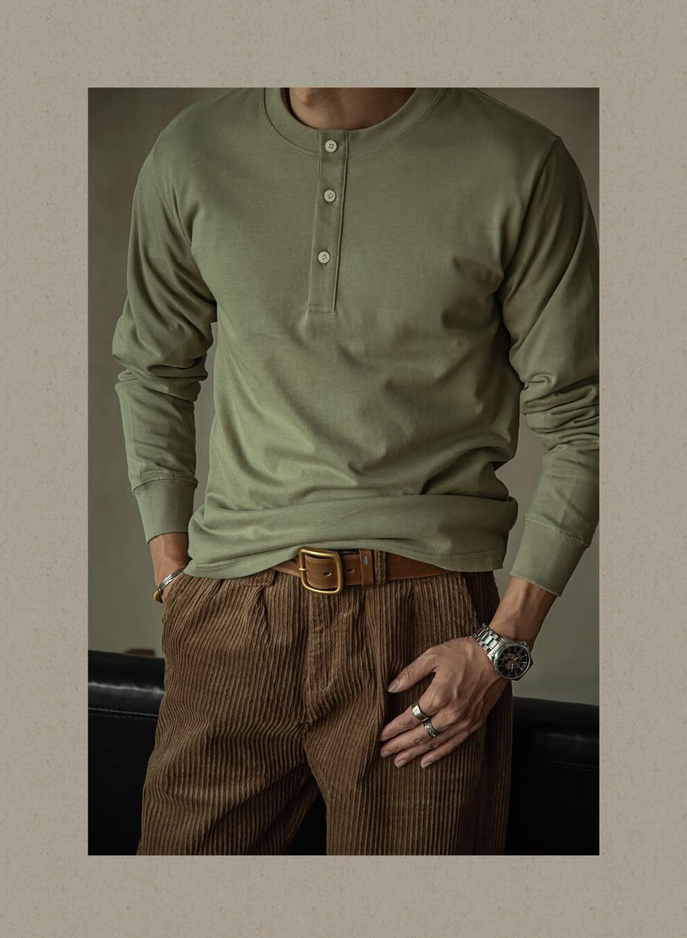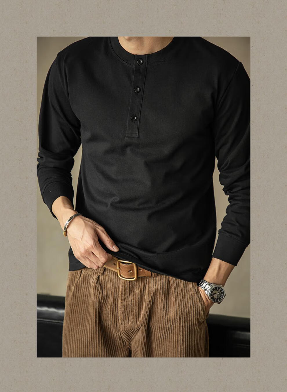 ROMON high-end workwear American retro tough guy style heavy henley T-shirt long-sleeved pure cotton inner layering shirt for men autumn and winter brown L