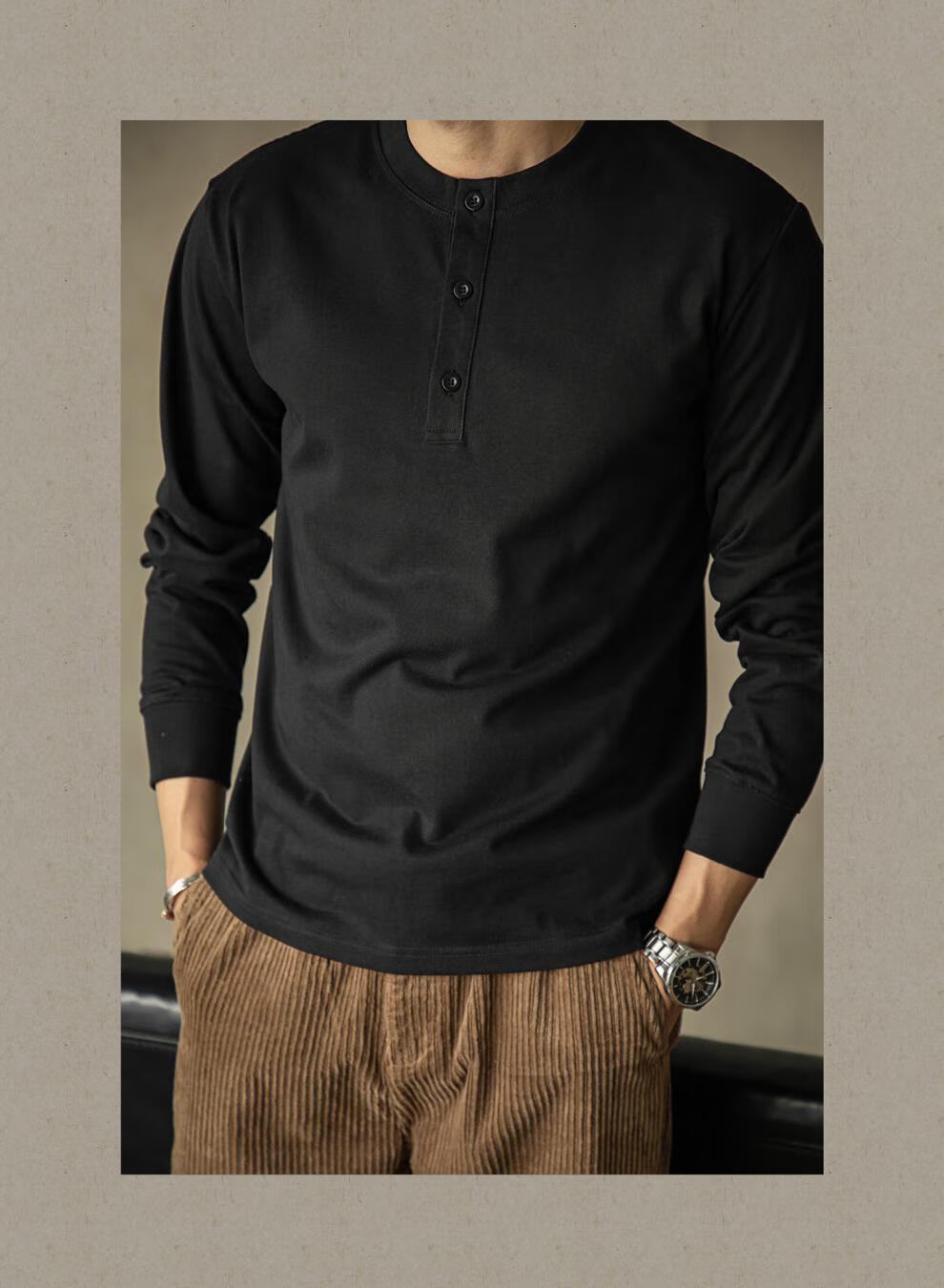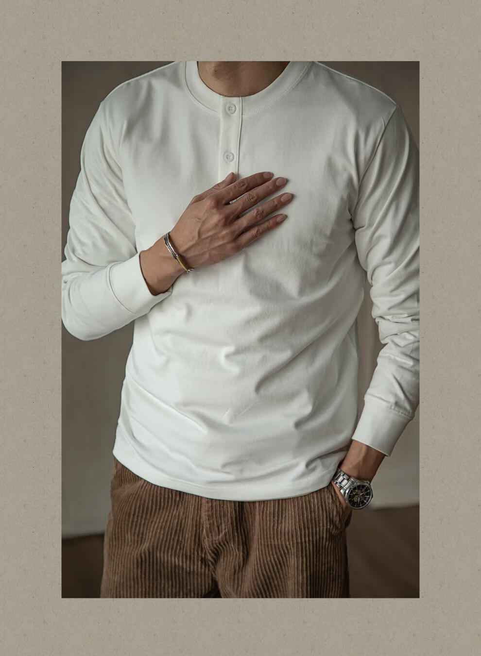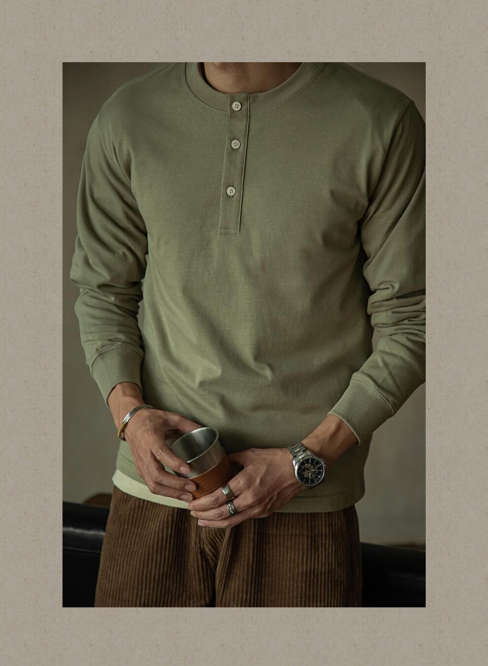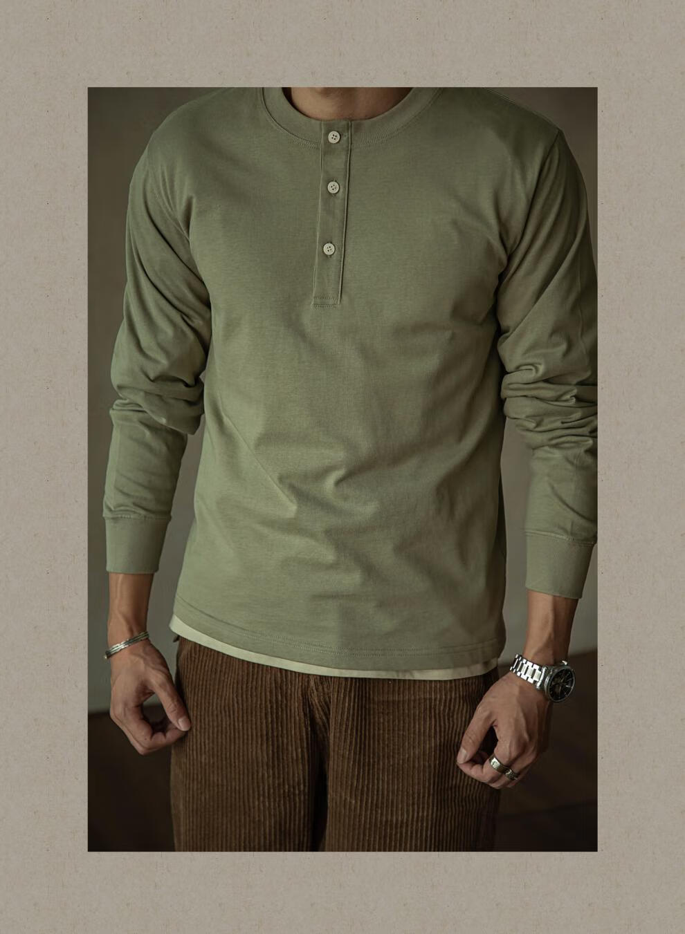 ROMON high-end workwear American retro tough guy style heavy henley T-shirt long-sleeved pure cotton inner layering shirt for men autumn and winter brown L