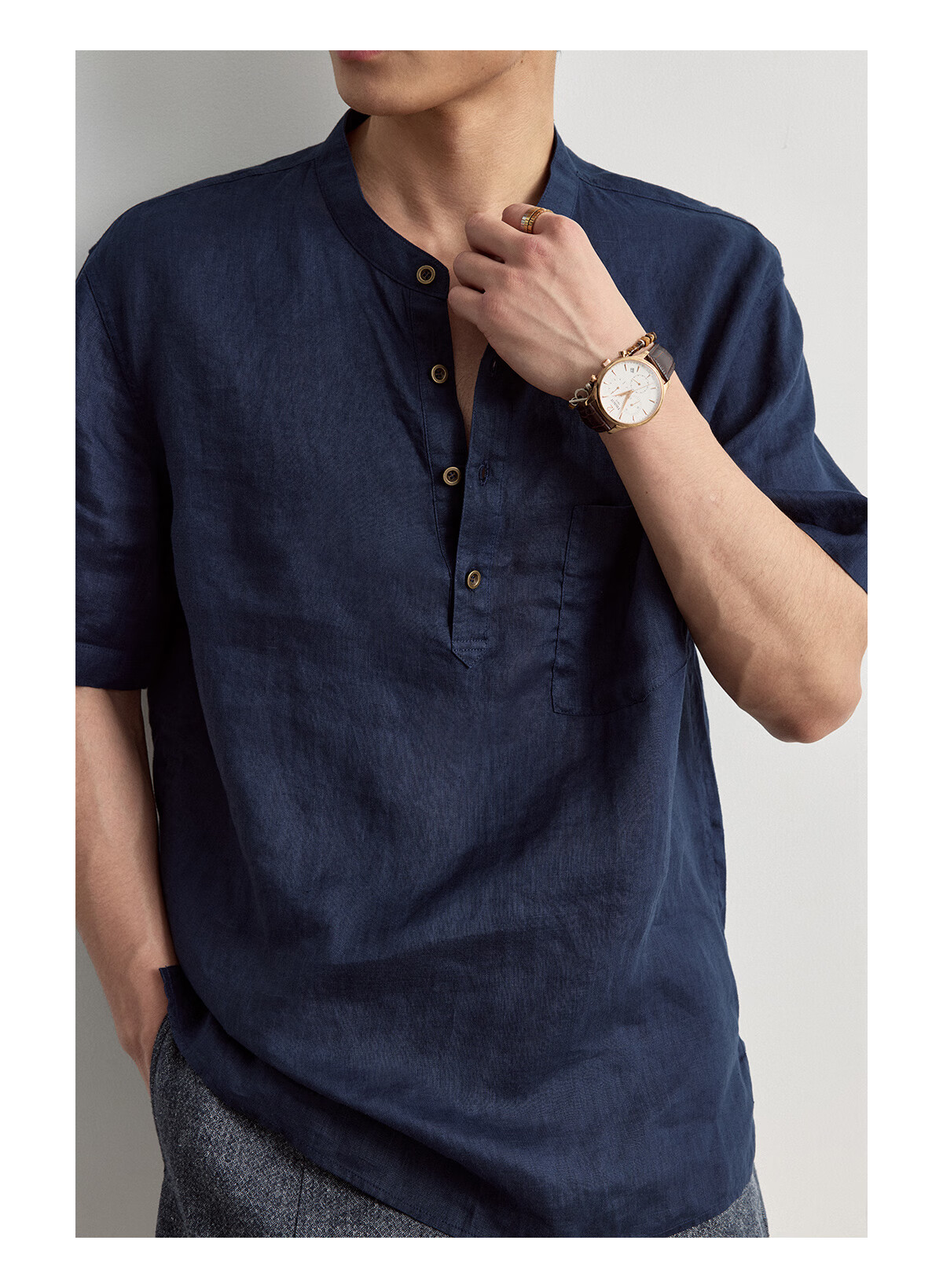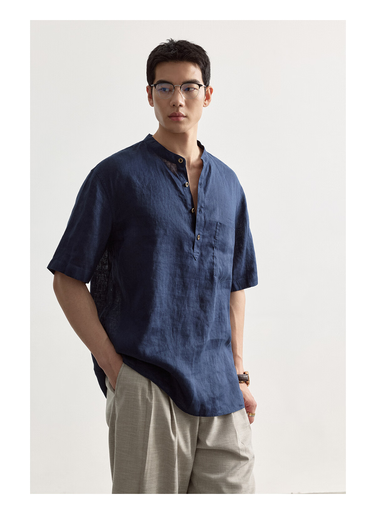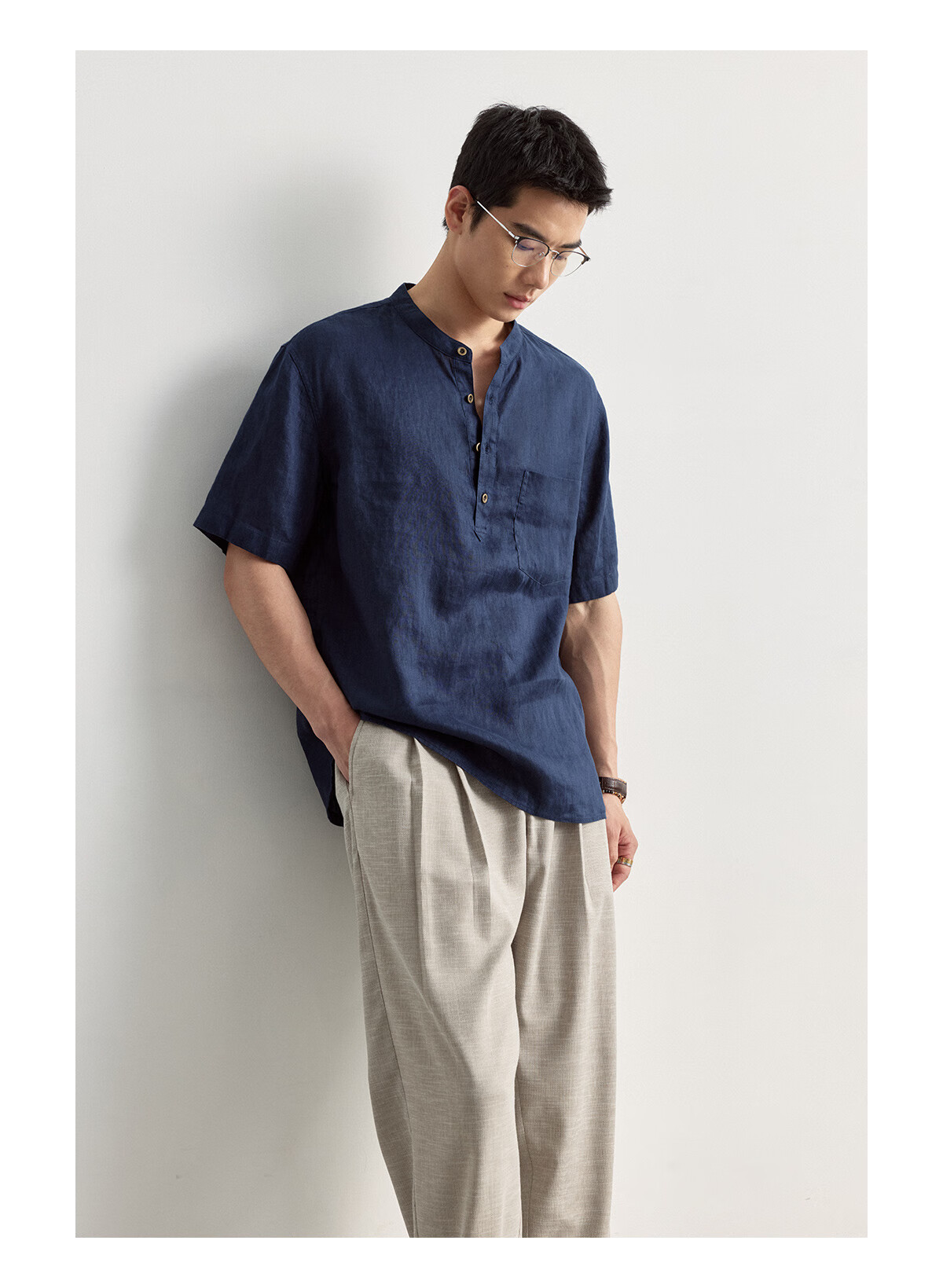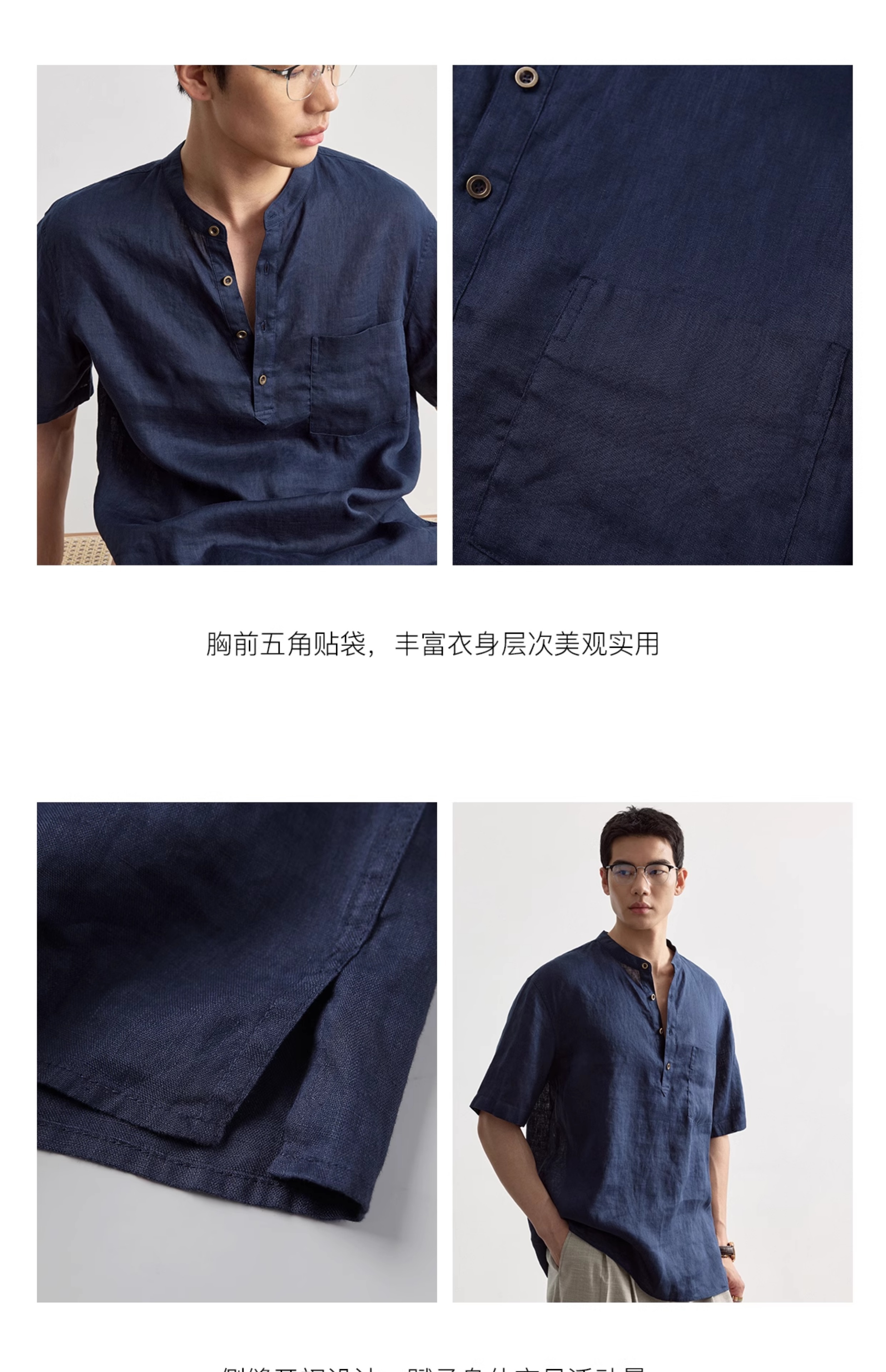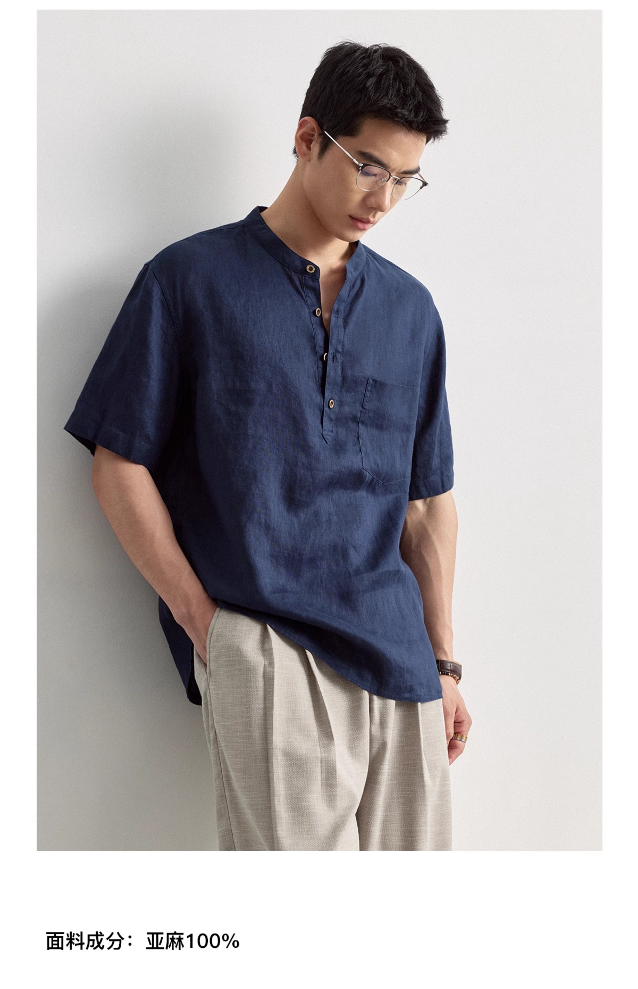 OSENS Men's Wear 21 Count 100% Natural Linen Vintage Henley Collar T-shirt Half-front Men's Short-Sleeved Shirt Summer Nautilus Ready in Stock M (170/92A)