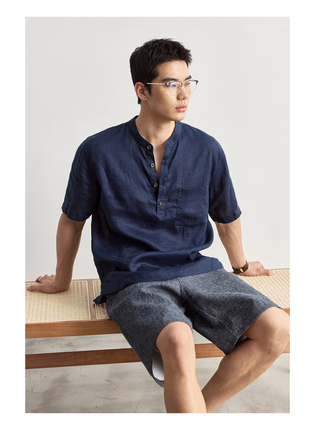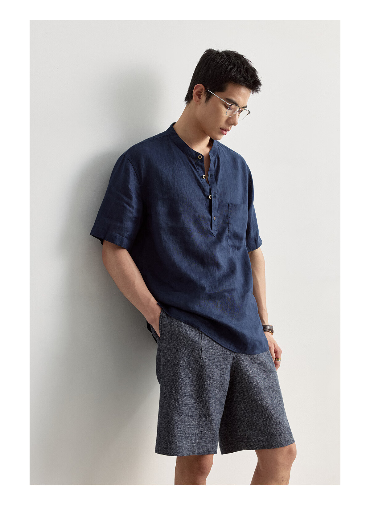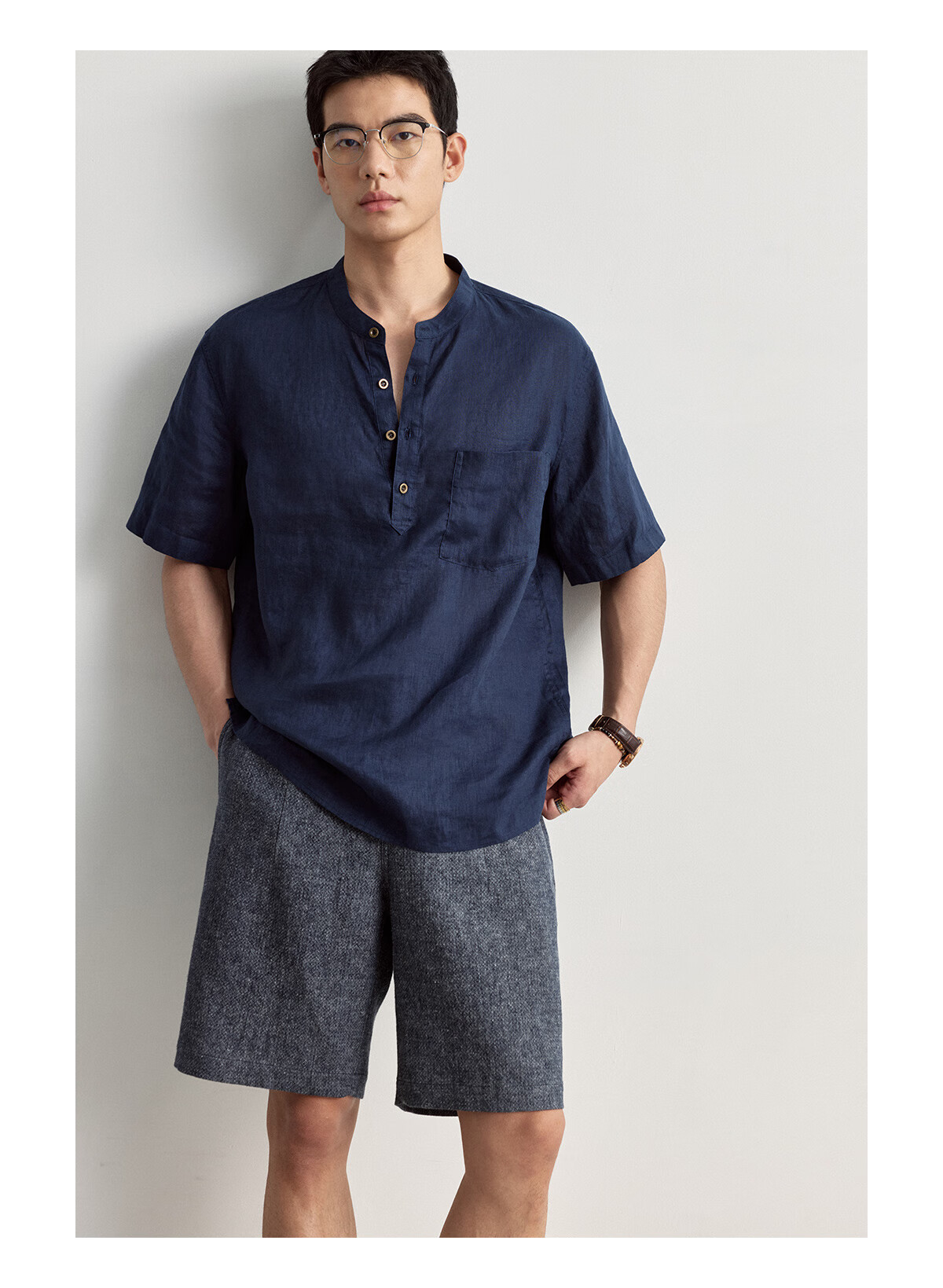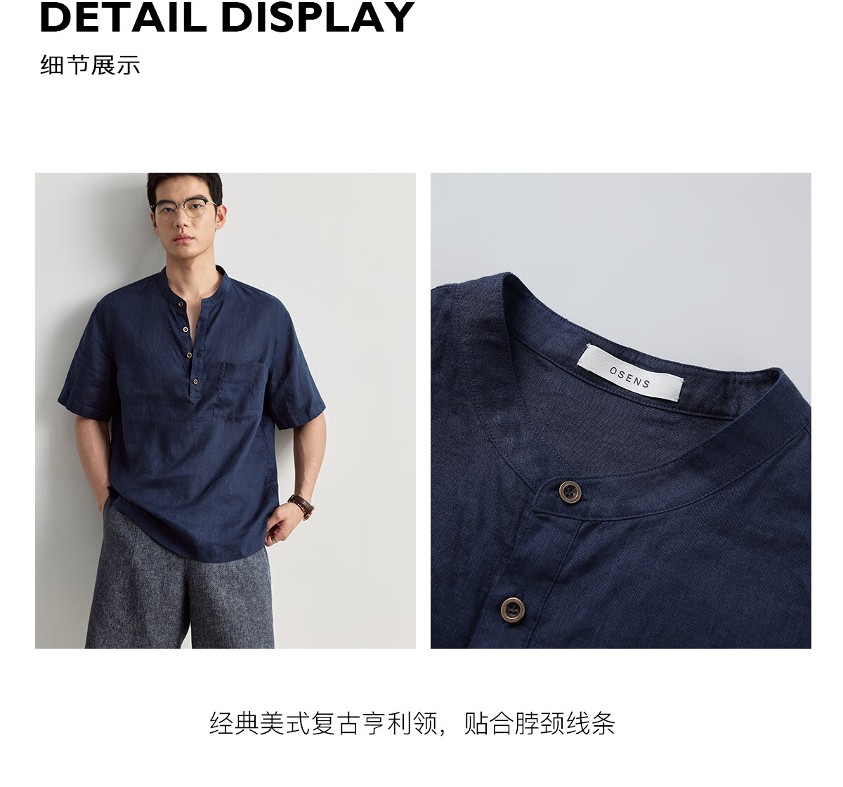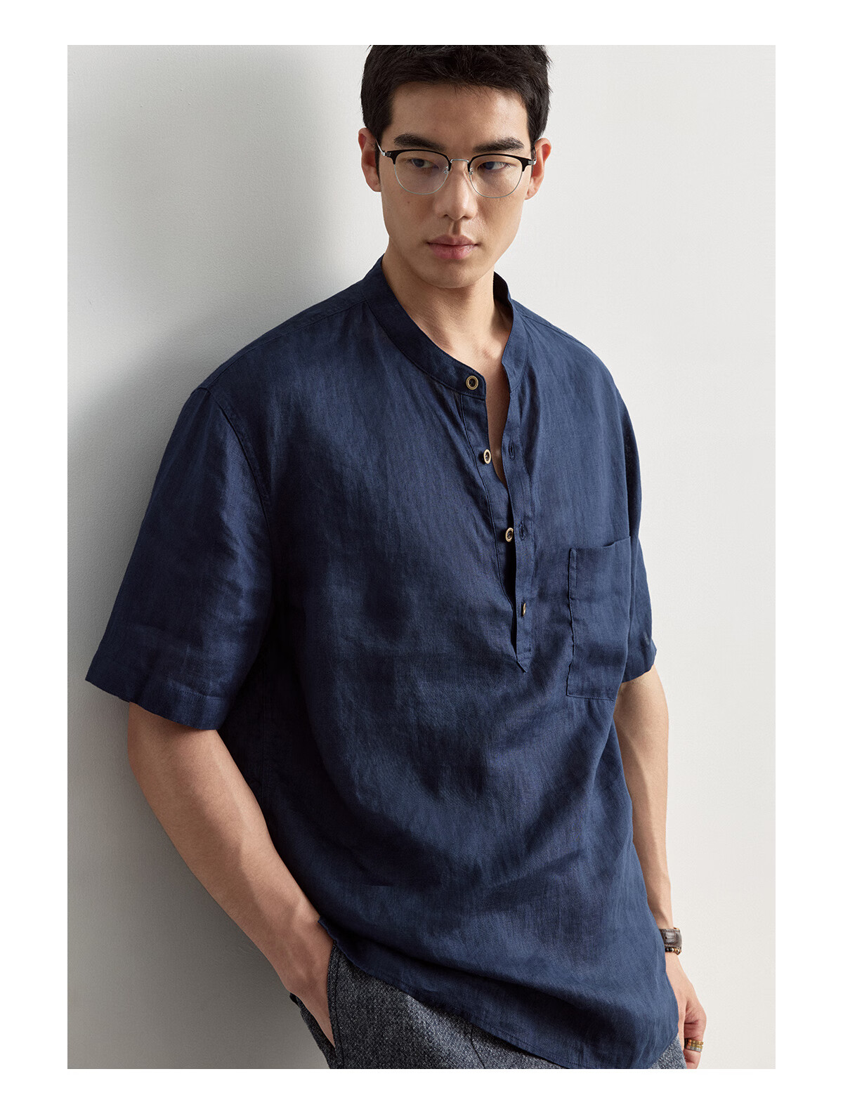 OSENS Men's Wear 21 Count 100% Natural Linen Vintage Henley Collar T-shirt Half-front Men's Short-Sleeved Shirt Summer Nautilus Ready in Stock M (170/92A)