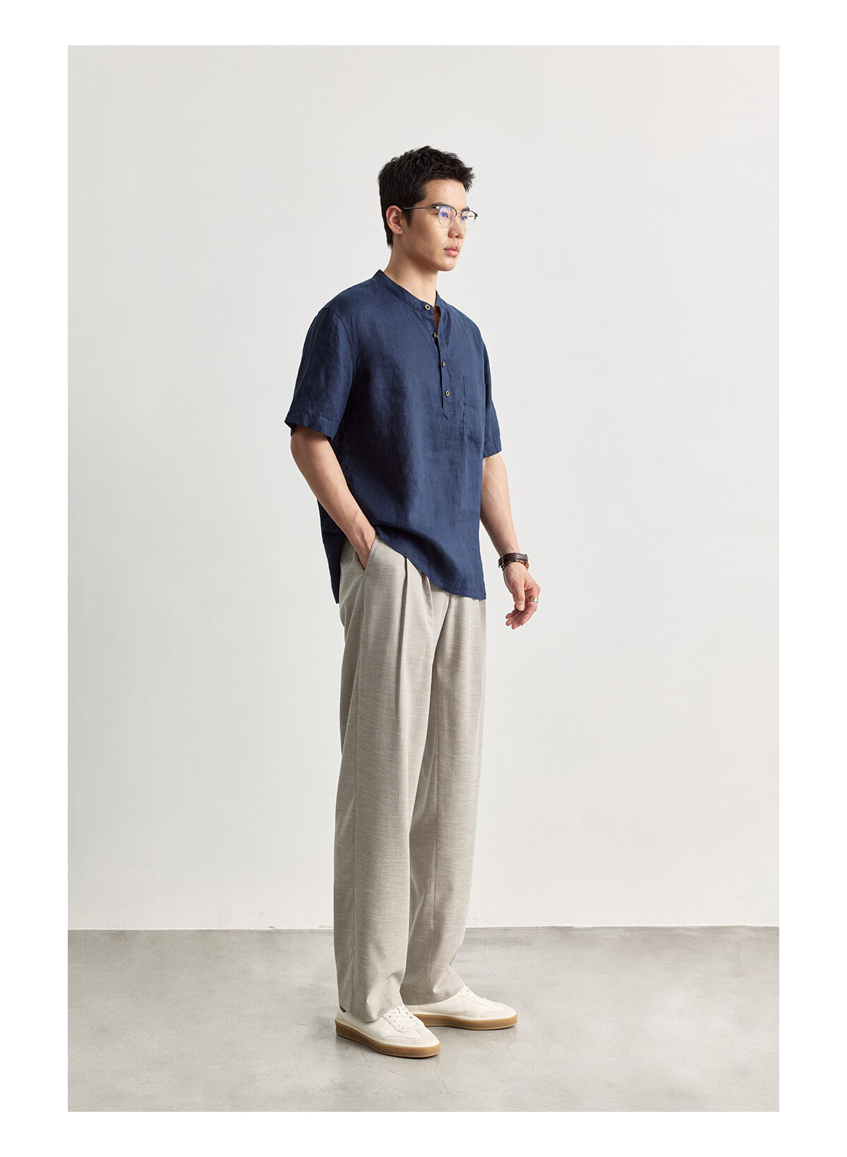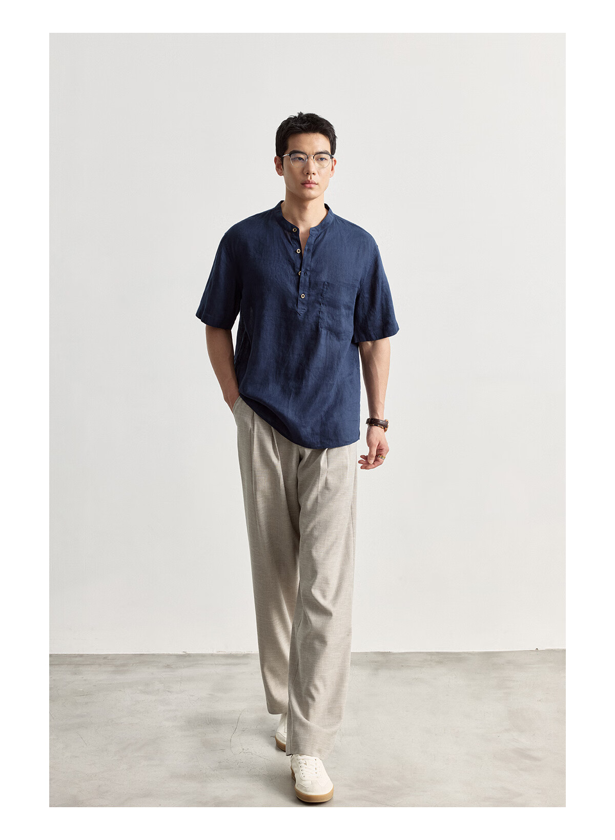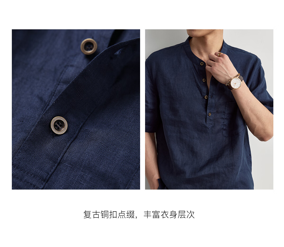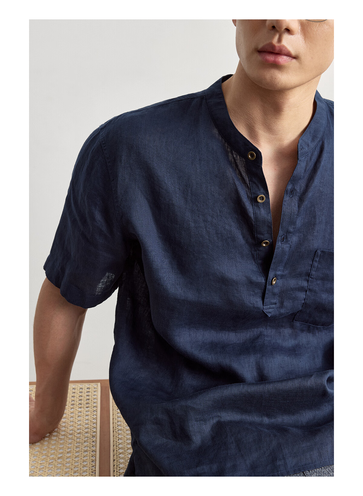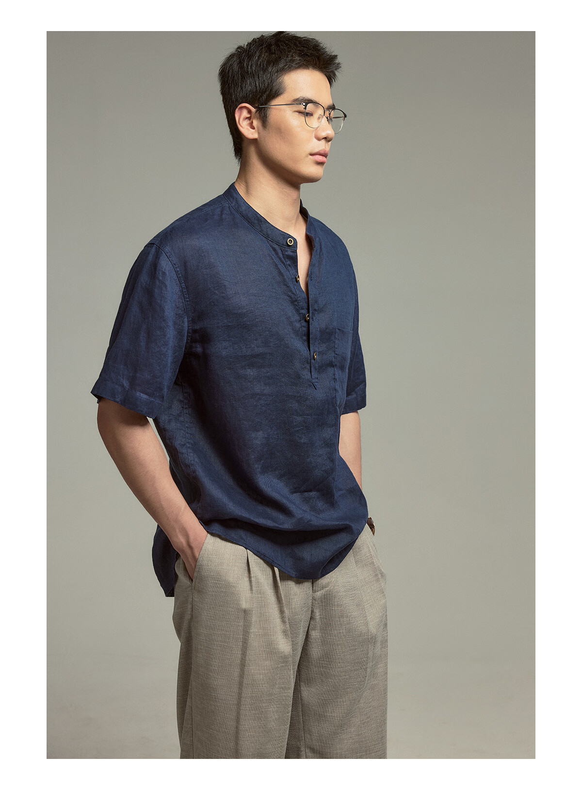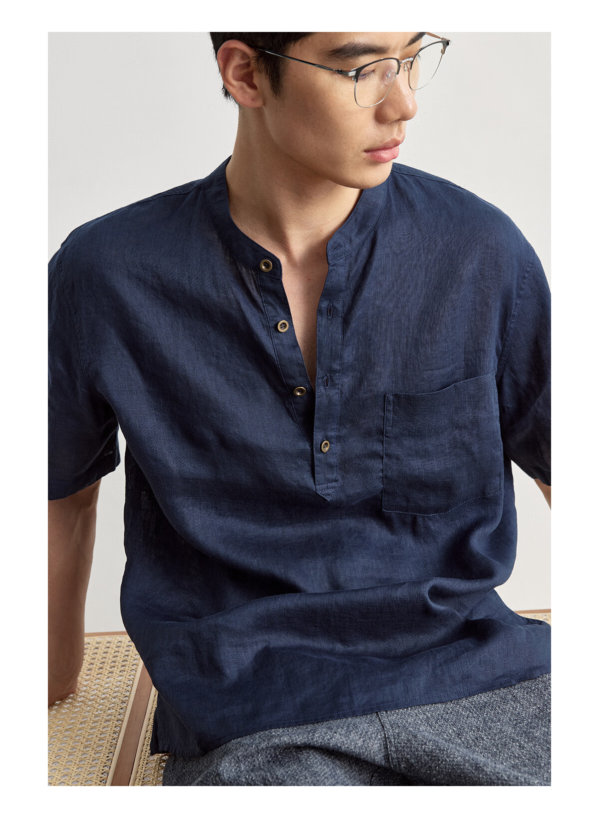 OSENS Men's Wear 21 Count 100% Natural Linen Vintage Henley Collar T-shirt Half-front Men's Short-Sleeved Shirt Summer Nautilus Ready in Stock M (170/92A)