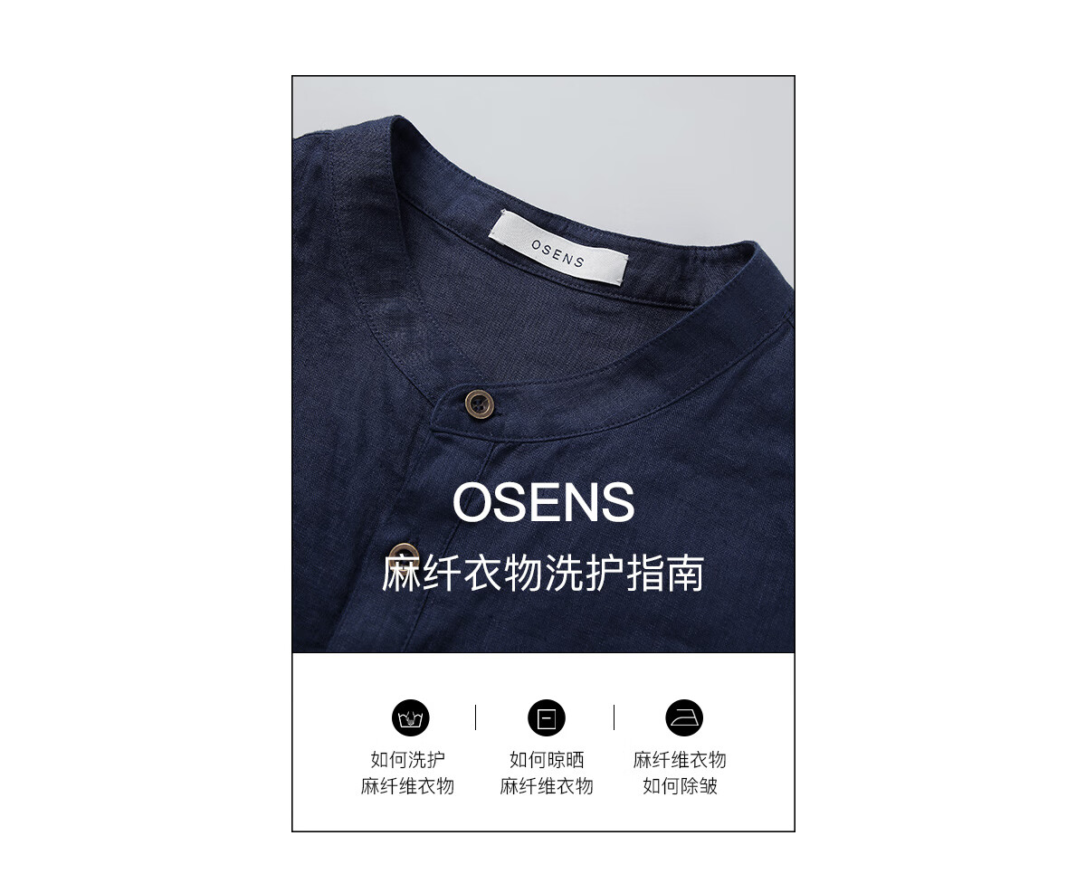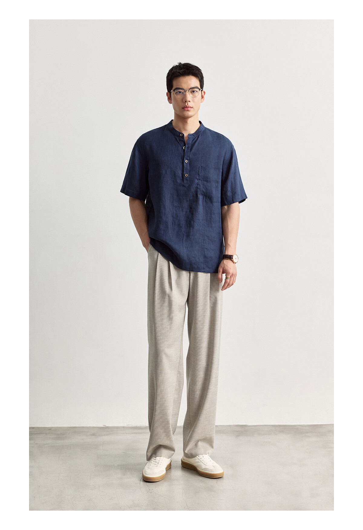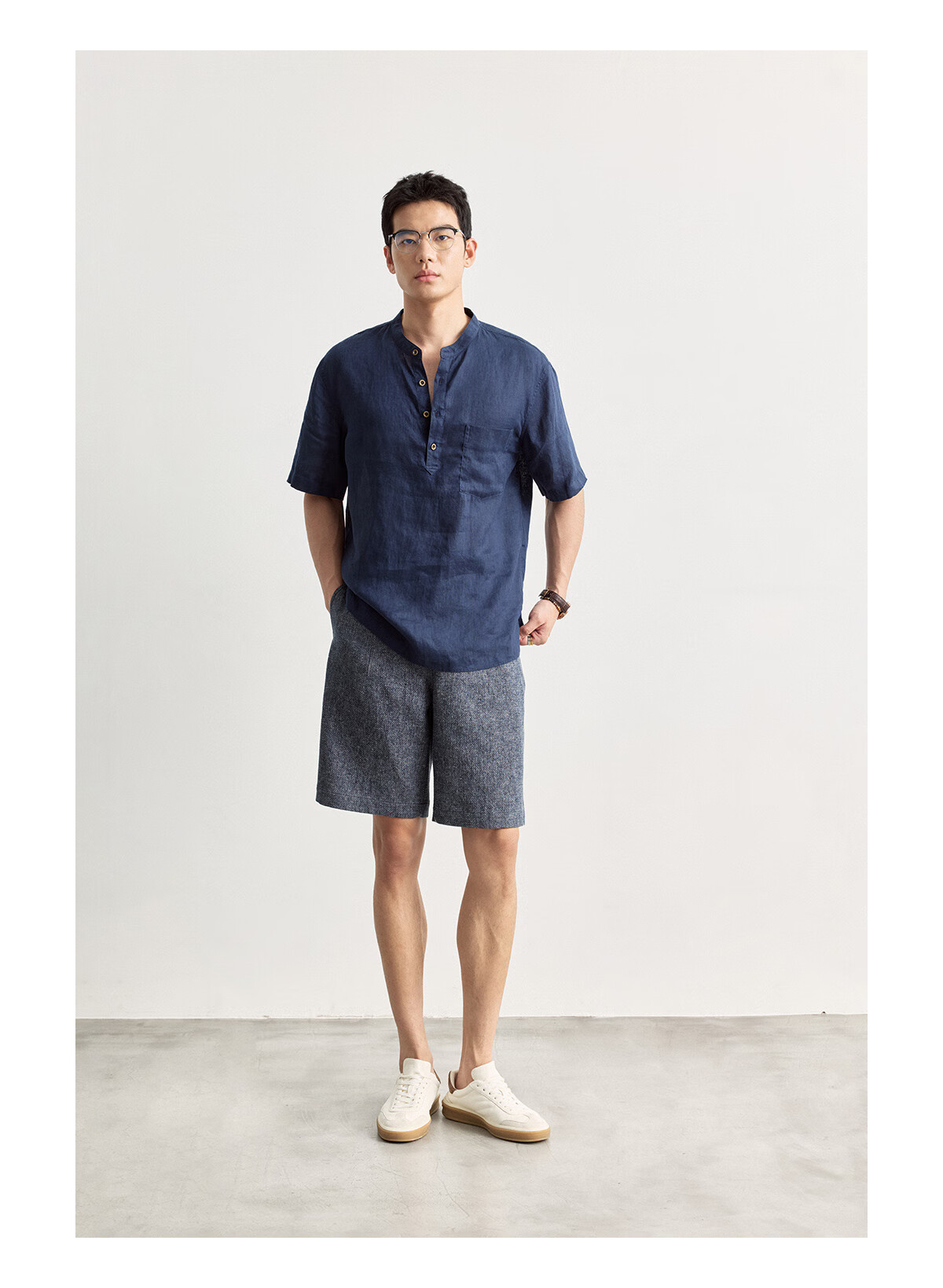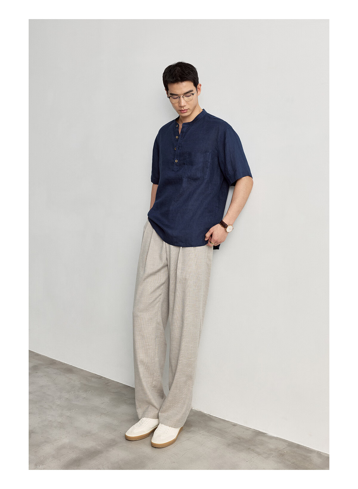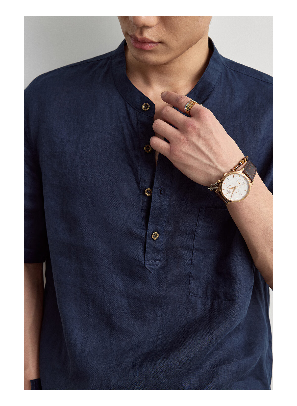OSENS Men's Wear 21 Count 100% Natural Linen Vintage Henley Collar T-shirt Half-front Men's Short-Sleeved Shirt Summer Nautilus Ready in Stock M (170/92A)