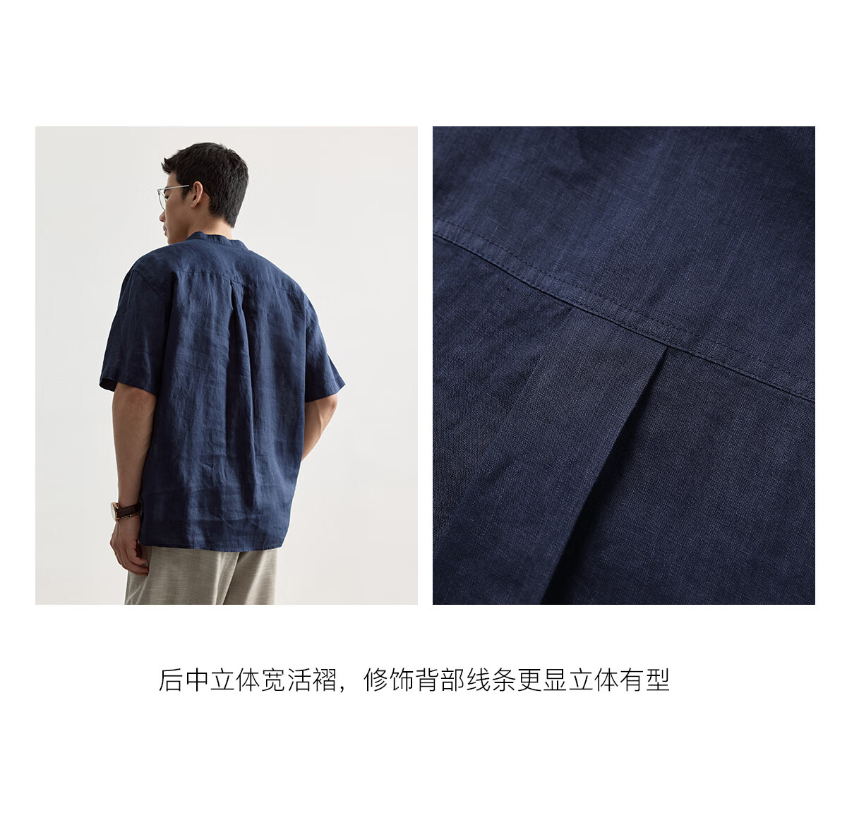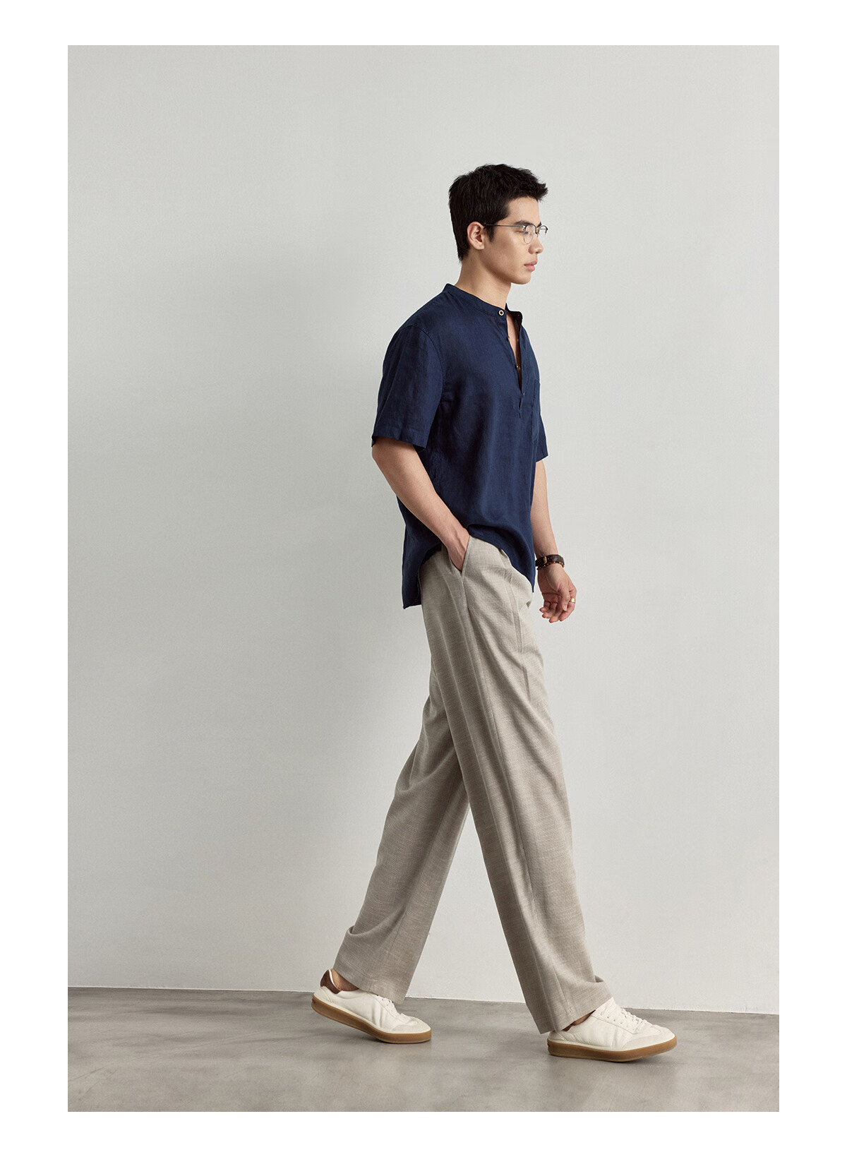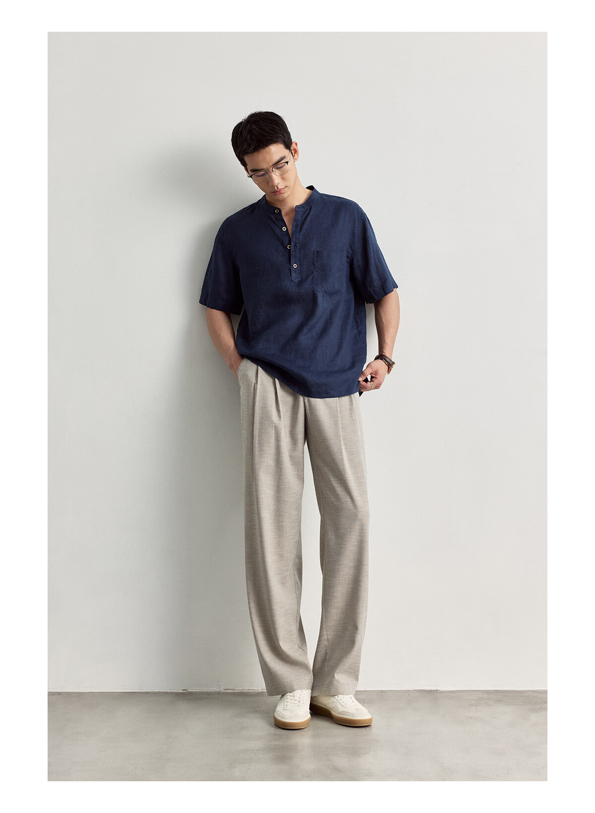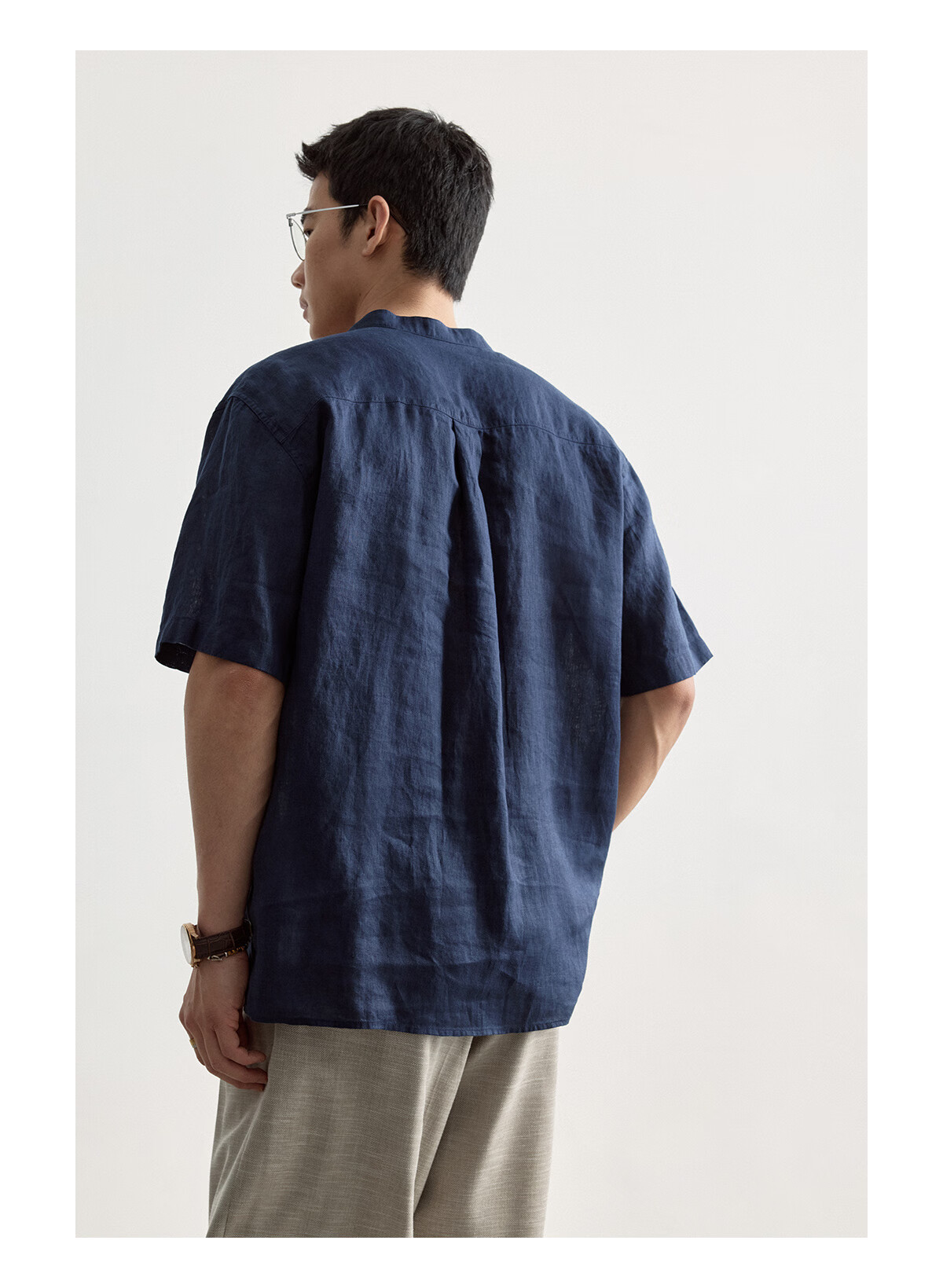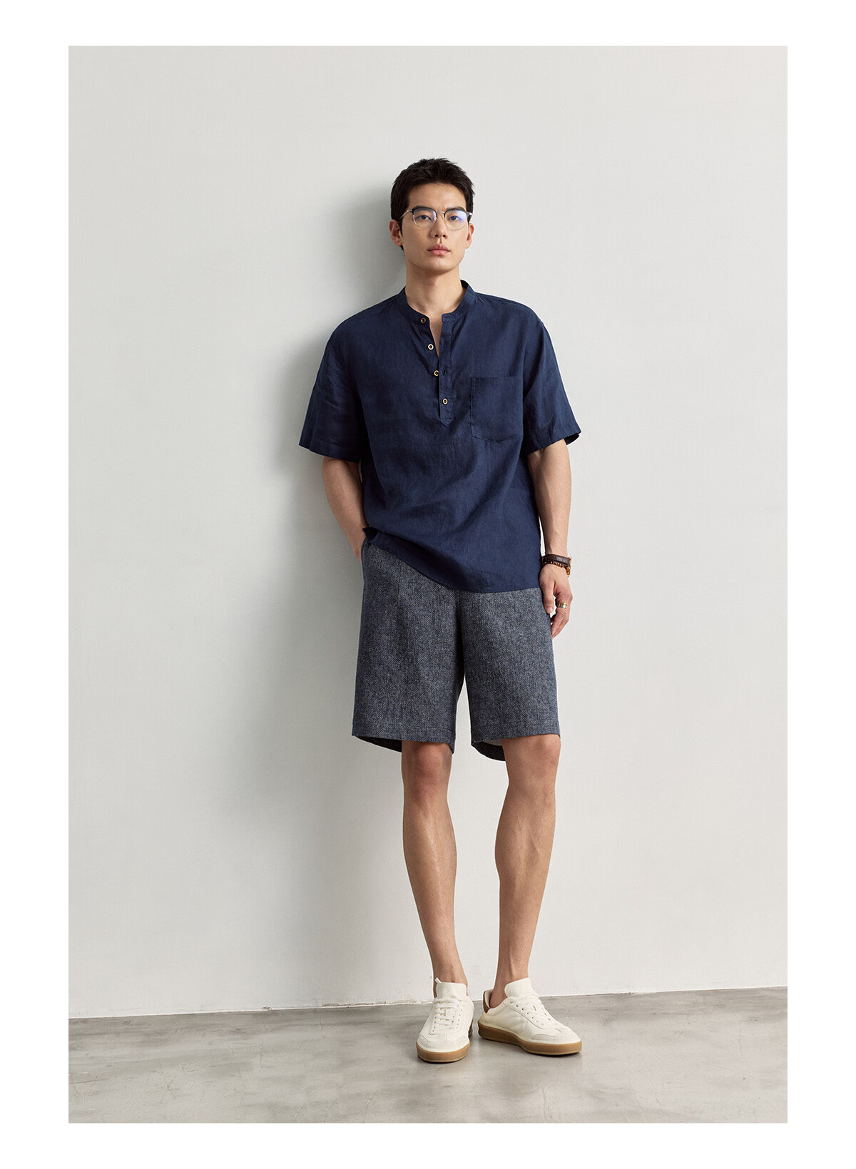 OSENS Men's Wear 21 Count 100% Natural Linen Vintage Henley Collar T-shirt Half-front Men's Short-Sleeved Shirt Summer Nautilus Ready in Stock M (170/92A)