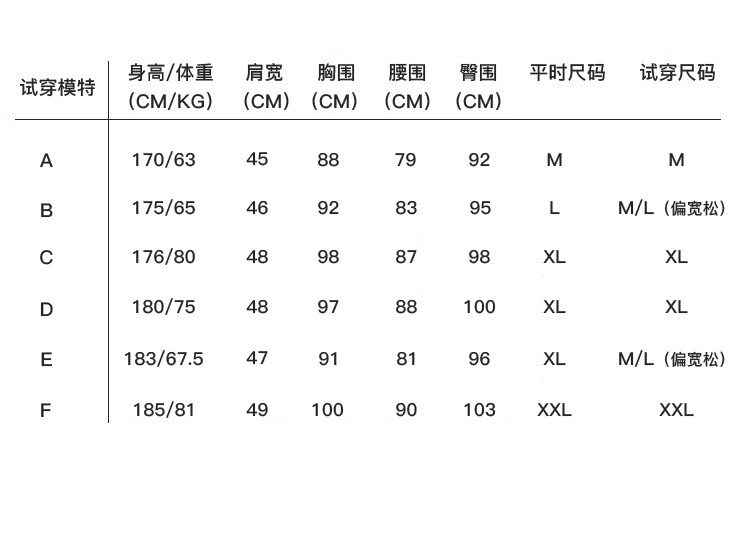 China (cm) 160-165/84-86 165-170 / 88-90 167-172 / 92-96 168-173 / 98-102 170-176 / 106-110