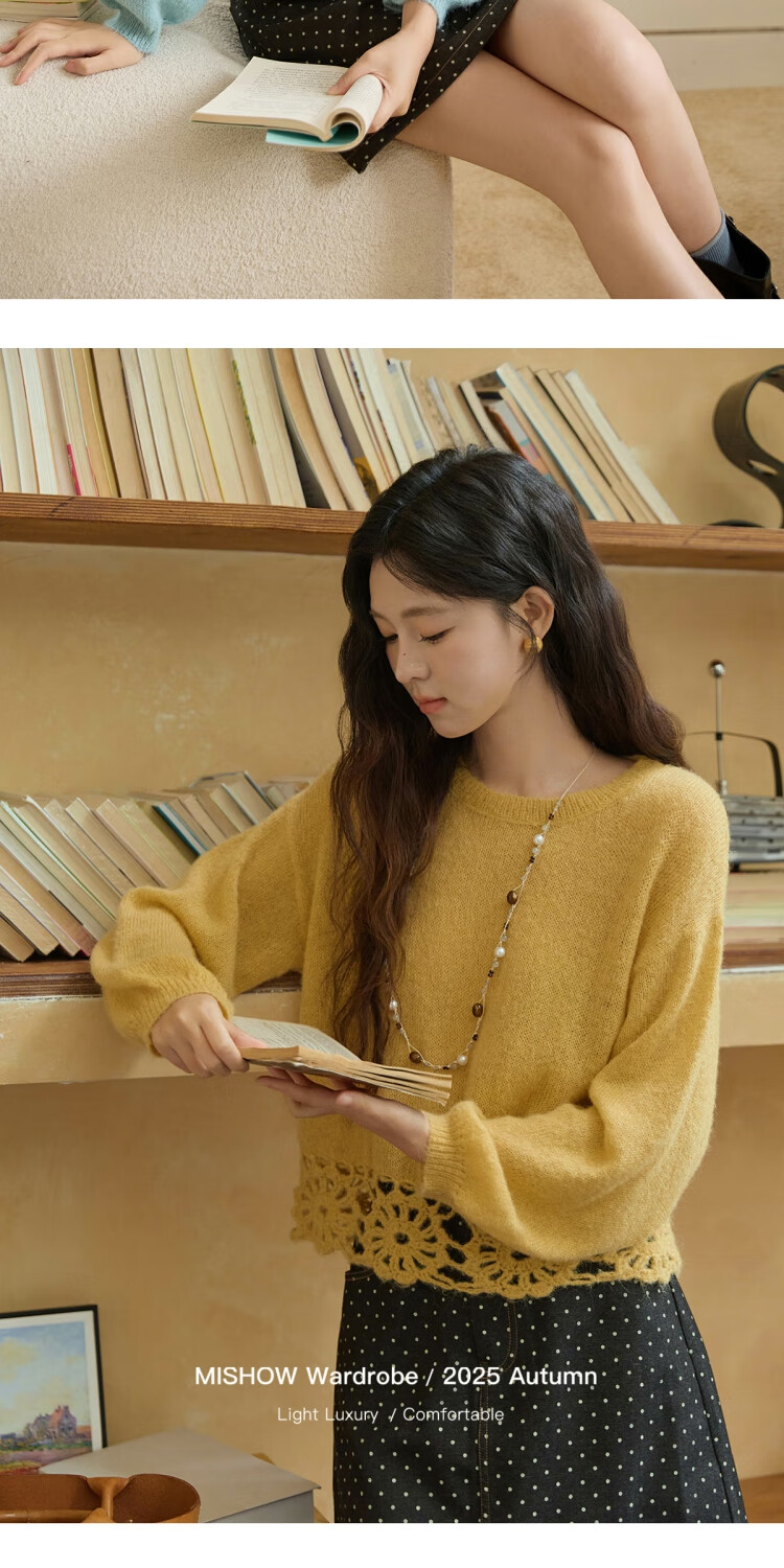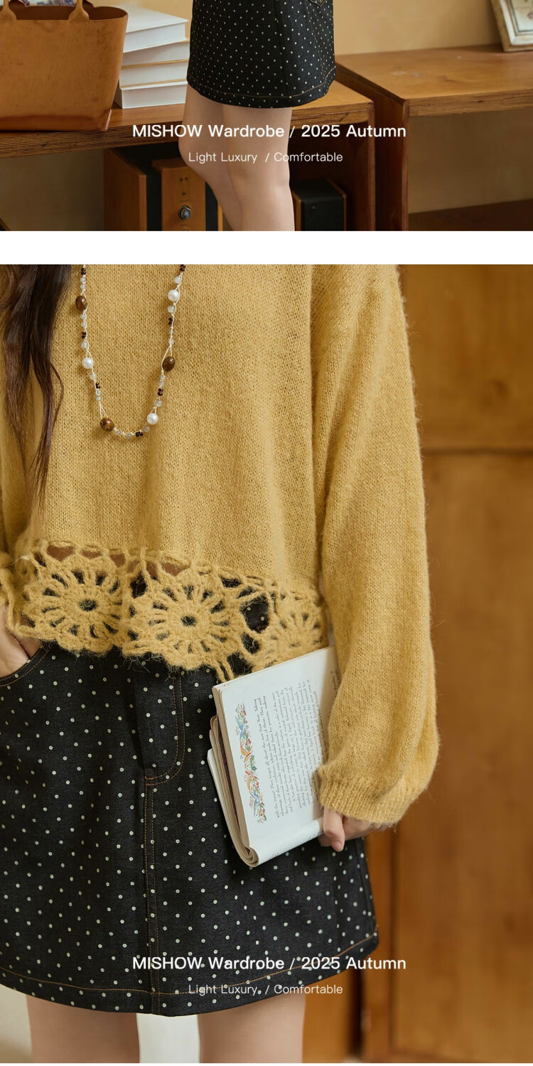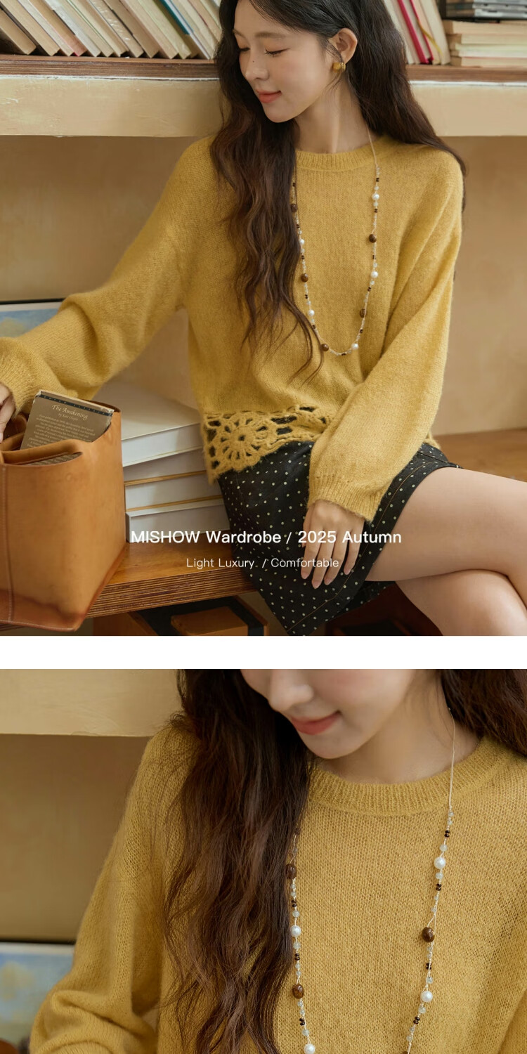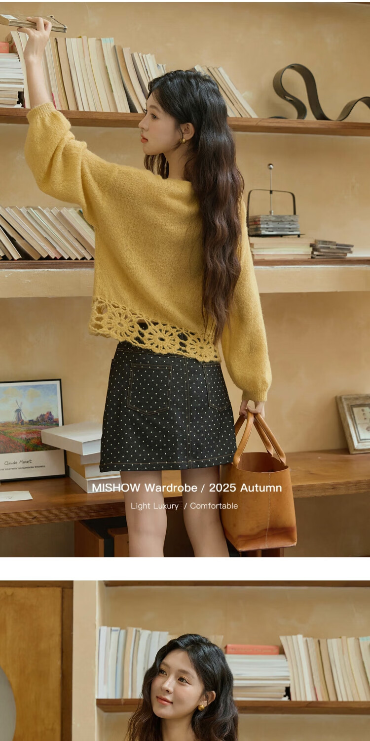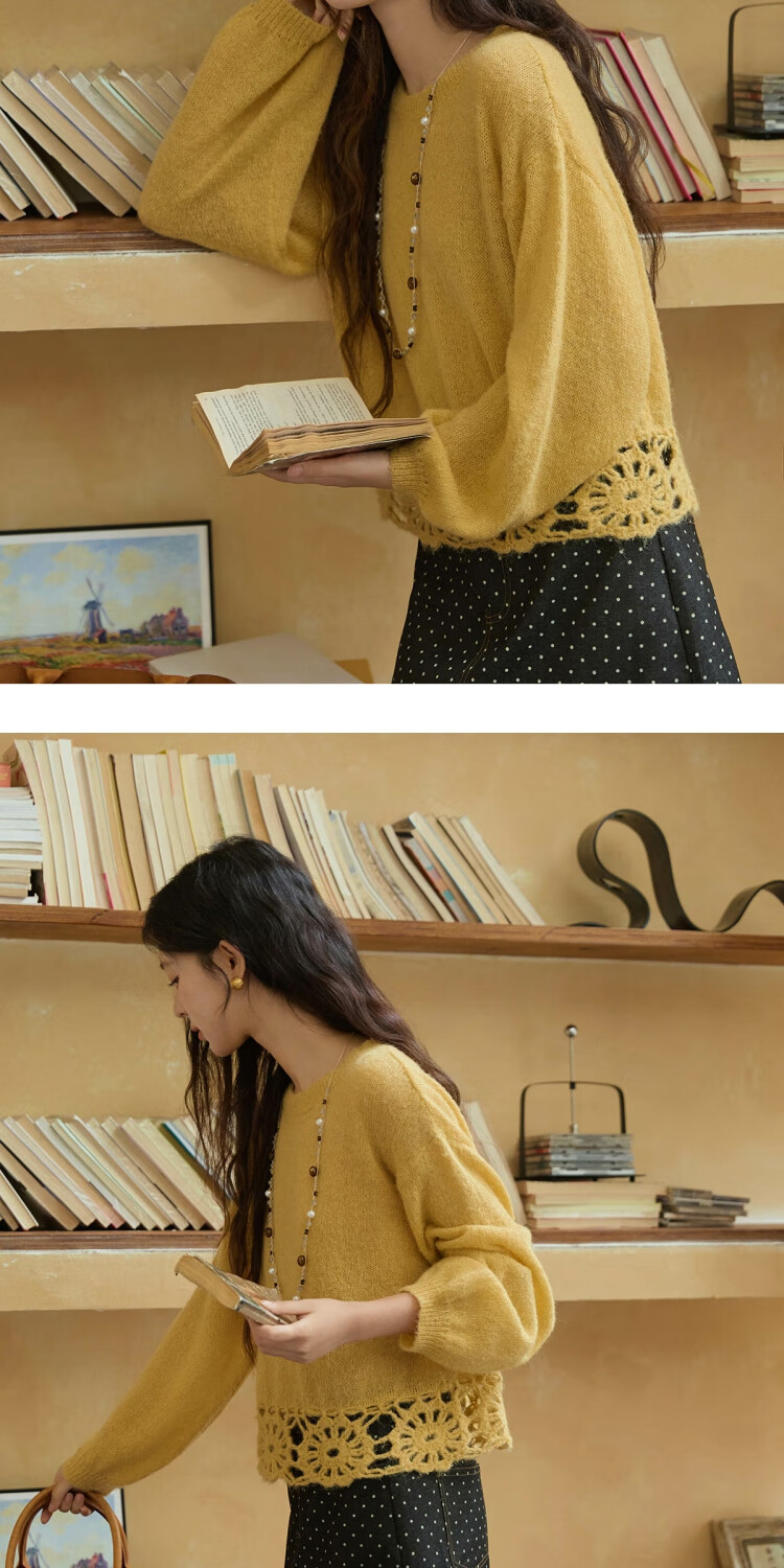Mystery Show Thin Crocheted Sweater Women's 2025 Autumn New Loose Hollow Lazy Wool Top Lemon Yellow M