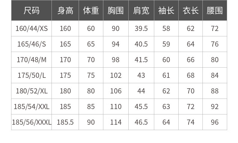 China (cm) 160-165/84-86 165-170 / 88-90 167-172 / 92-96 168-173 / 98-102 170-176 / 106-110