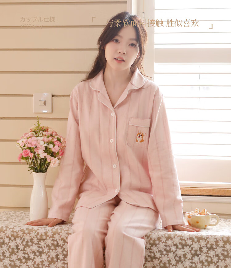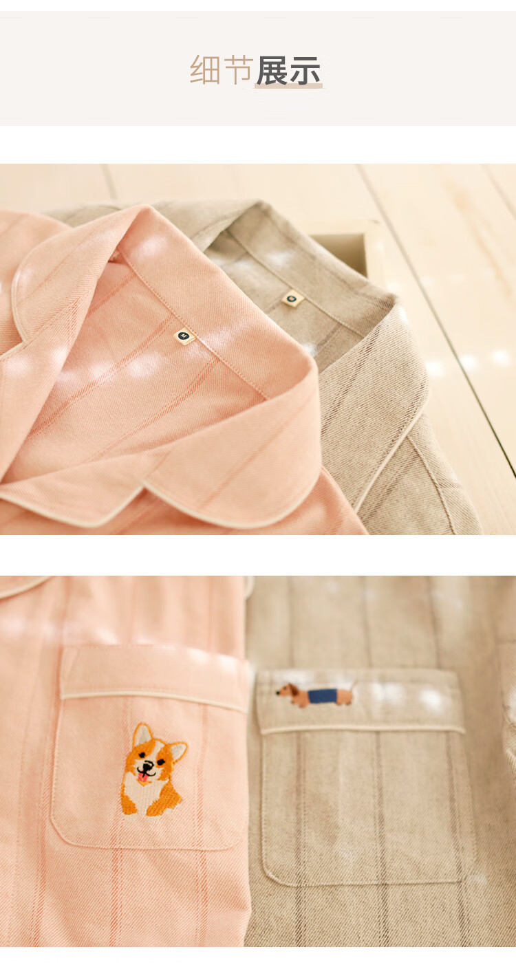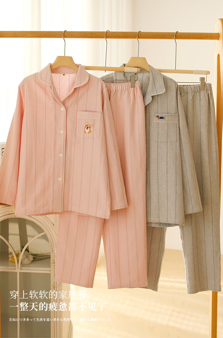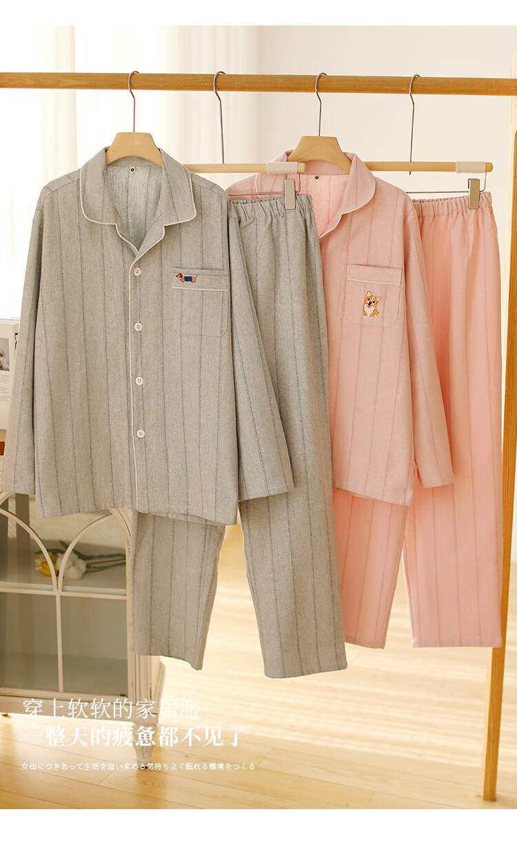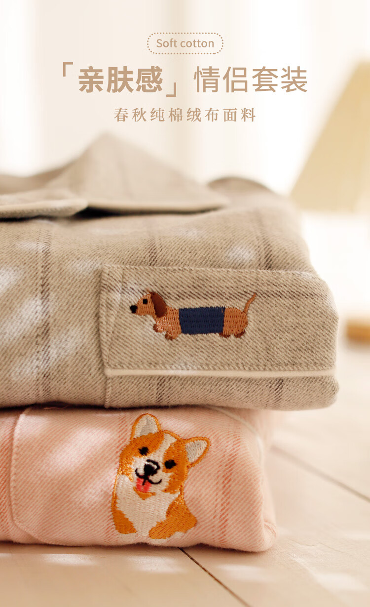 First look for autumn and winter couples pure cotton flannel long-sleeved trousers pajamas simple cartoon embroidery women's casual large size home clothes light pink women's L