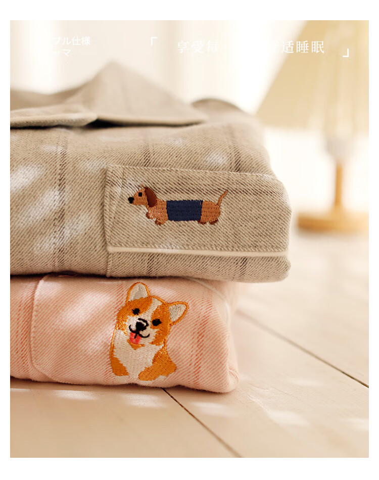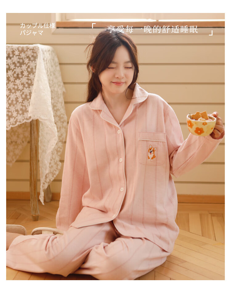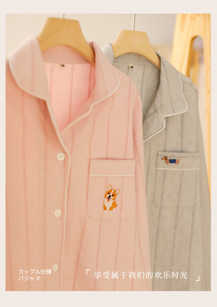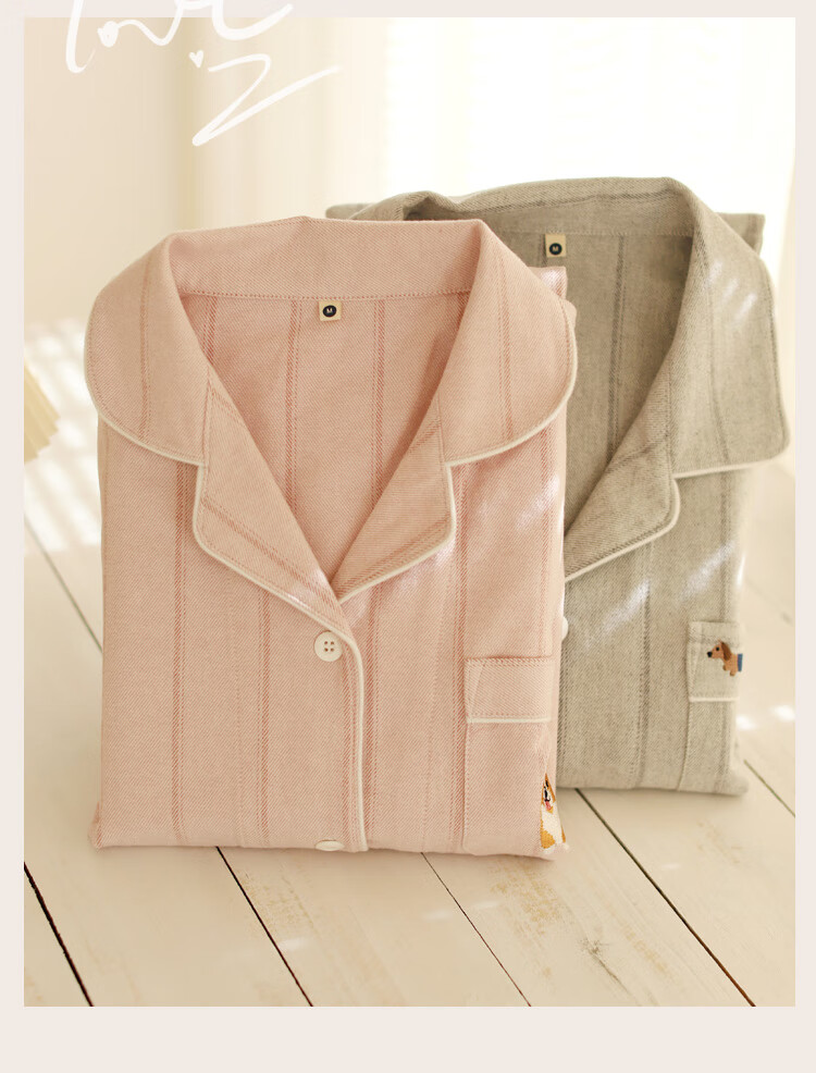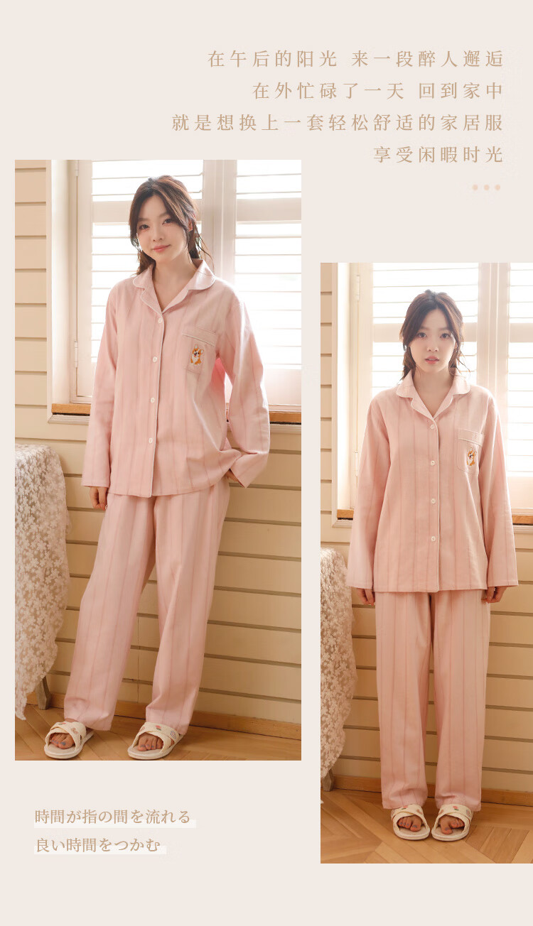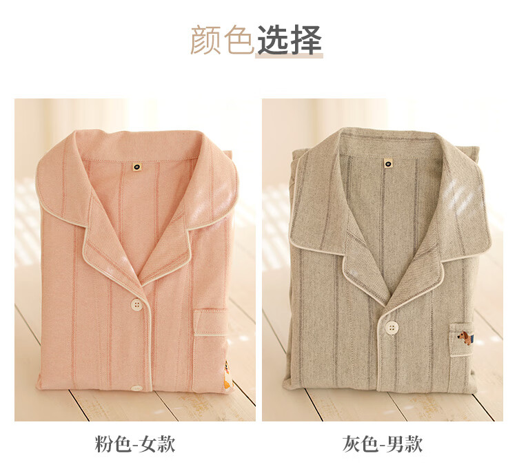 First look for autumn and winter couples pure cotton flannel long-sleeved trousers pajamas simple cartoon embroidery women's casual large size home clothes light pink women's L