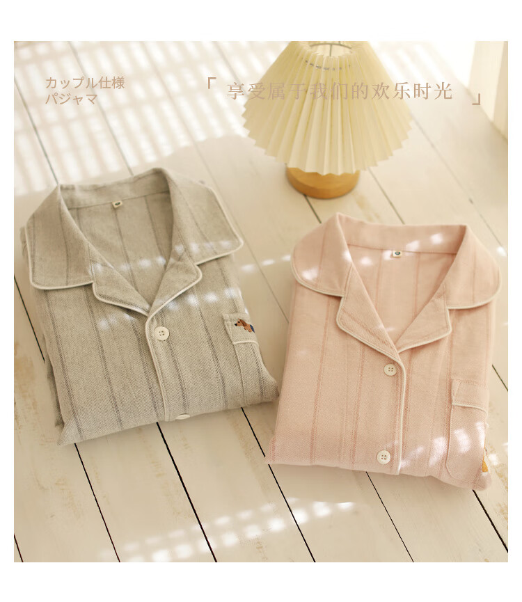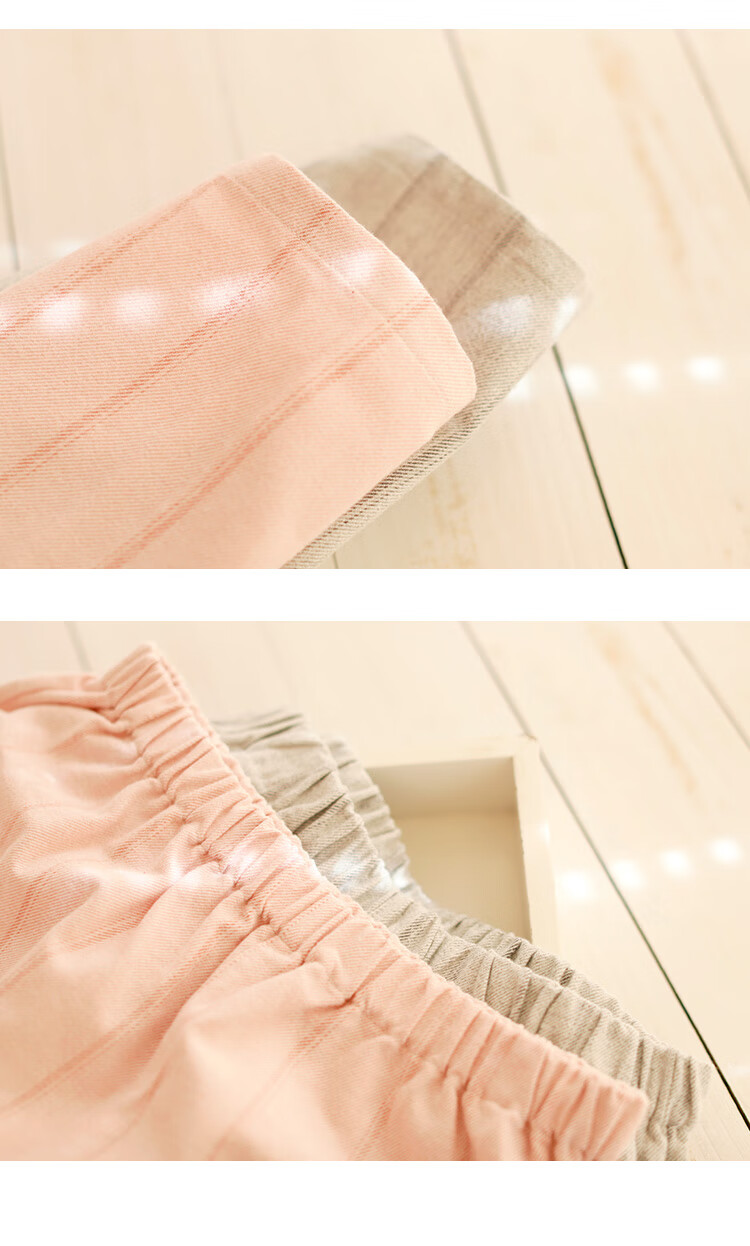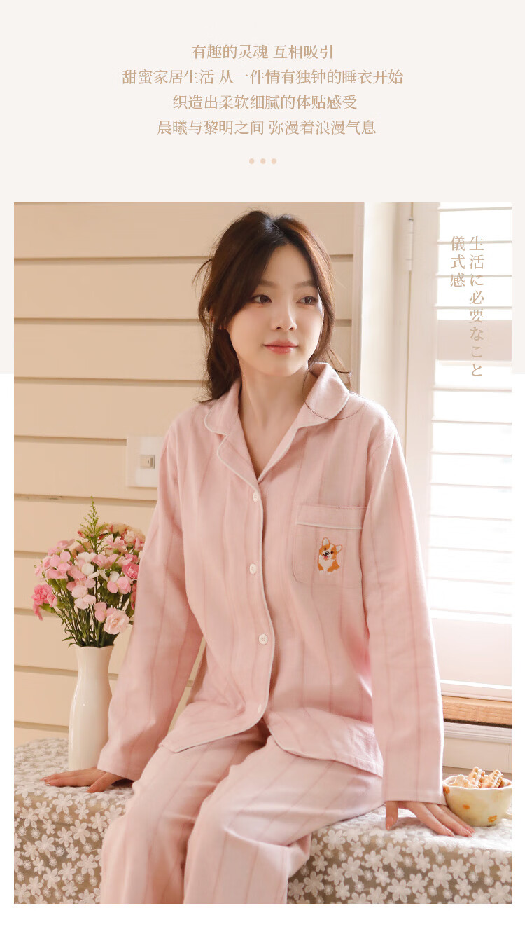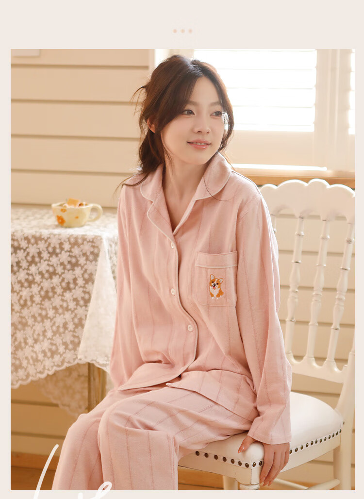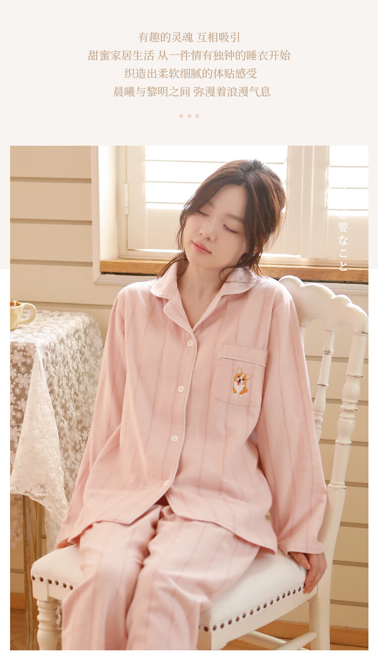 First look for autumn and winter couples pure cotton flannel long-sleeved trousers pajamas simple cartoon embroidery women's casual large size home clothes light pink women's L