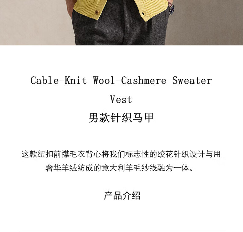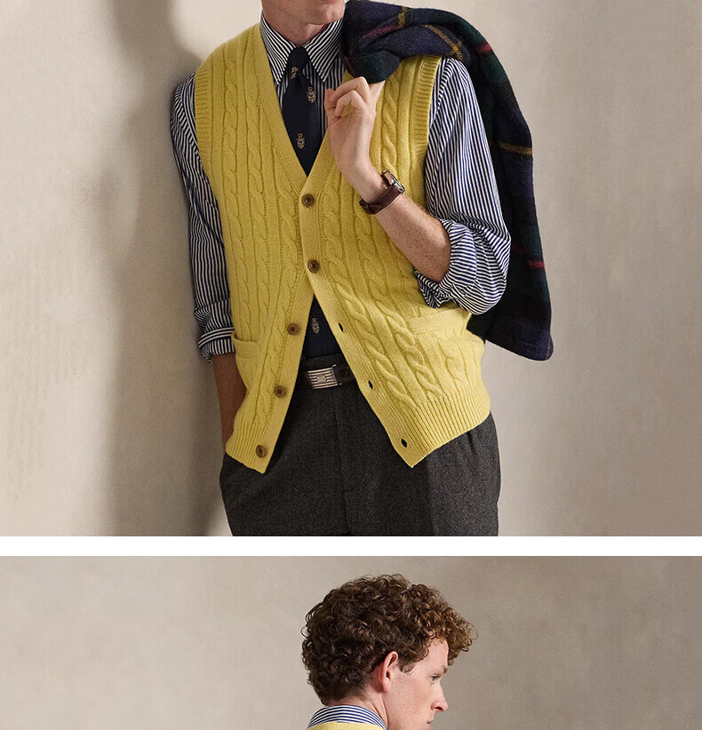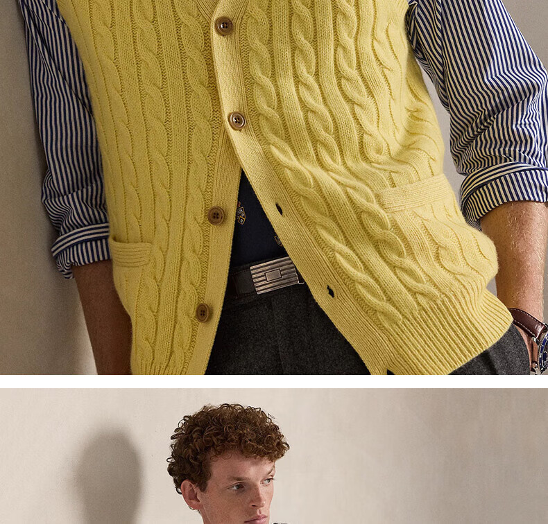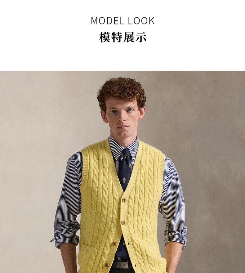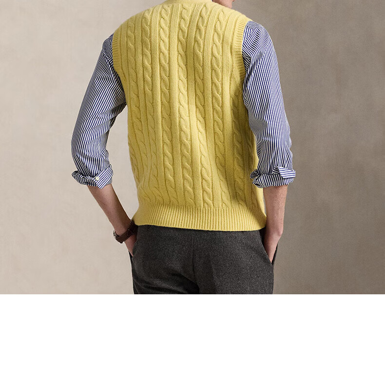 RALPH LAUREN Ralph Lauren Autumn and Winter New American Edition Men's Knitted Wool Vest Cable-Knit Cable Knit Cardigan Vest Yellow/Fall Yellow XS