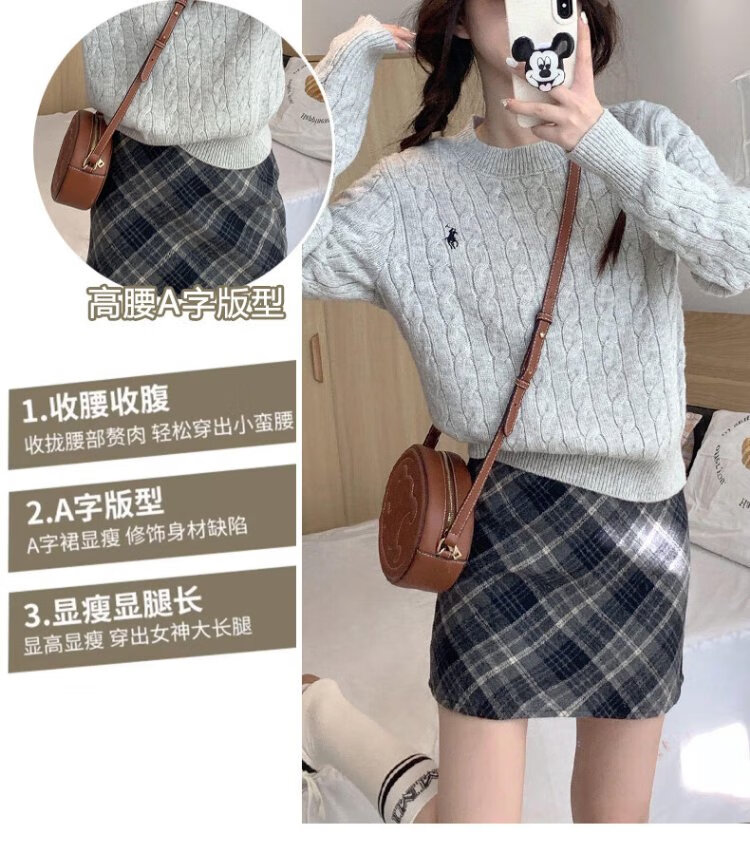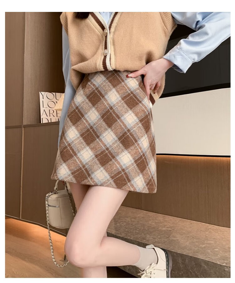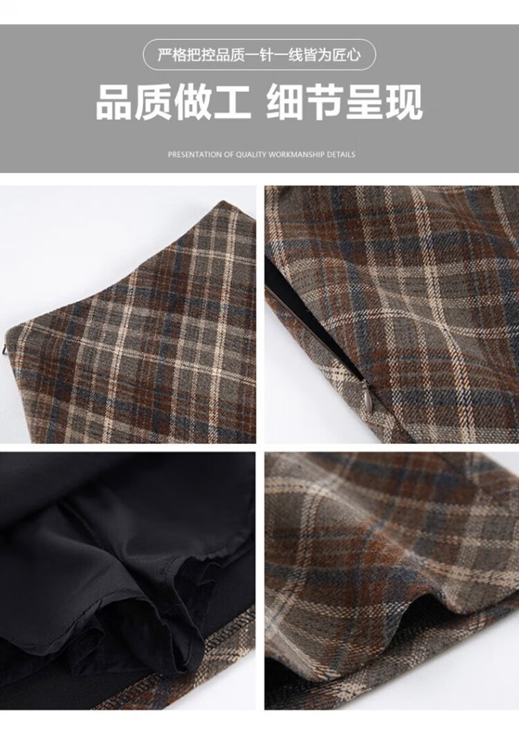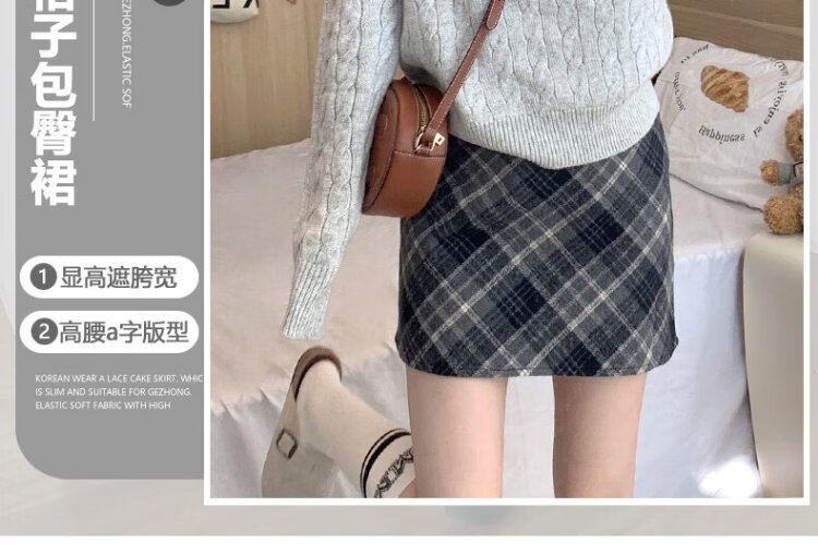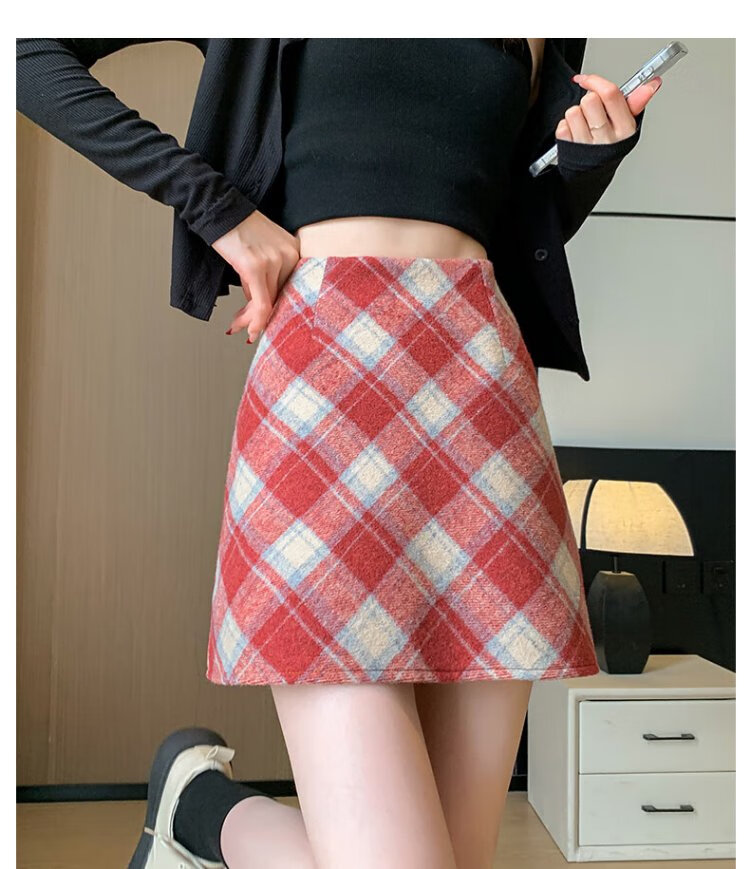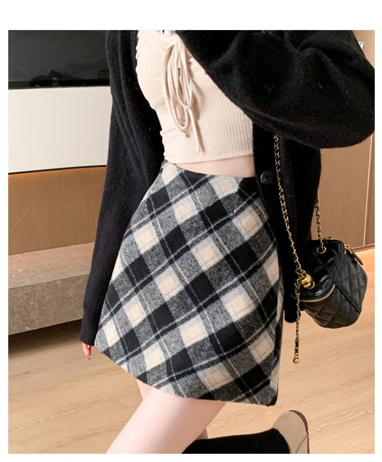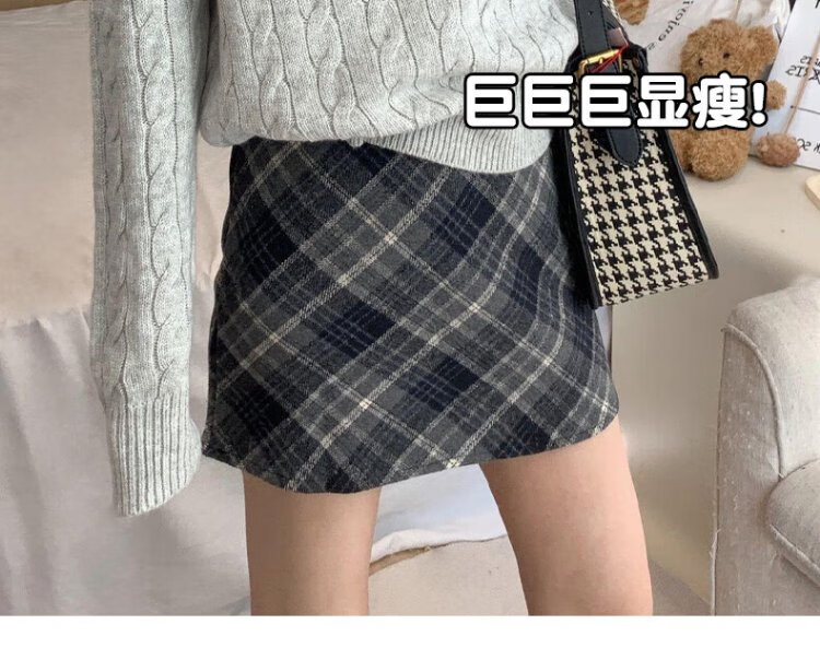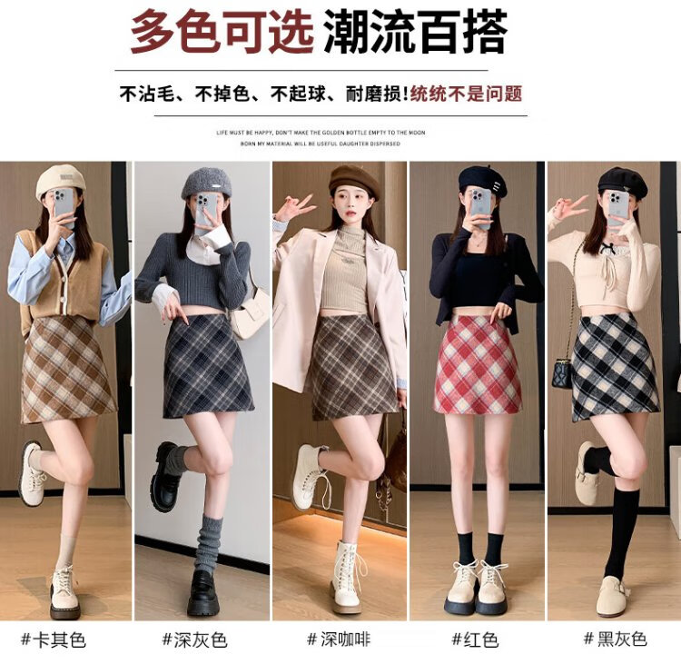 Langsha Plaid Skirt Women's 2025 Autumn and Winter New Woolen Hip Skirt Korean Style A-Line Short Skirt Plus Velvet Warm Bottoming Skirt Dark Gray Small Plaid Skin Friendly Wool Comes with Lining M Weight 96-110 Jin Jin equals 0.5 kg Waist 68CM Hips 92CM