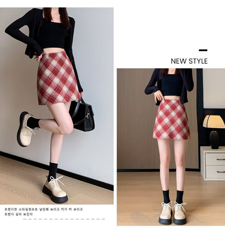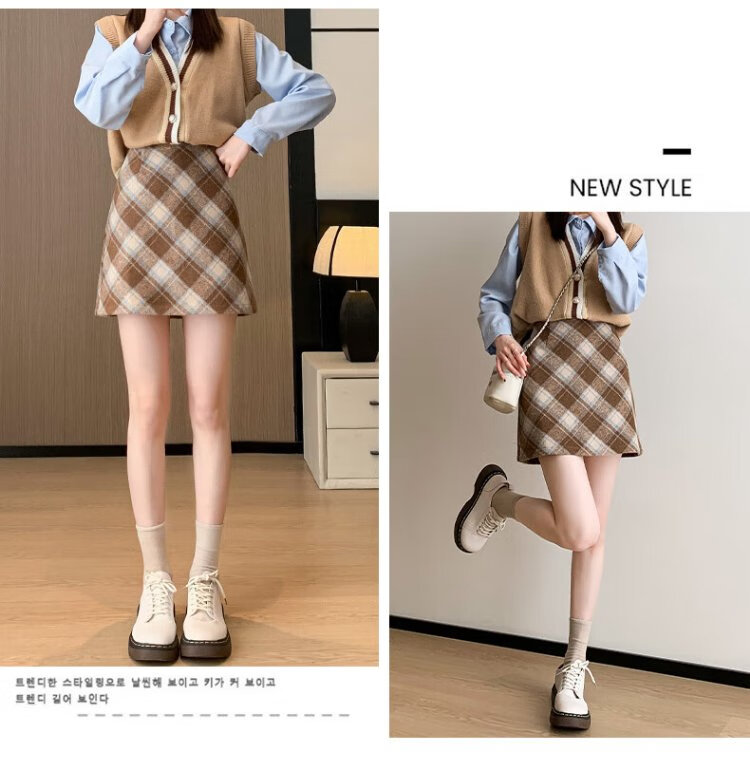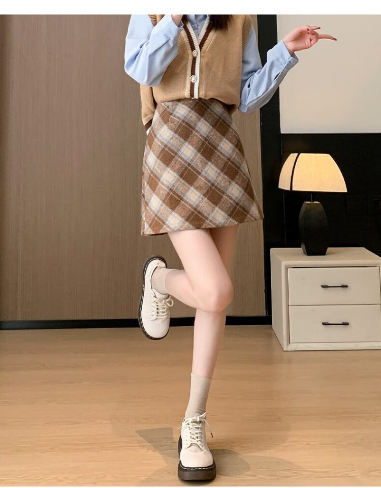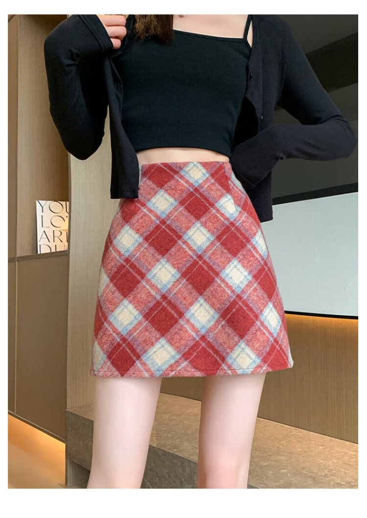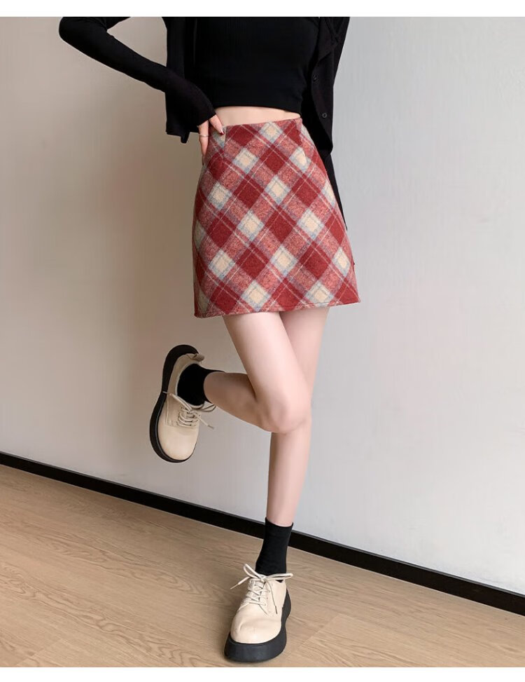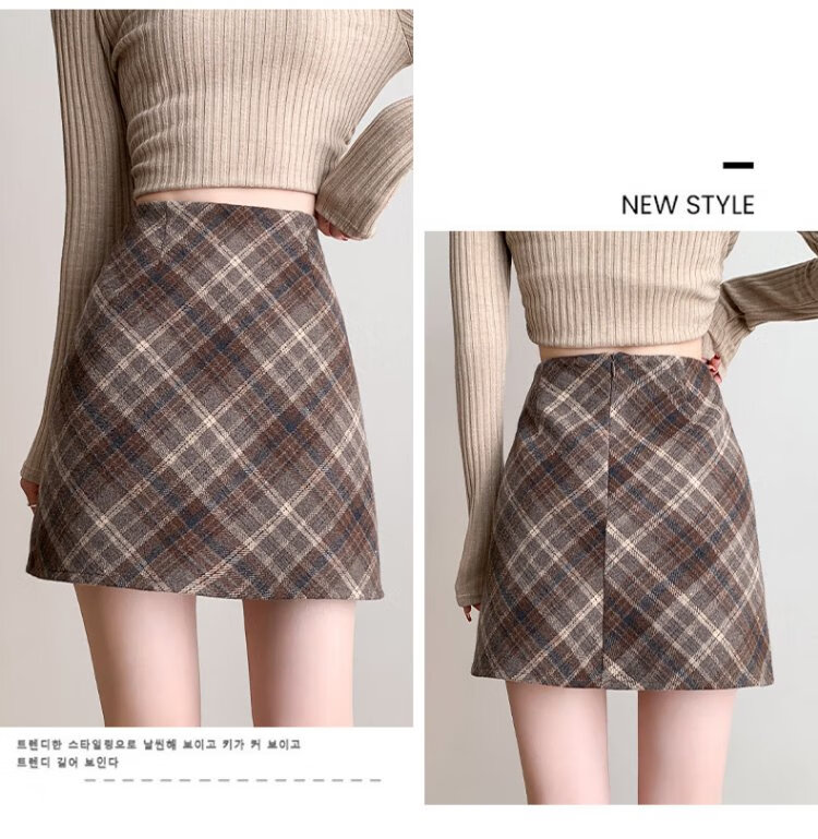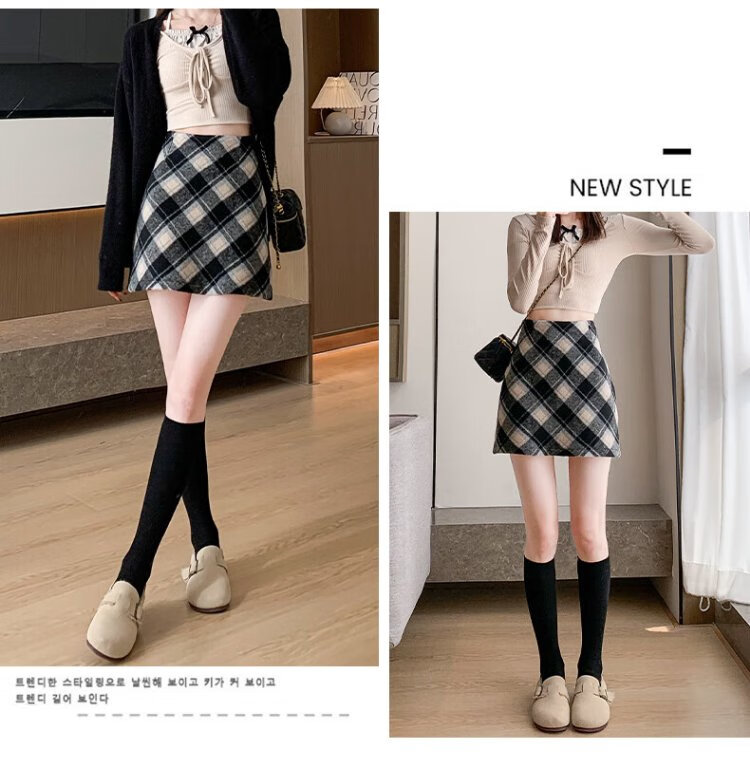 Langsha Plaid Skirt Women's 2025 Autumn and Winter New Woolen Hip Skirt Korean Style A-Line Short Skirt Plus Velvet Warm Bottoming Skirt Dark Gray Small Plaid Skin Friendly Wool Comes with Lining M Weight 96-110 Jin Jin equals 0.5 kg Waist 68CM Hips 92CM