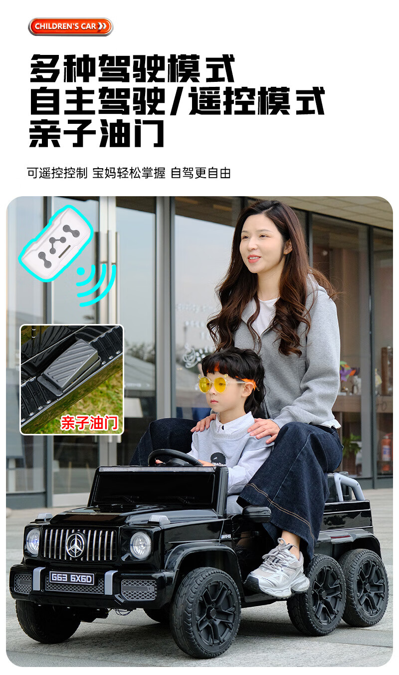 HERO THRIVE Mercedes-Benz children's electric four-wheel off-road car for boys and girls, six-wheel drive, can sit in adults' self-driving remote control parent-child toy car, painted black six-wheel drive + leather seat + full function + dual throttle + silent wheel + 12V7A Super Power battery