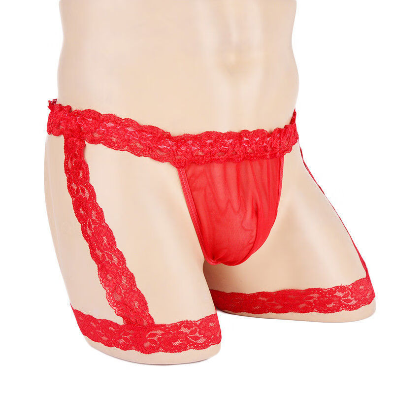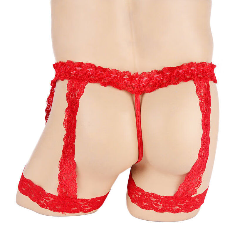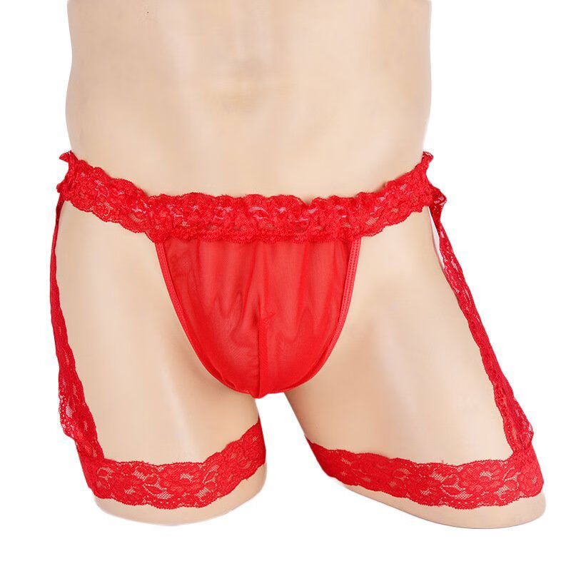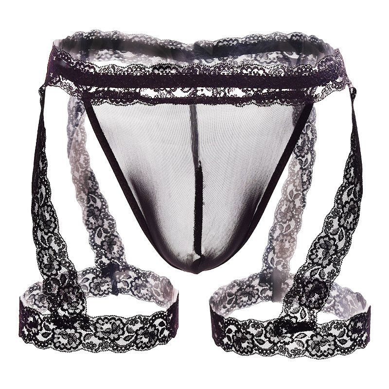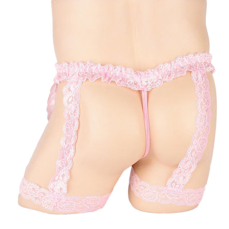 Lace suspender thong men's transvestite sexy underwear transparent mesh thong leggings short pink one size
