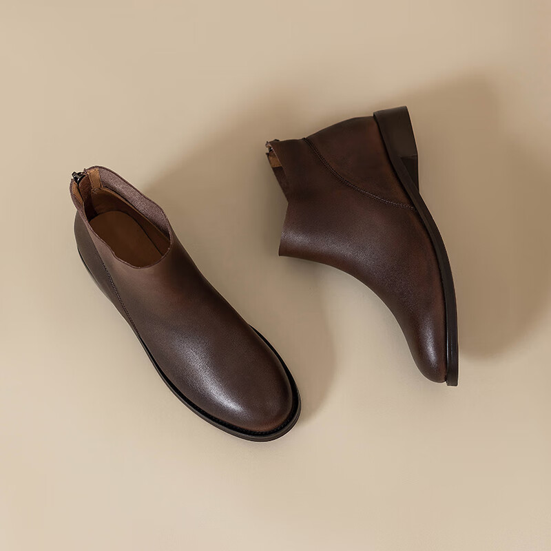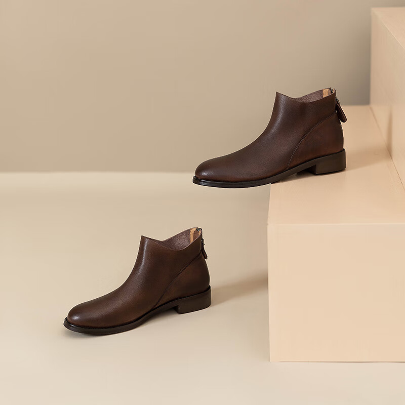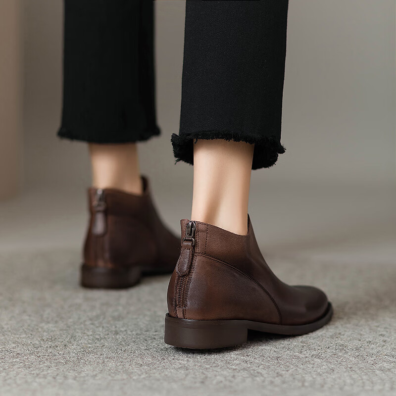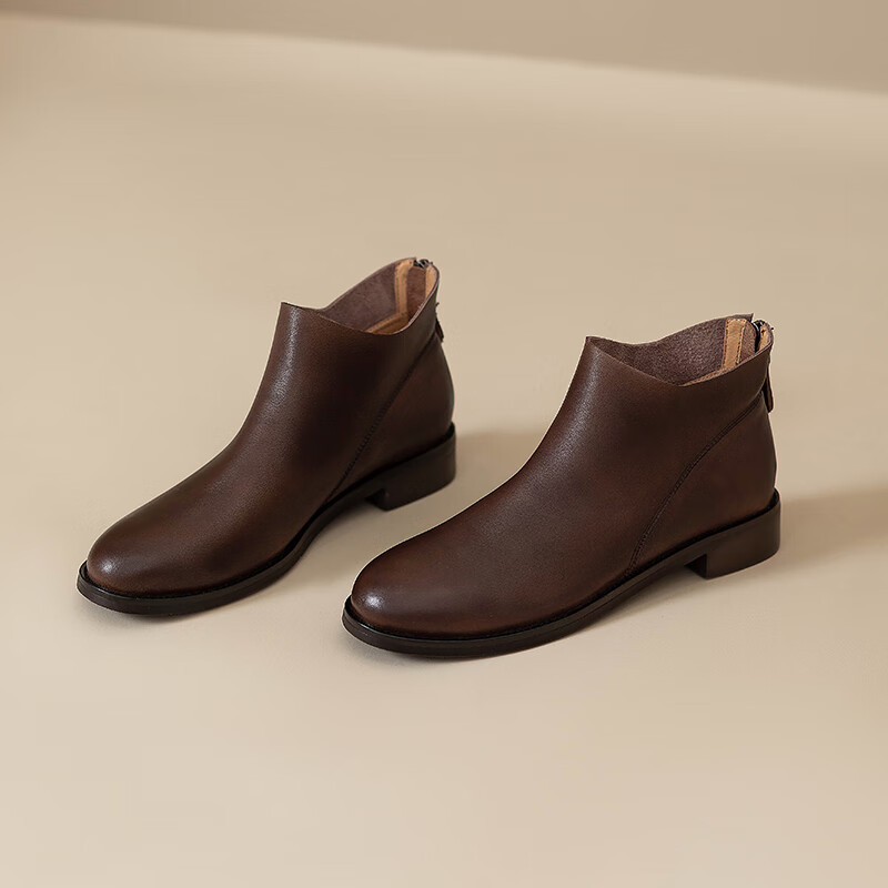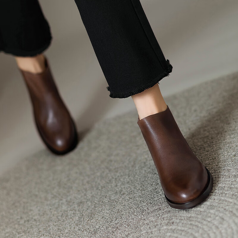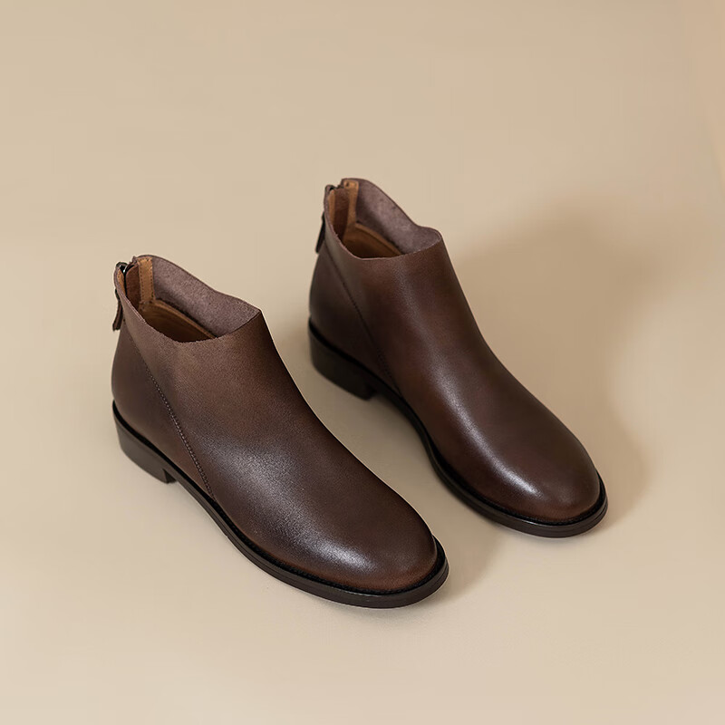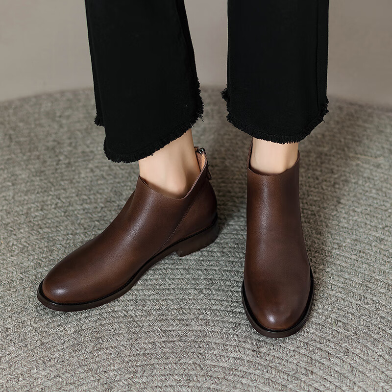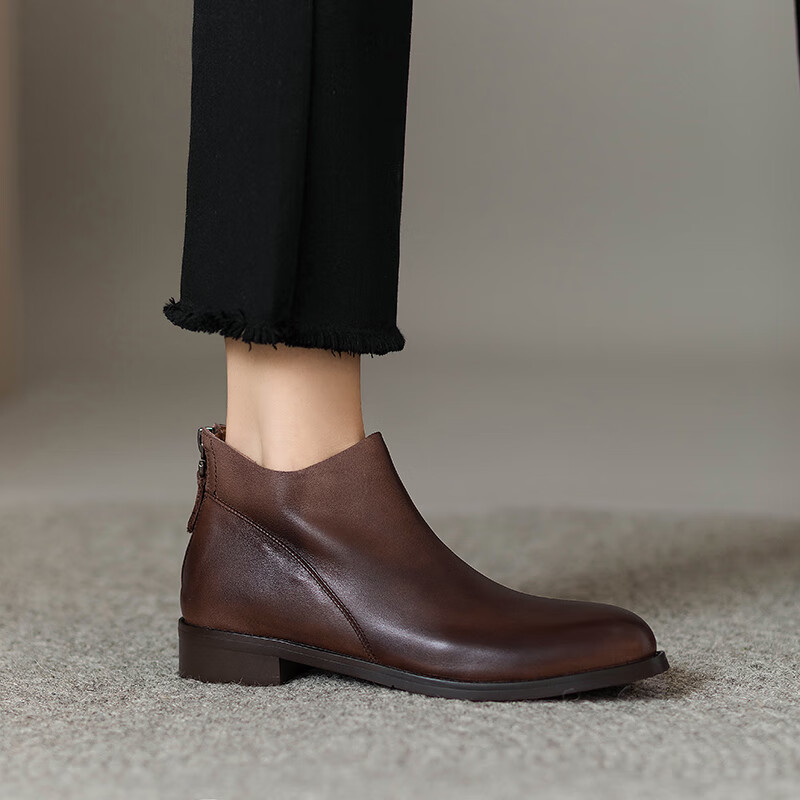 Belle's high-end super soft genuine leather flat-soled French style ankle boots for women 2024 spring and autumn retro brown (single lining) 38