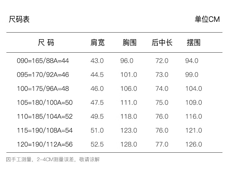 China (cm) 165 / 88-90 170 / 96-98 175 / 108-110 180 / 118-122 185 / 126-130