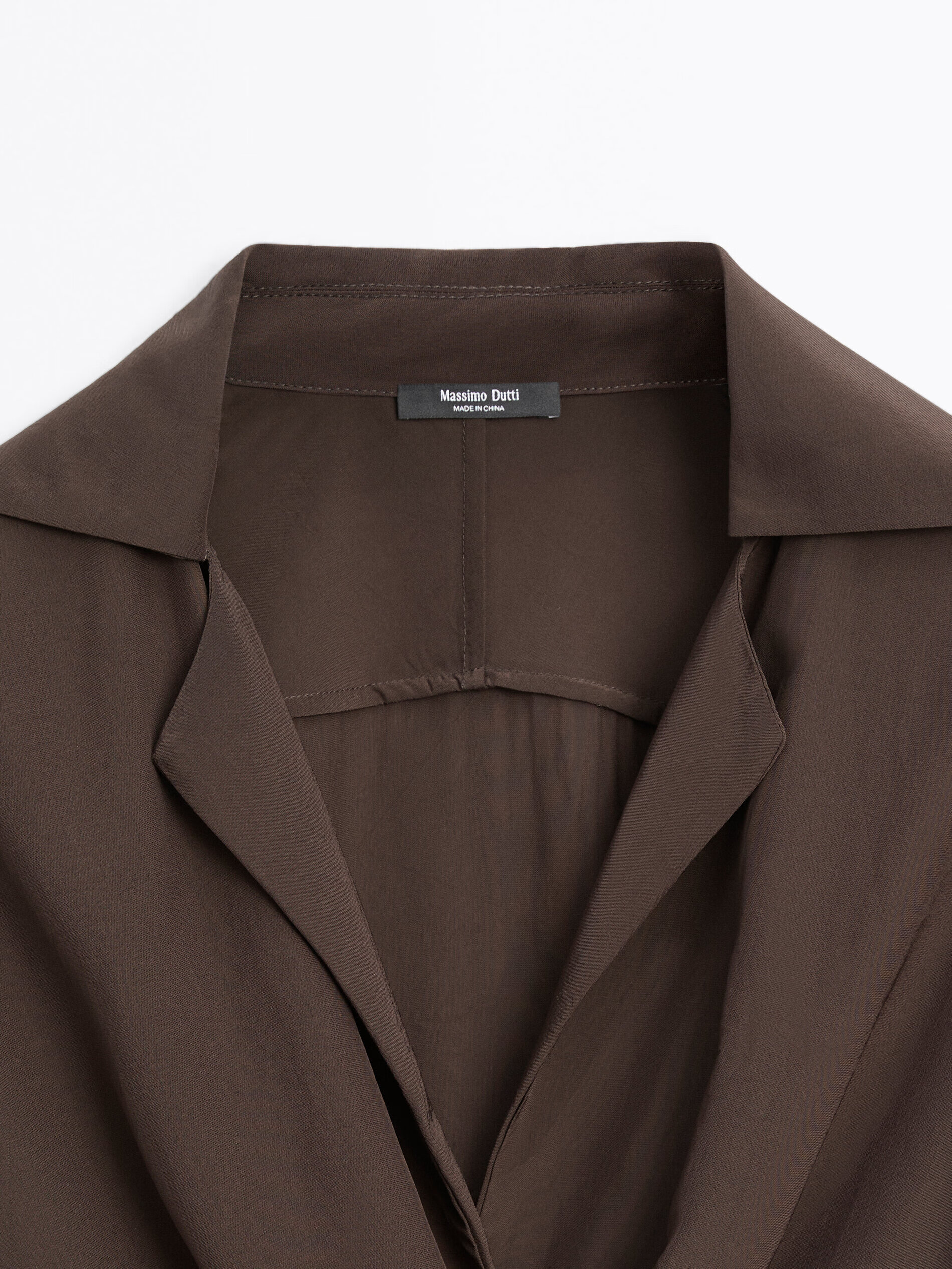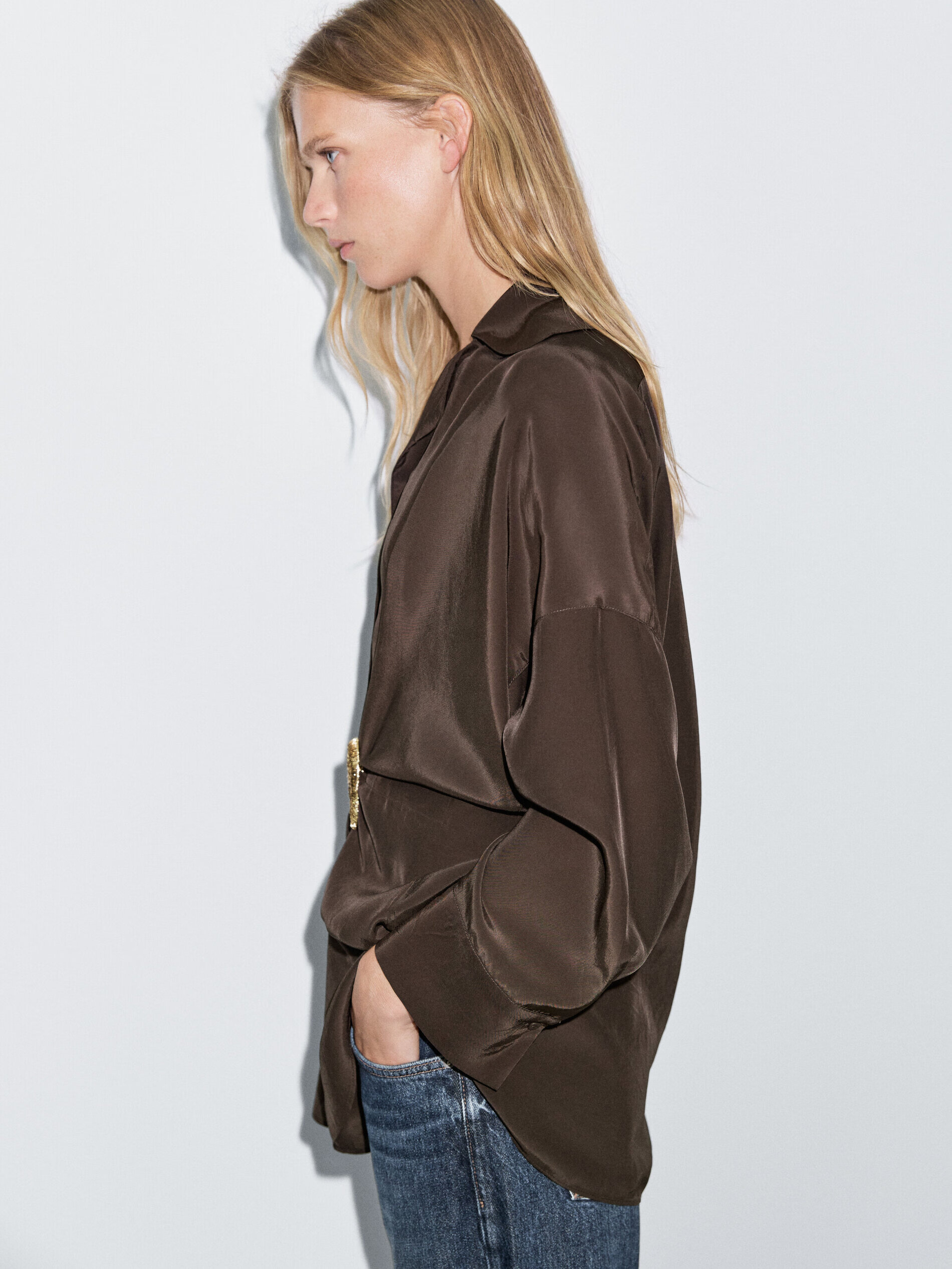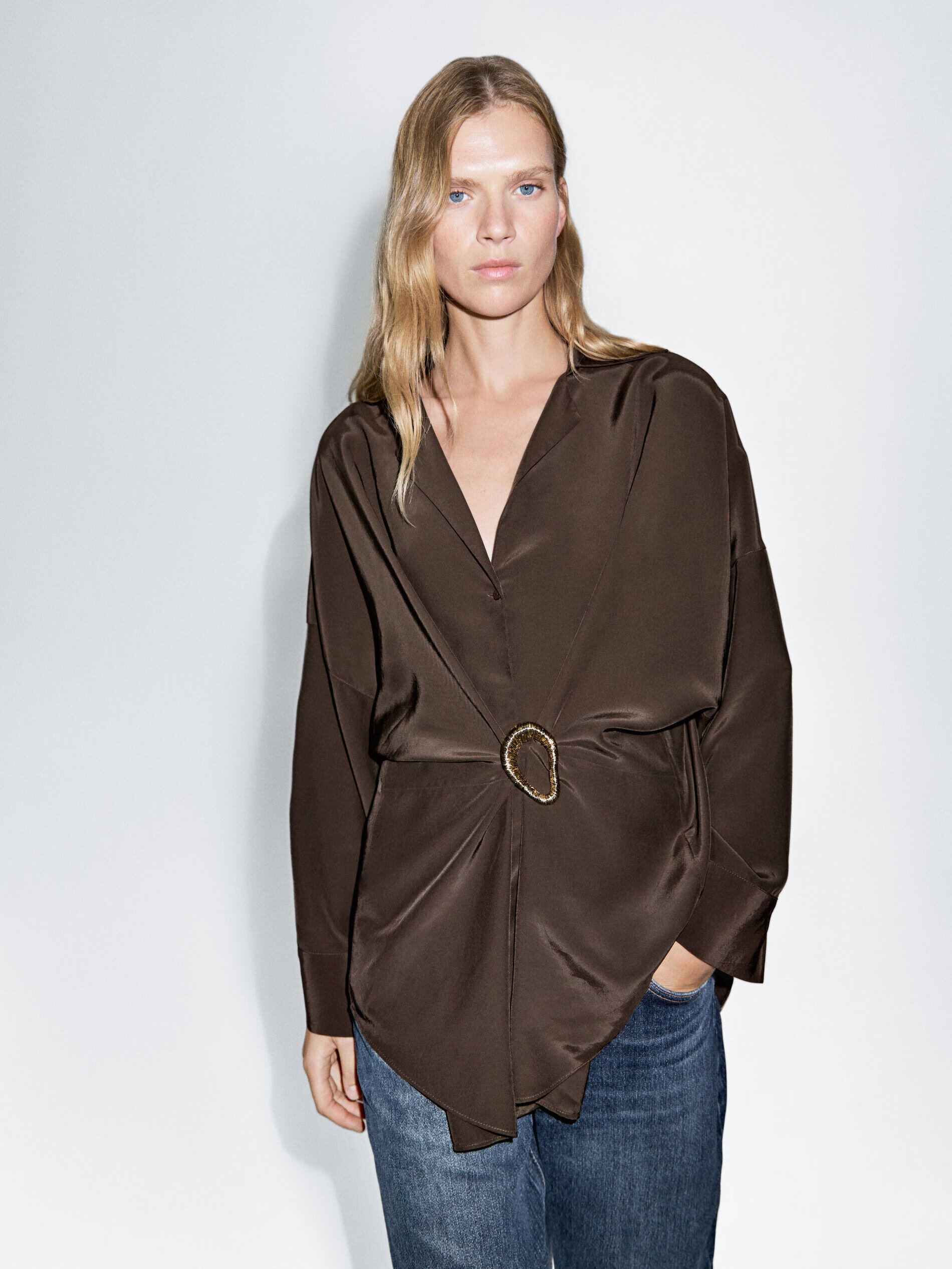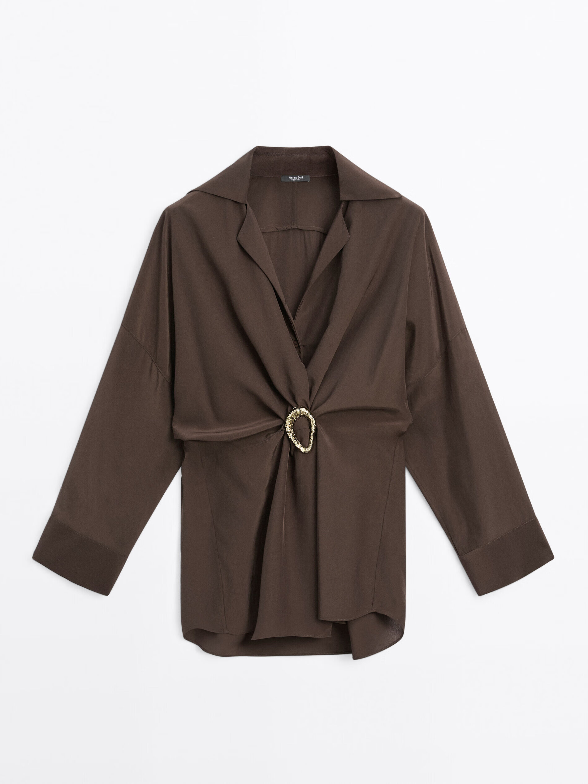 Massimo Dutti Discount Upgrade 2026 Women's French Elegant Temperament Brooch Waist Long Shirt Long Sleeve 05135695 Chocolate M -L (CN 175/96A)