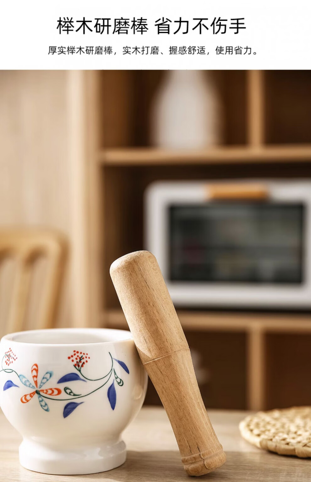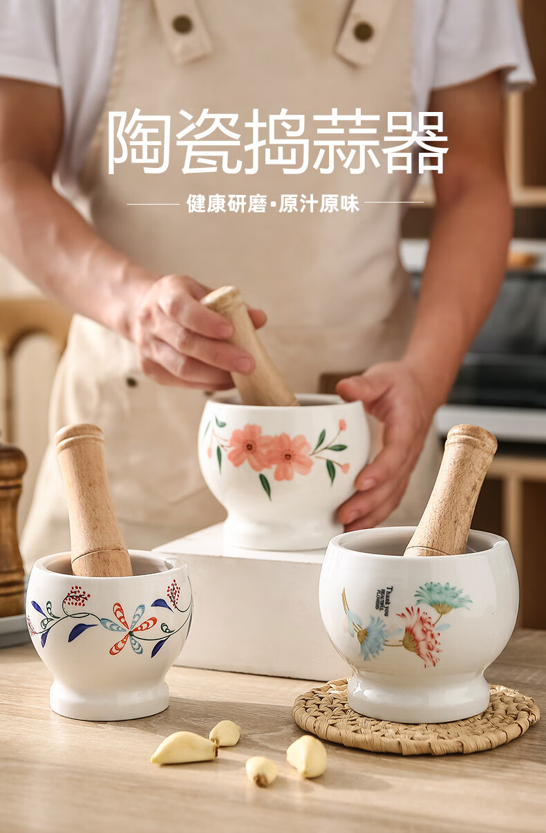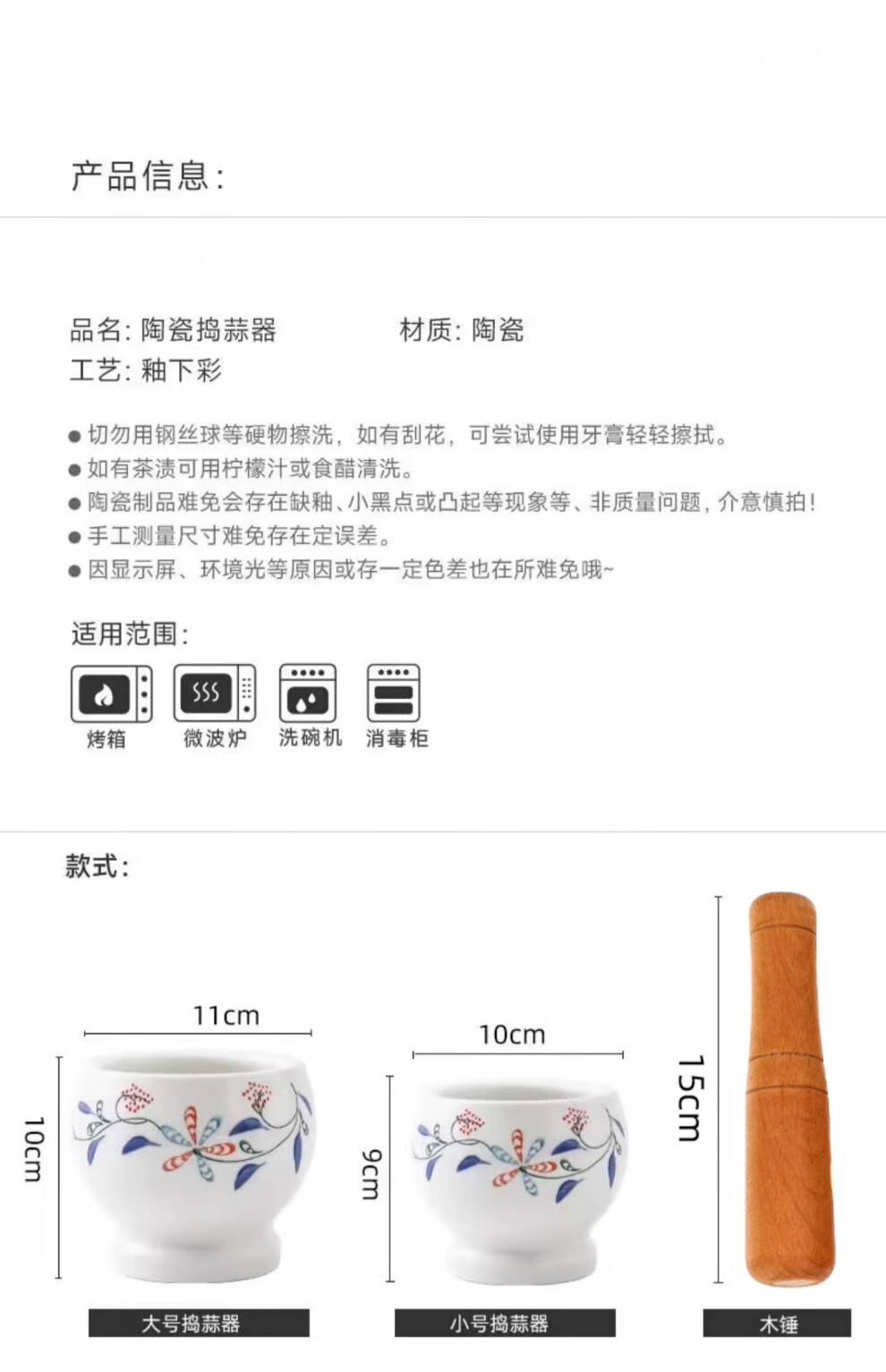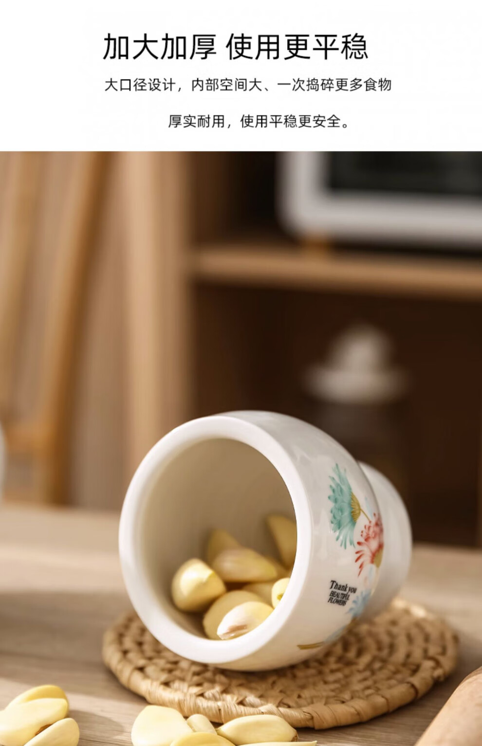 Blue garlic mortar, household ceramic garlic pounder, manual old-fashioned garlic pounding mortar, stone mortar, garlic paste jar, medicine grinder, blooming flowers, blue flower, small garlic pounder