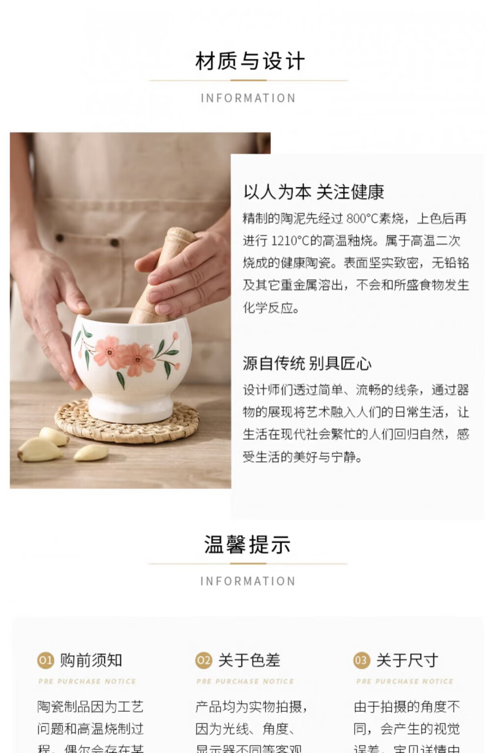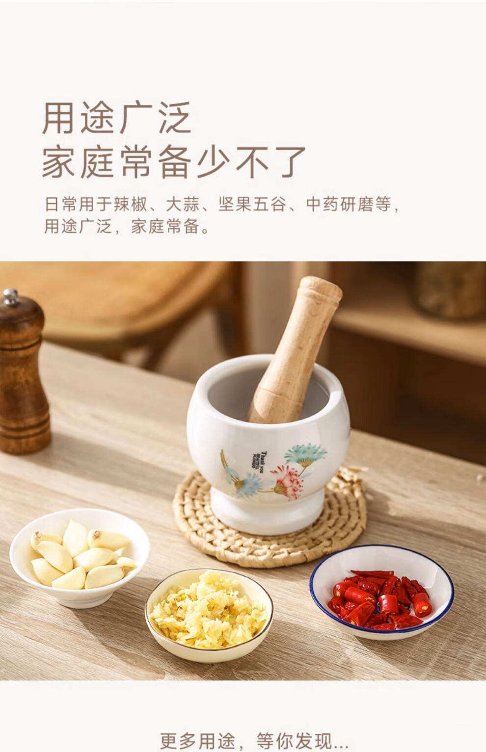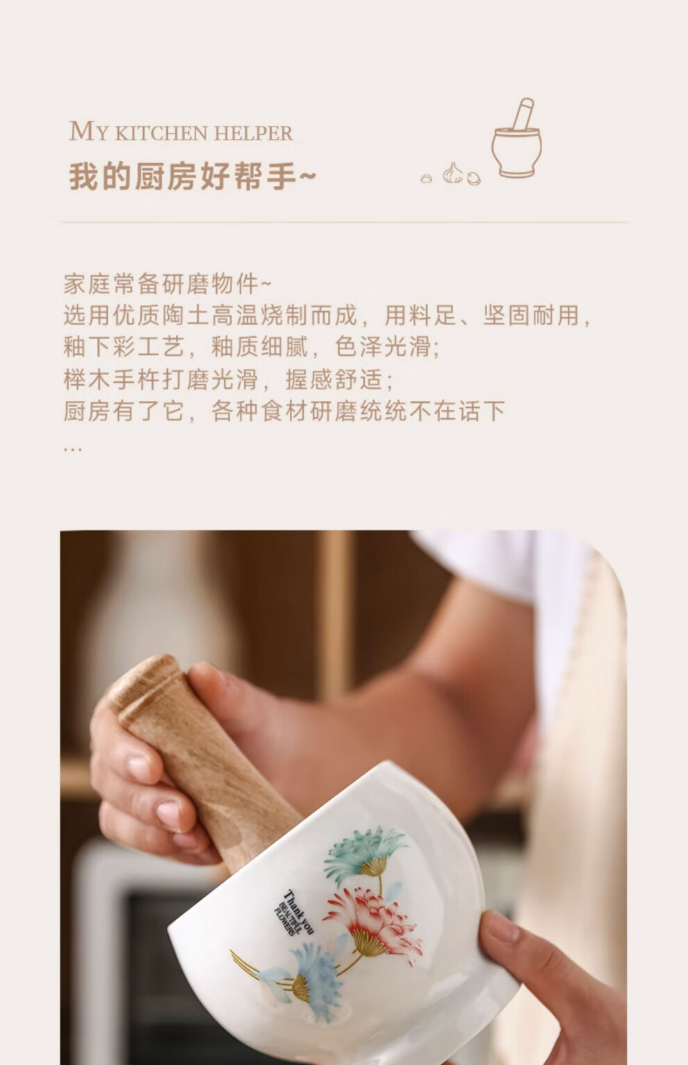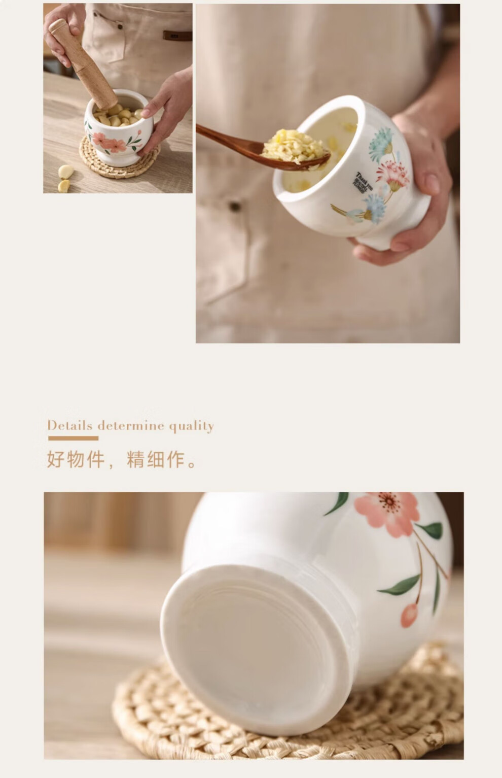 Blue garlic mortar, household ceramic garlic pounder, manual old-fashioned garlic pounding mortar, stone mortar, garlic paste jar, medicine grinder, blooming flowers, blue flower, small garlic pounder