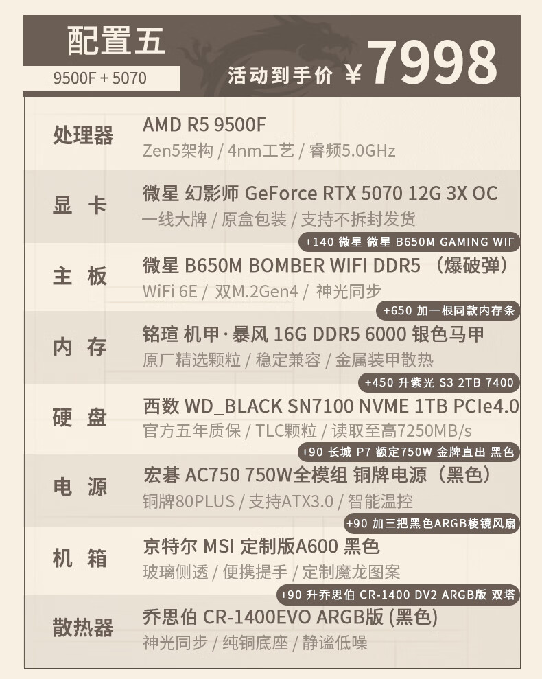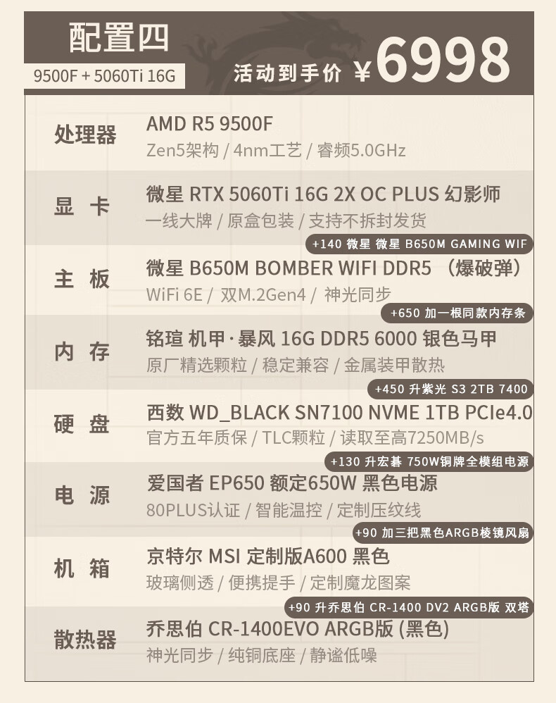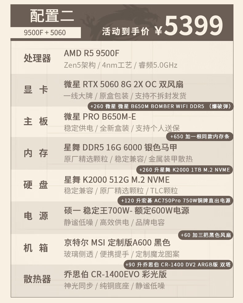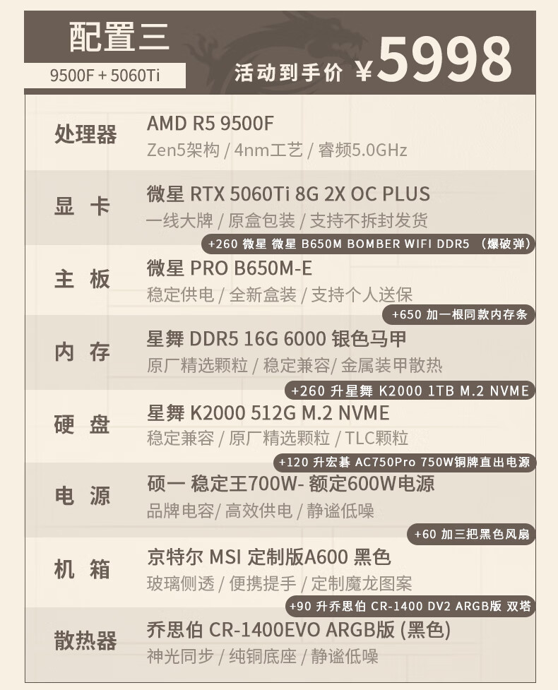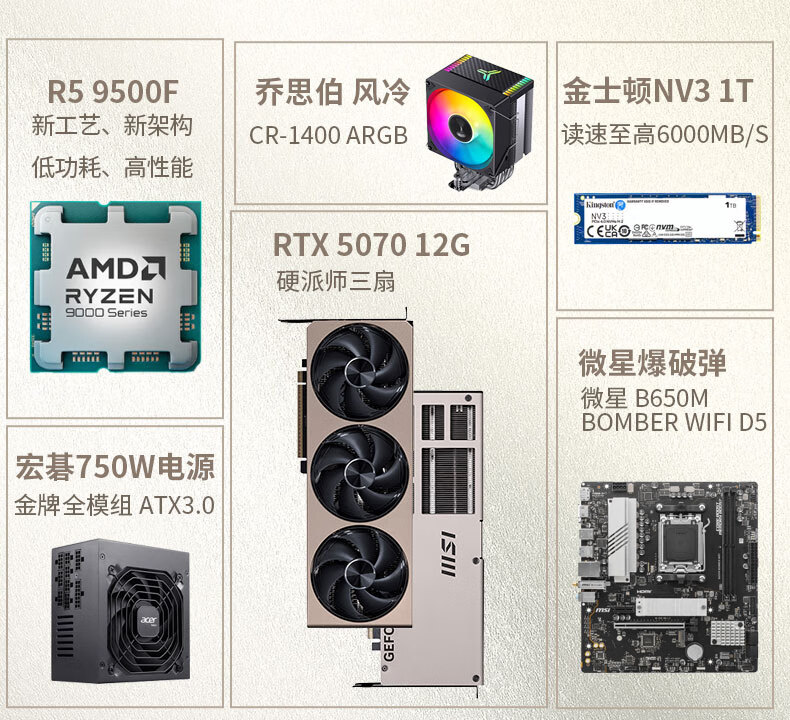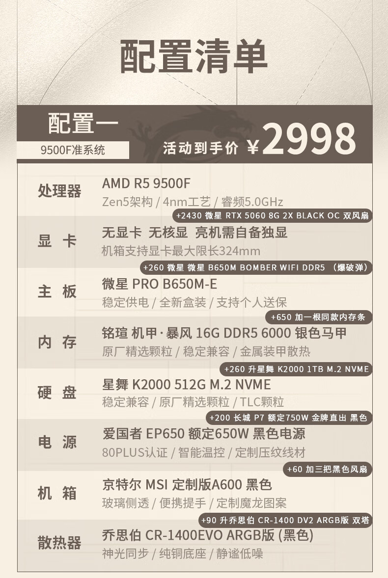 MSI AMD new product Ryzen R5 9500F/RTX5070/5060Ti/5060 graphics card e-sports Delta game DIY host assembly computer design rendering desktop complete machine configuration three丨9500F/5060Ti